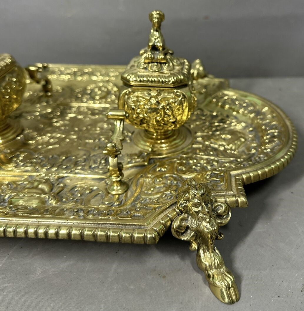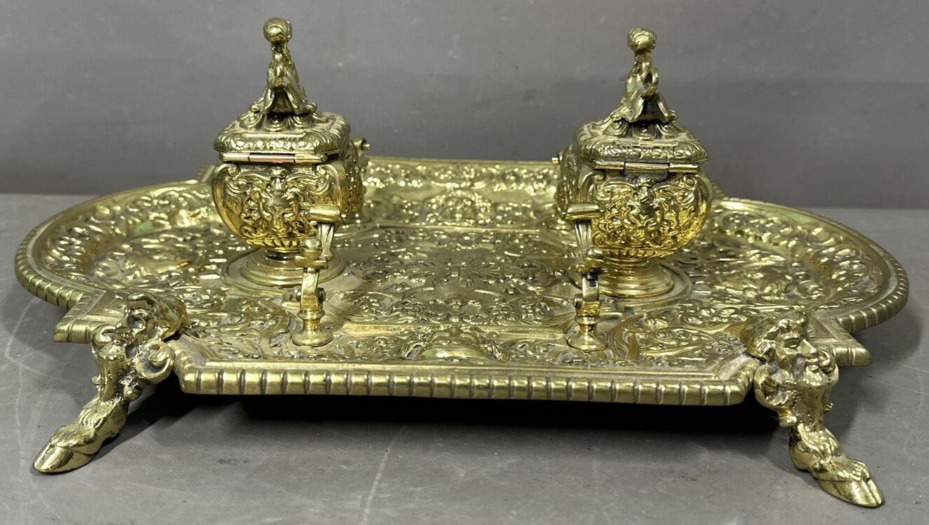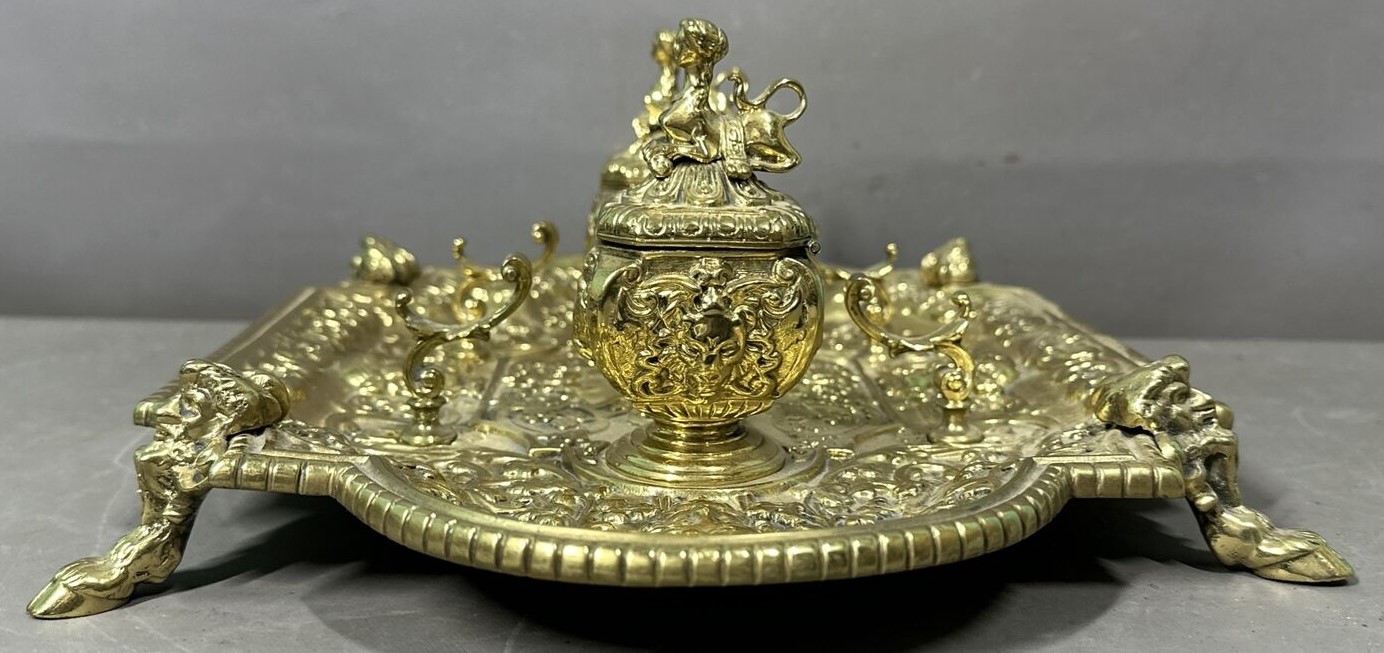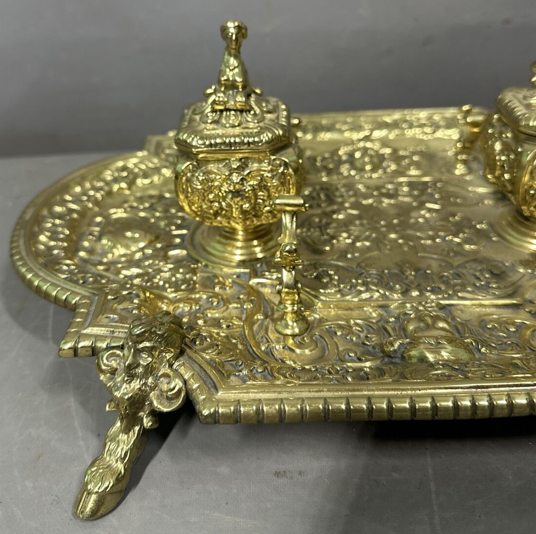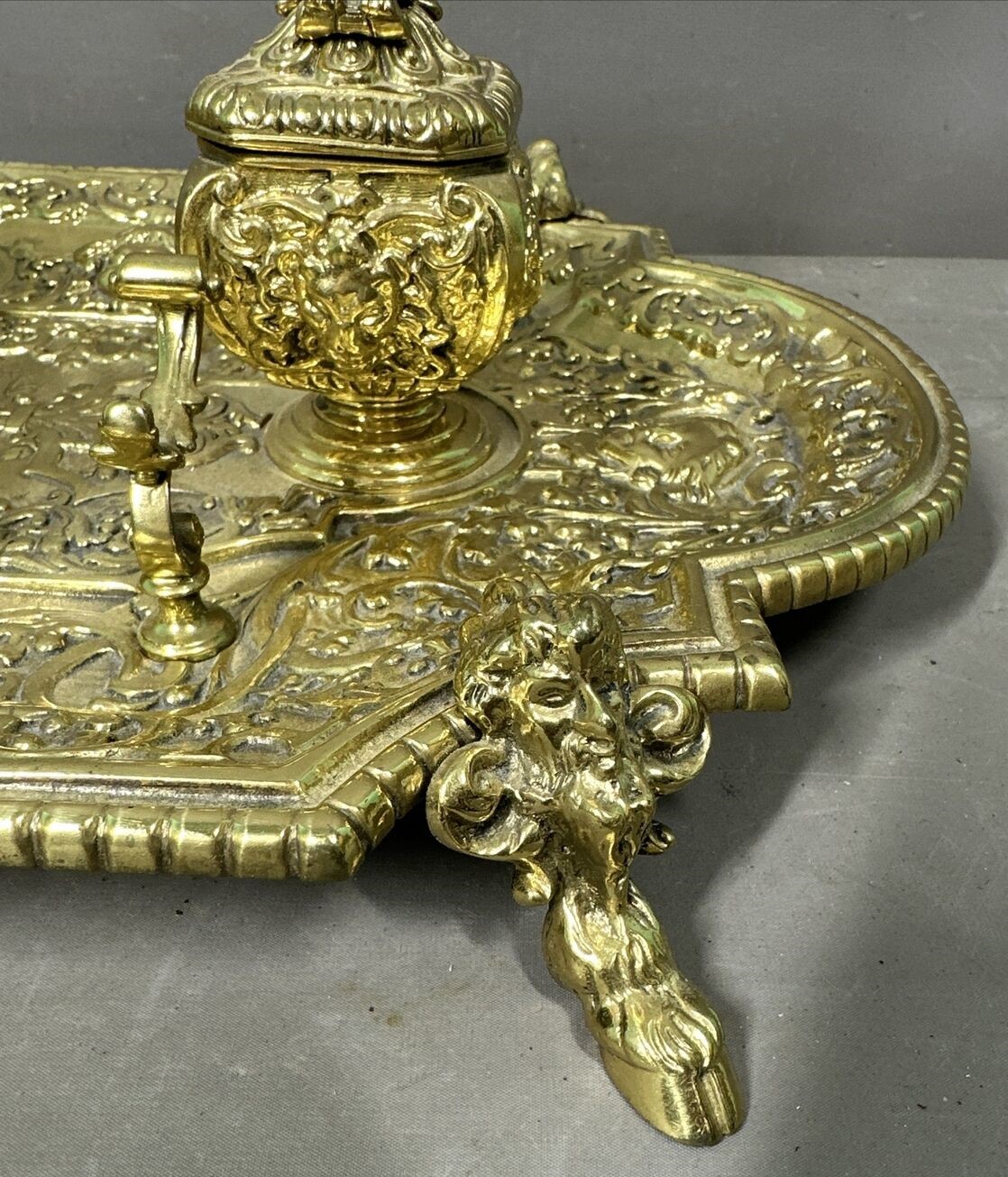 Cast brass double inkwell standish featuring devil faces at the corners and cloven hoof feet. Figures of the Sphinx are the handles for the lids. In the center are the impressed faces of women and two pen holders, oriented for use on a partners’ desk.