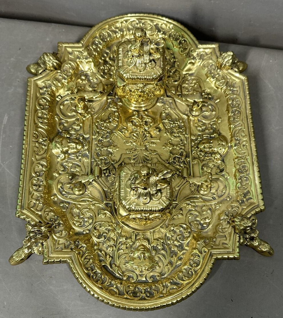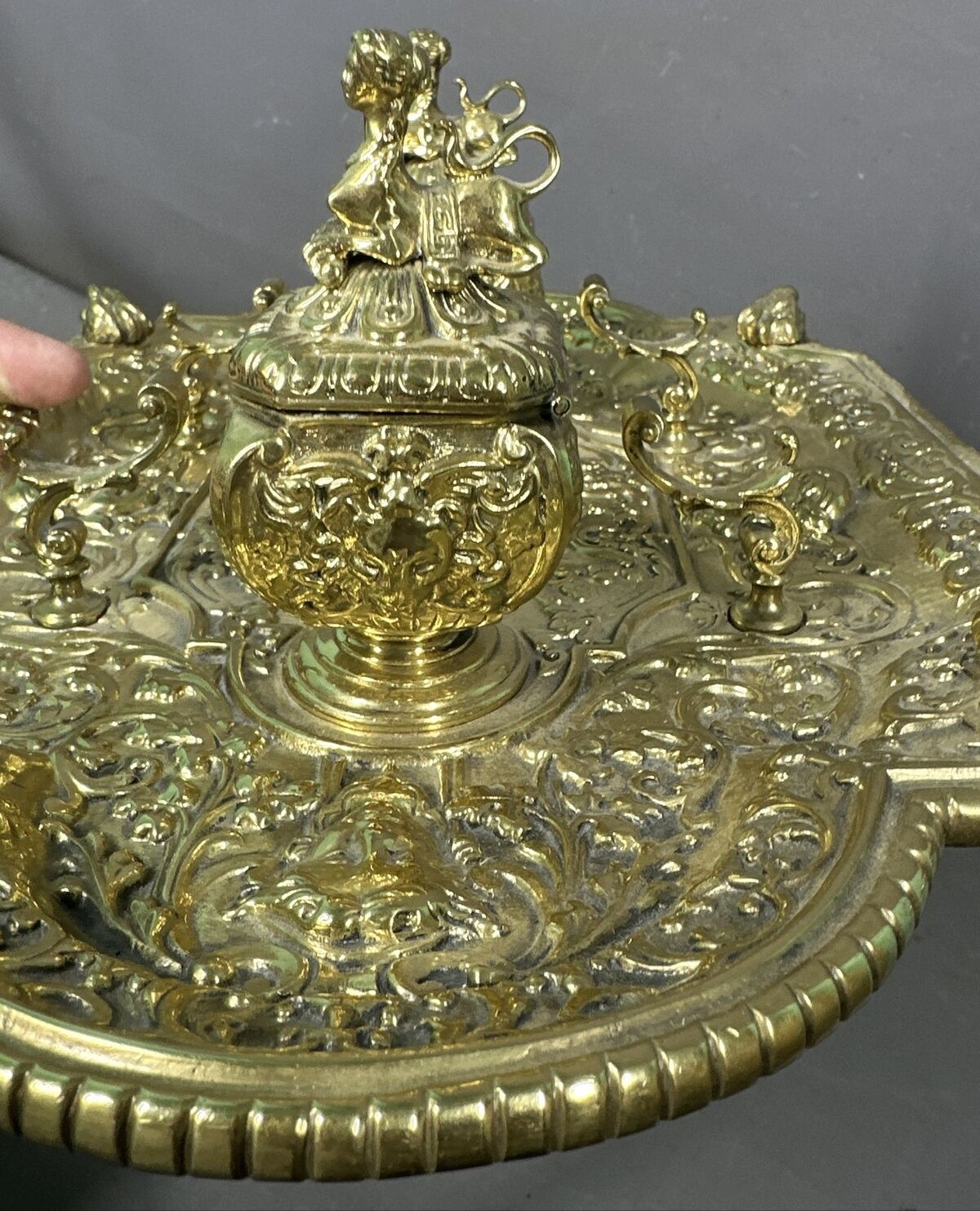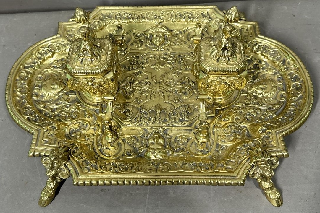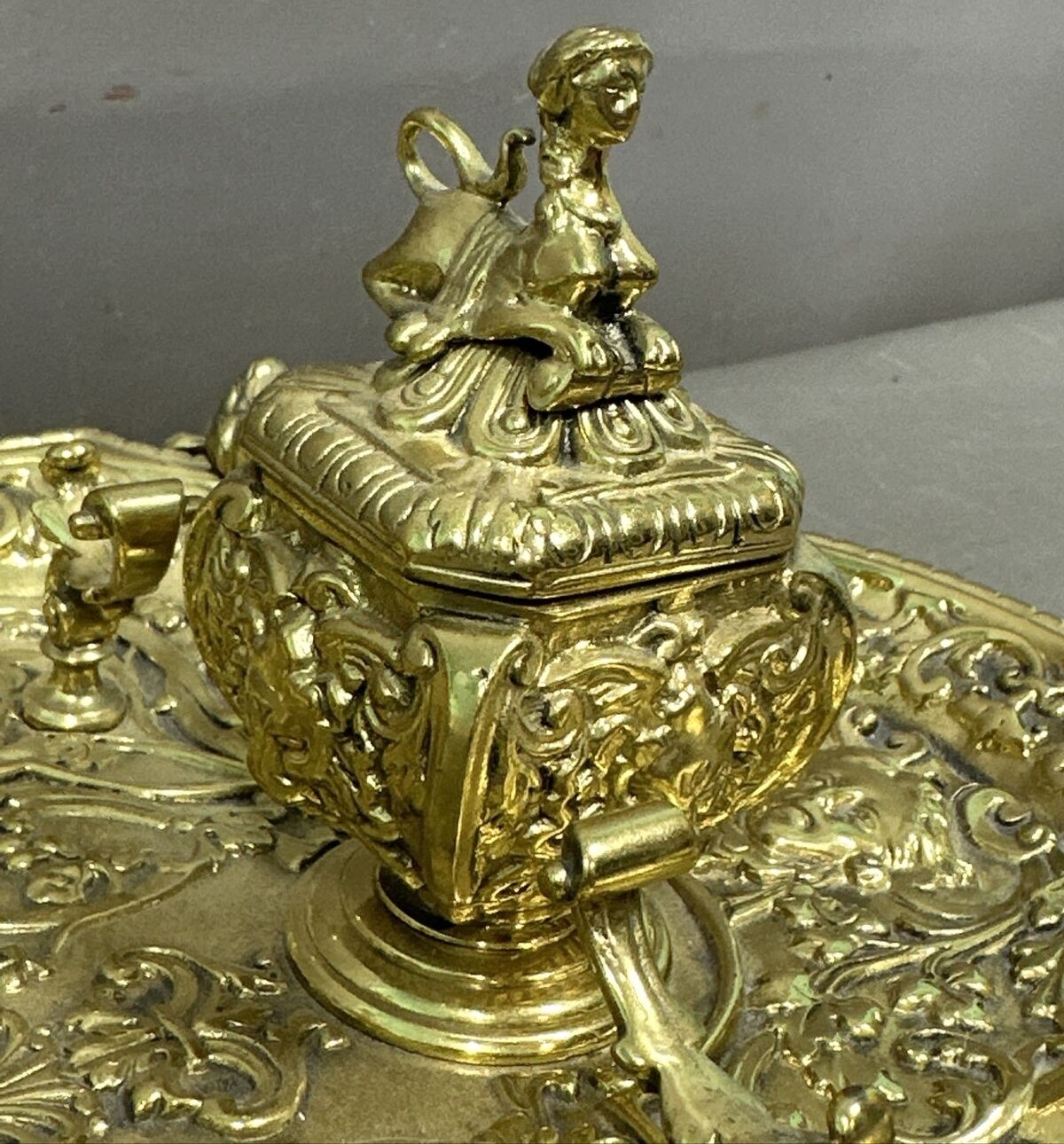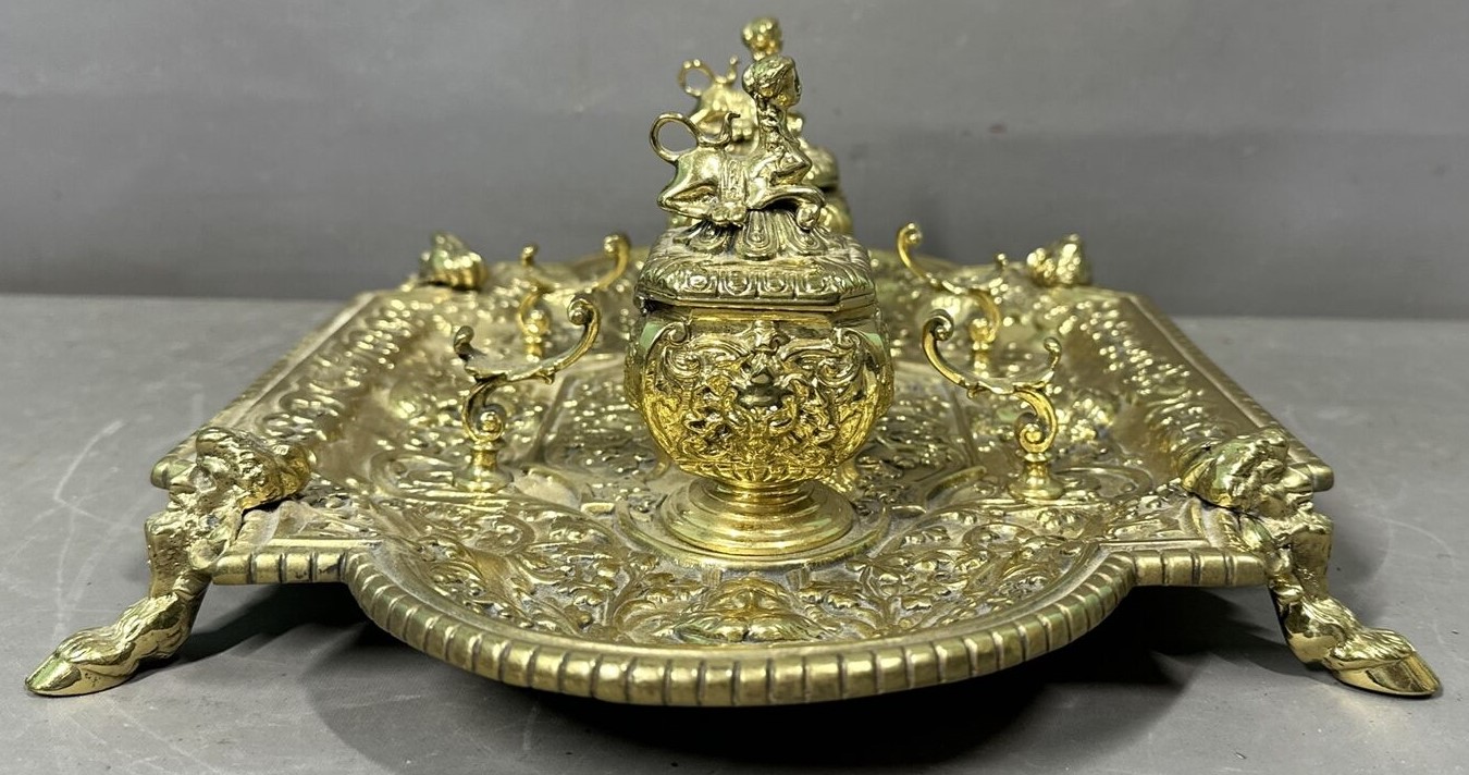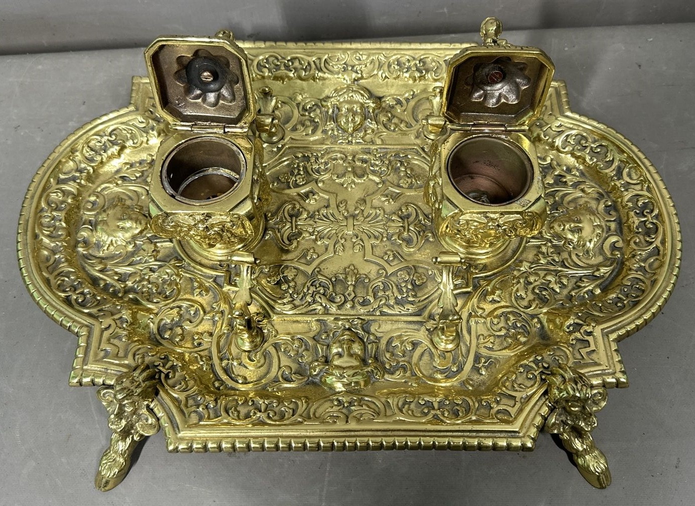Cast brass double inkwell standish featuring devil faces at the corners and cloven hoof feet. Figures of the Sphinx are the handles for the lids. In the center are the impressed faces of women and two pen holders, oriented for use on a partners’ desk.