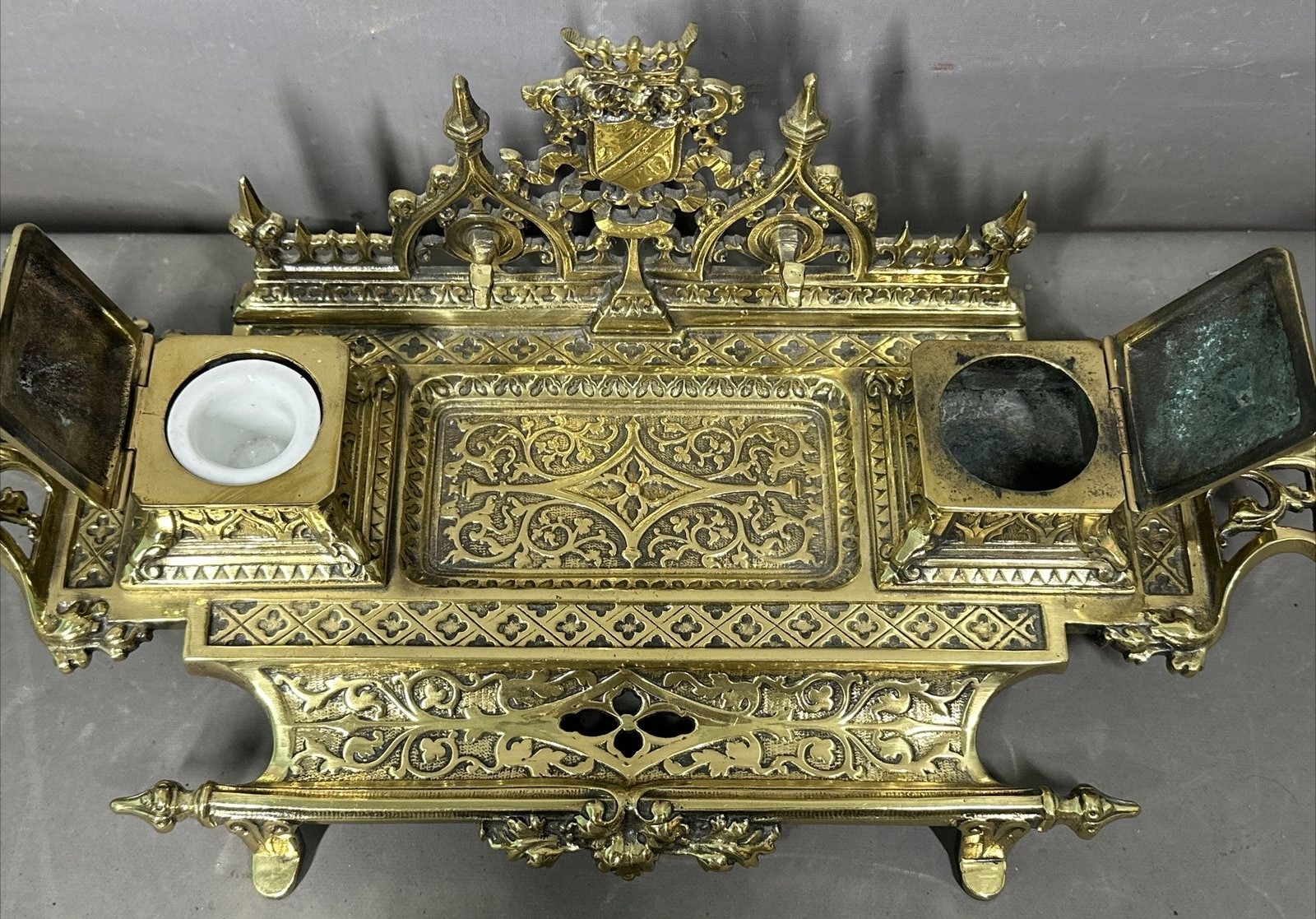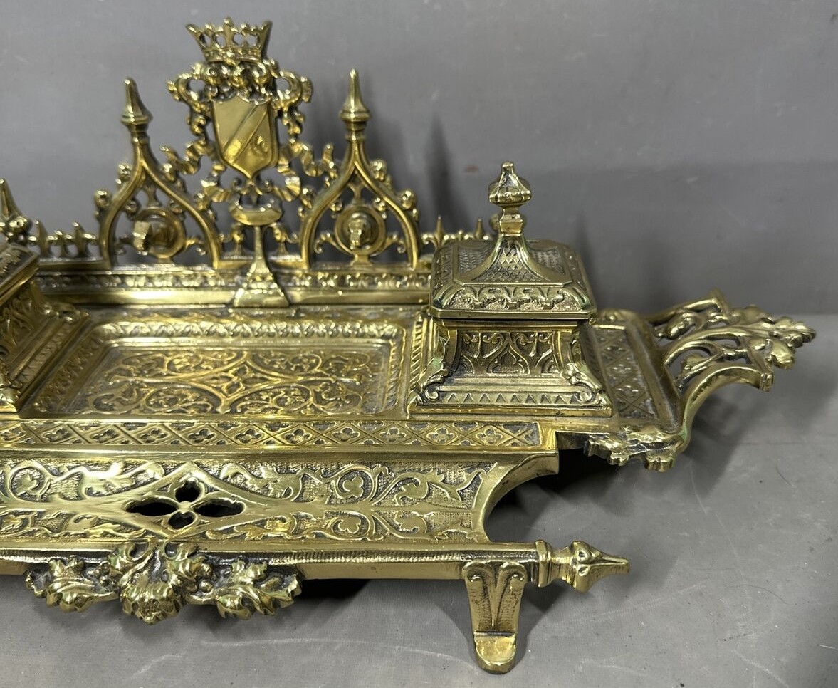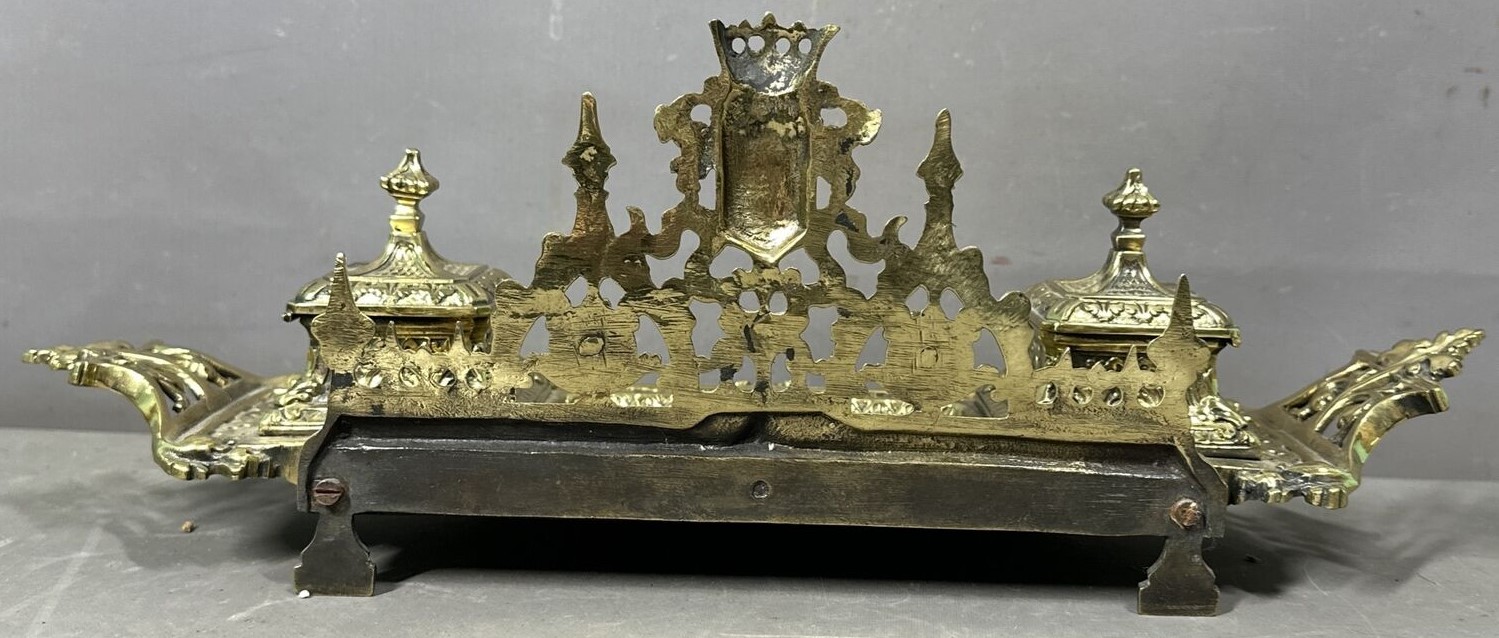 Brass double inkwell standish featuring detailed scrollwork with a crown and shield on the back rail.