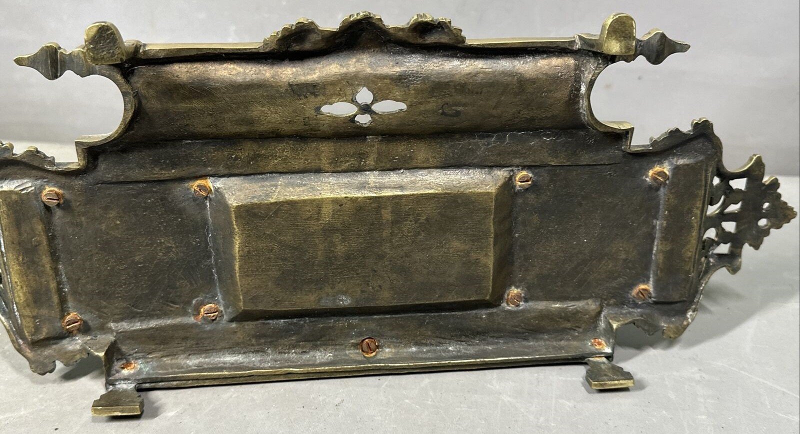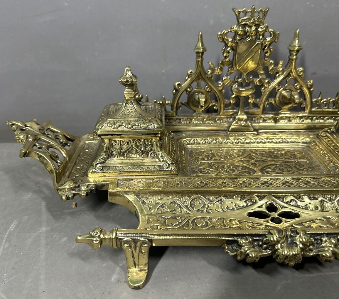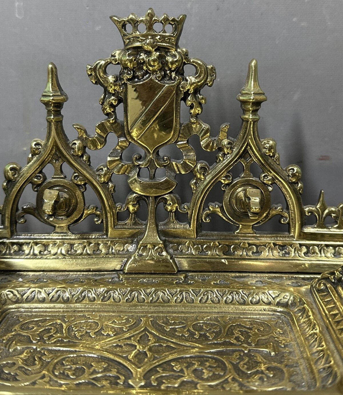 Brass double inkwell standish featuring detailed scrollwork with a crown and shield on the back rail.
