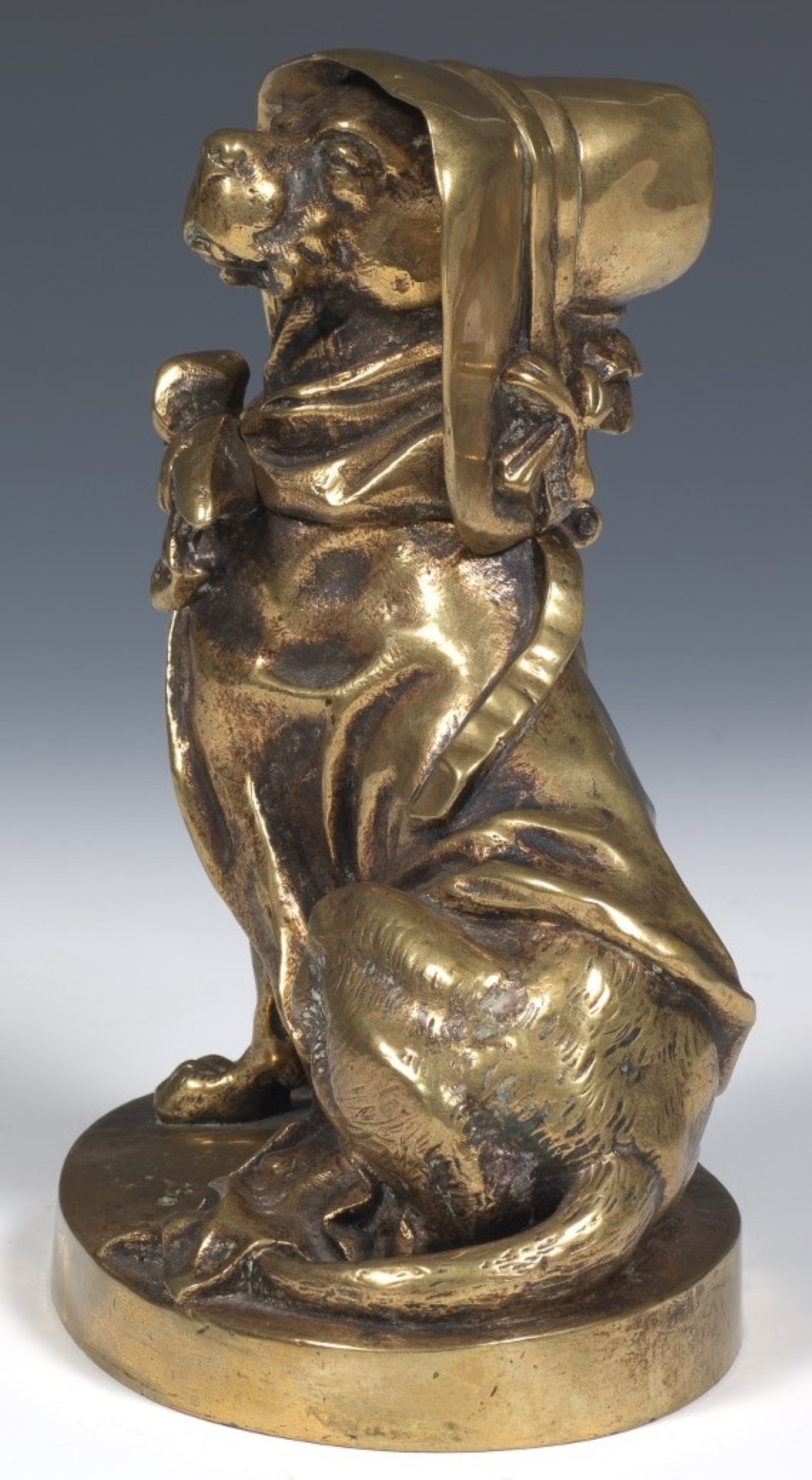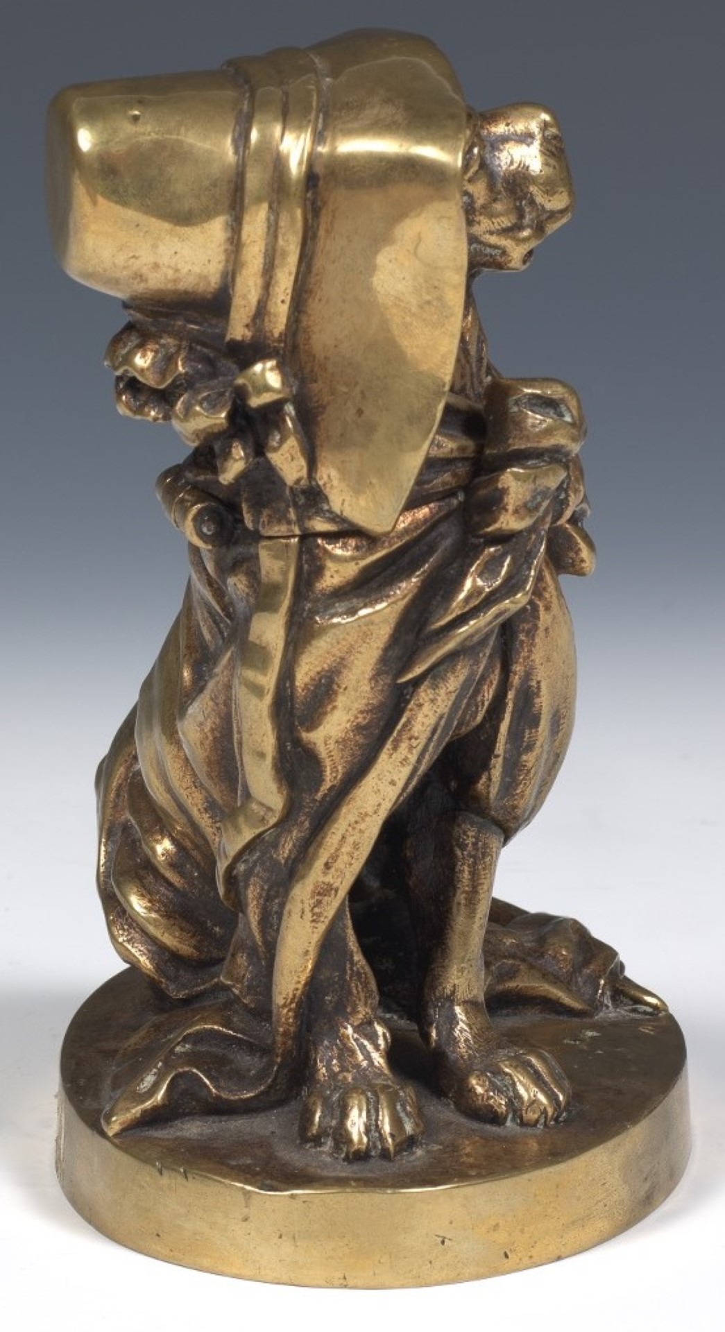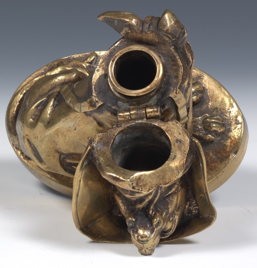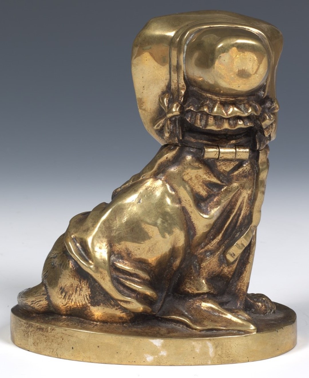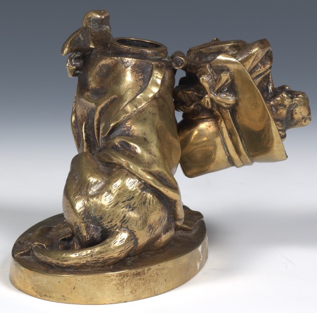 A brass inkstand depicting a sitting hound dog wearing a cape and bonnet tied with a bow. Hinged at the neck to access the brass ink pot.