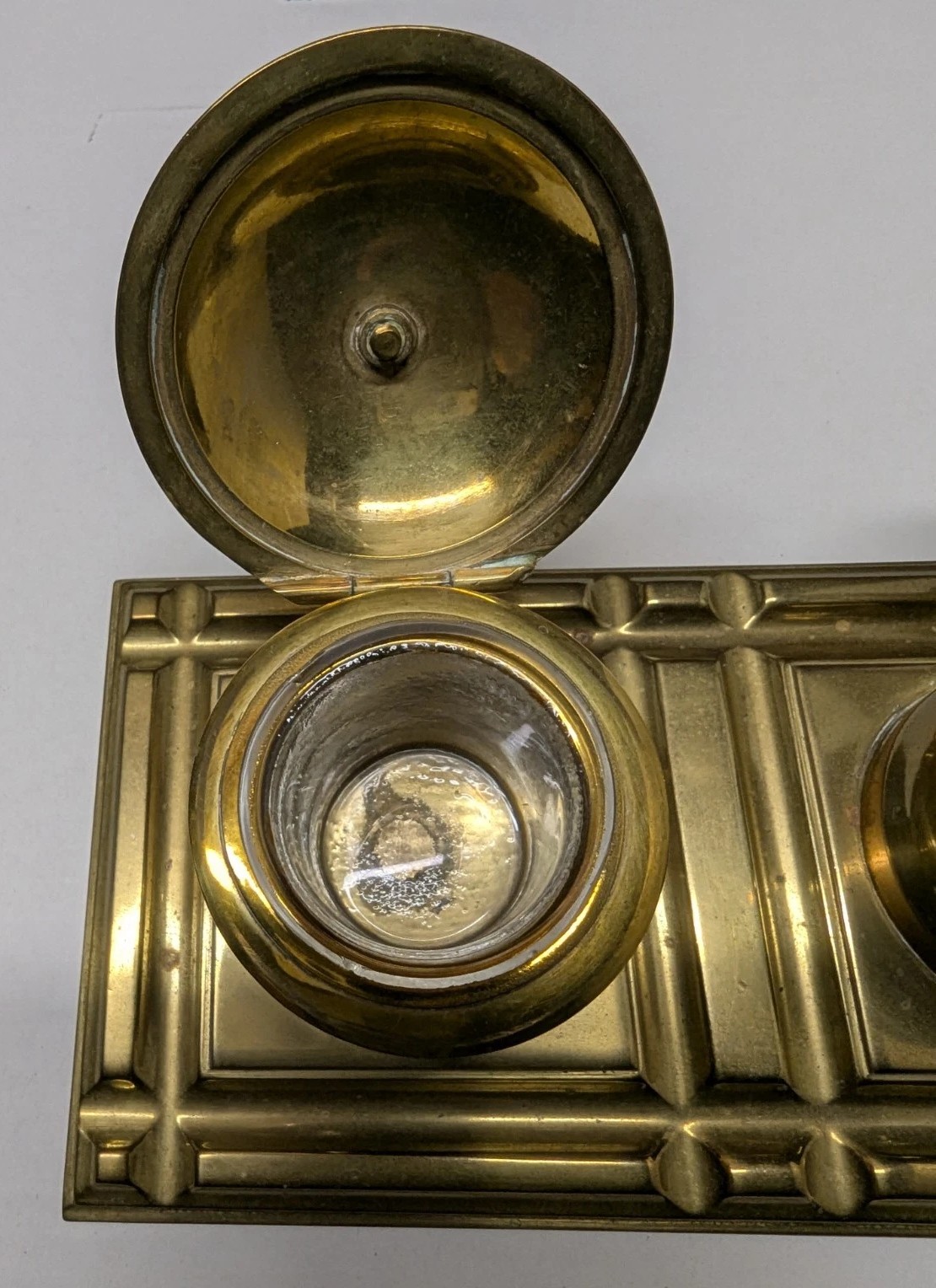 - Inkwells: Two circular, tapered brass inkwells are seated symmetrically on the left and right sides of the base.