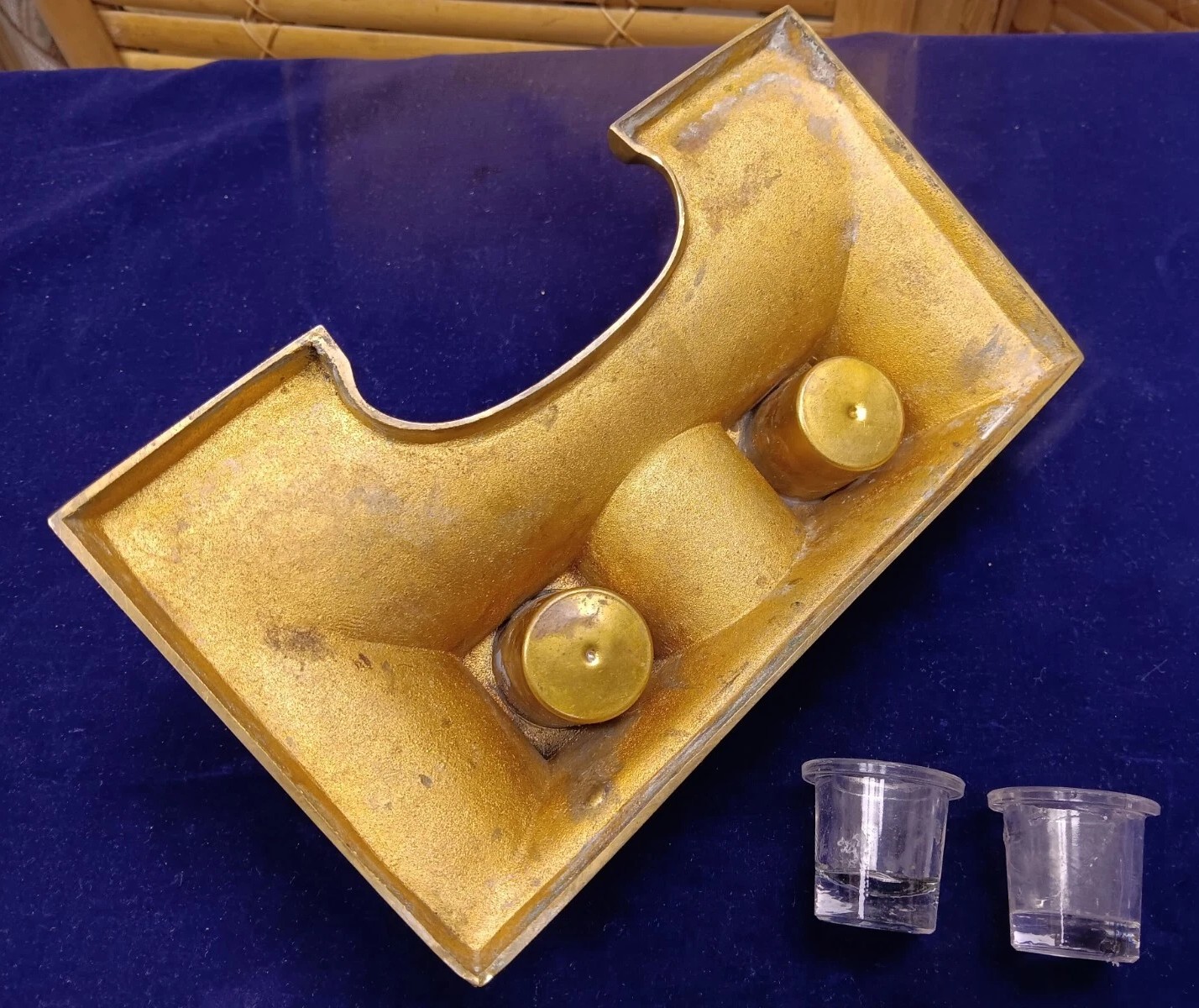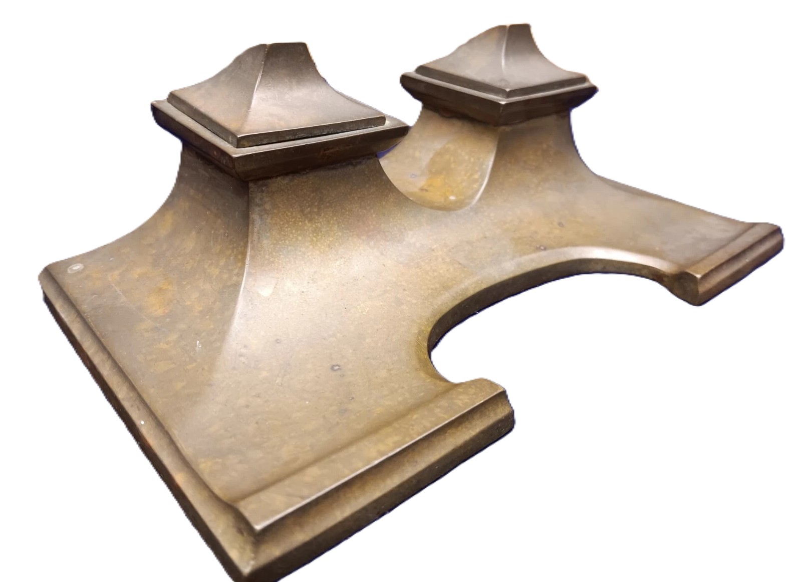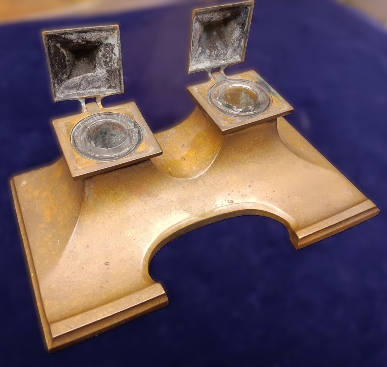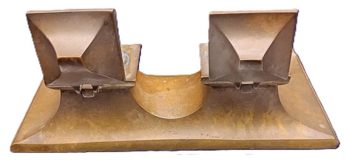 This is a double inkstand made of cast brass. It features two inkwells with hinged lids that are pyramidal in shape, with four sides that converge at a central finial on top. The inkwells are spaced apart by a central “U”-shaped valley.