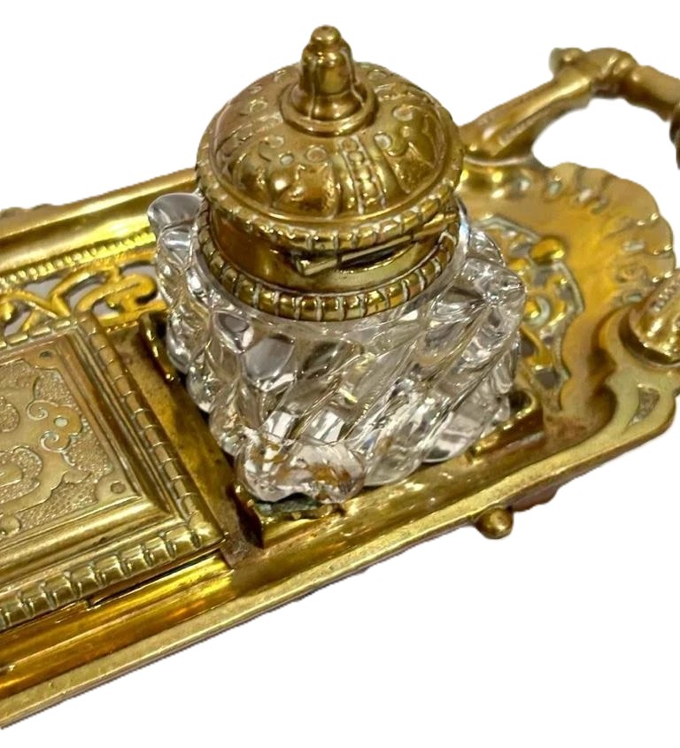 • Inkwells: The set features two square-based, clear swirl-cut glass inkwells. Each is topped with a hinged brass lid decorated with a gadrooned (fluted) pattern and a tiered finial.