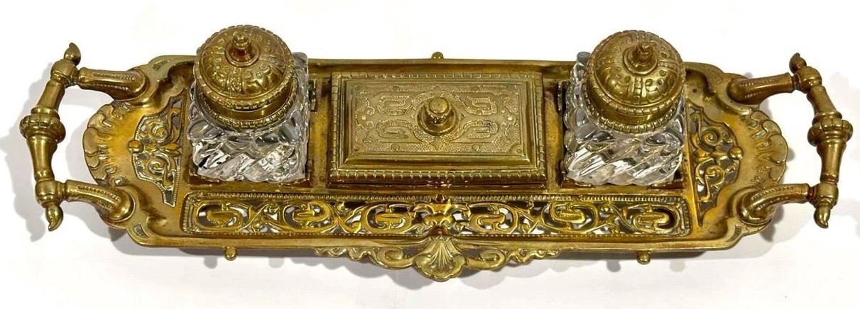 • Central Compartment: Between the two inkwells sits a rectangular stamp box or “nib caddy.” The lid of this central box is hinged and features an embossed pattern that matches the pierced design of the base tray.