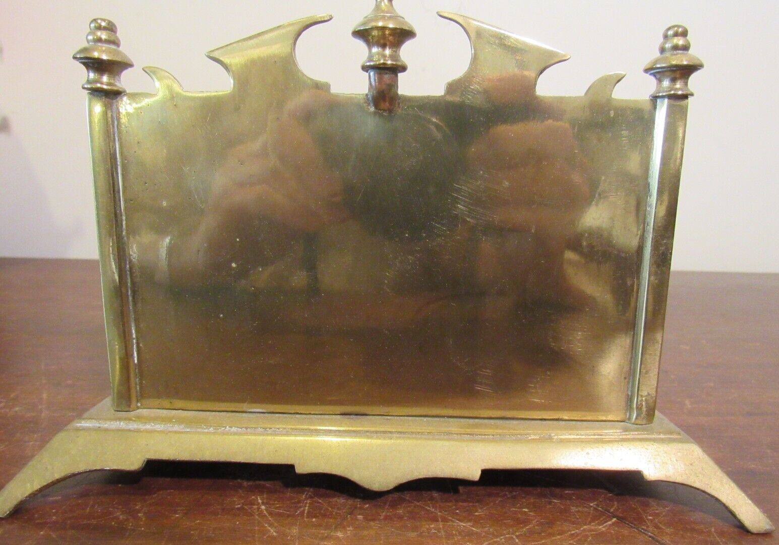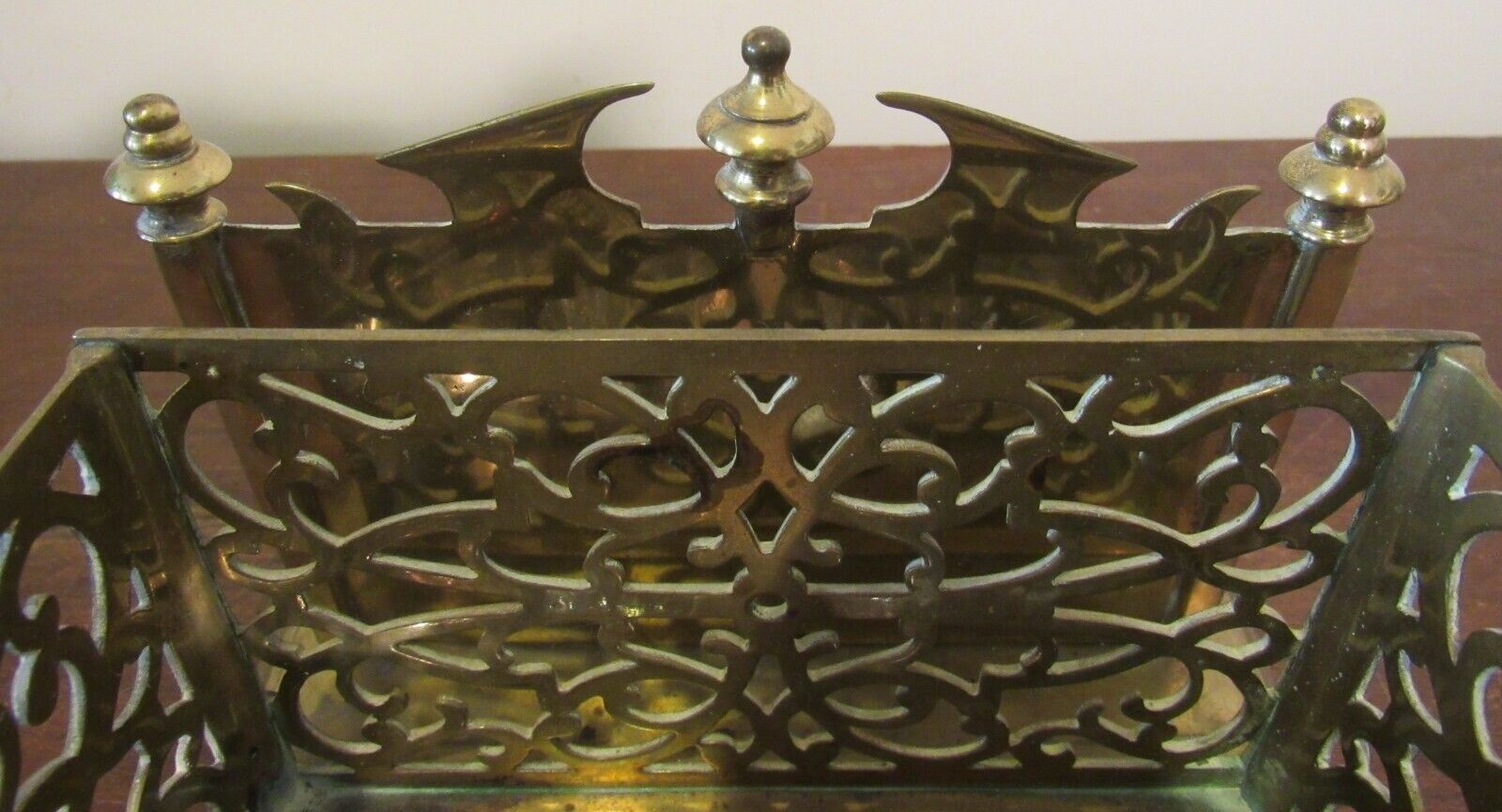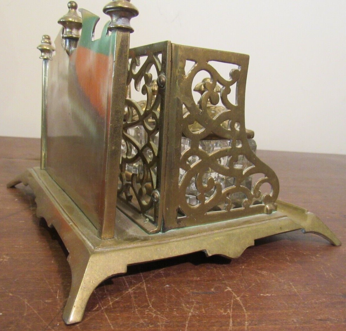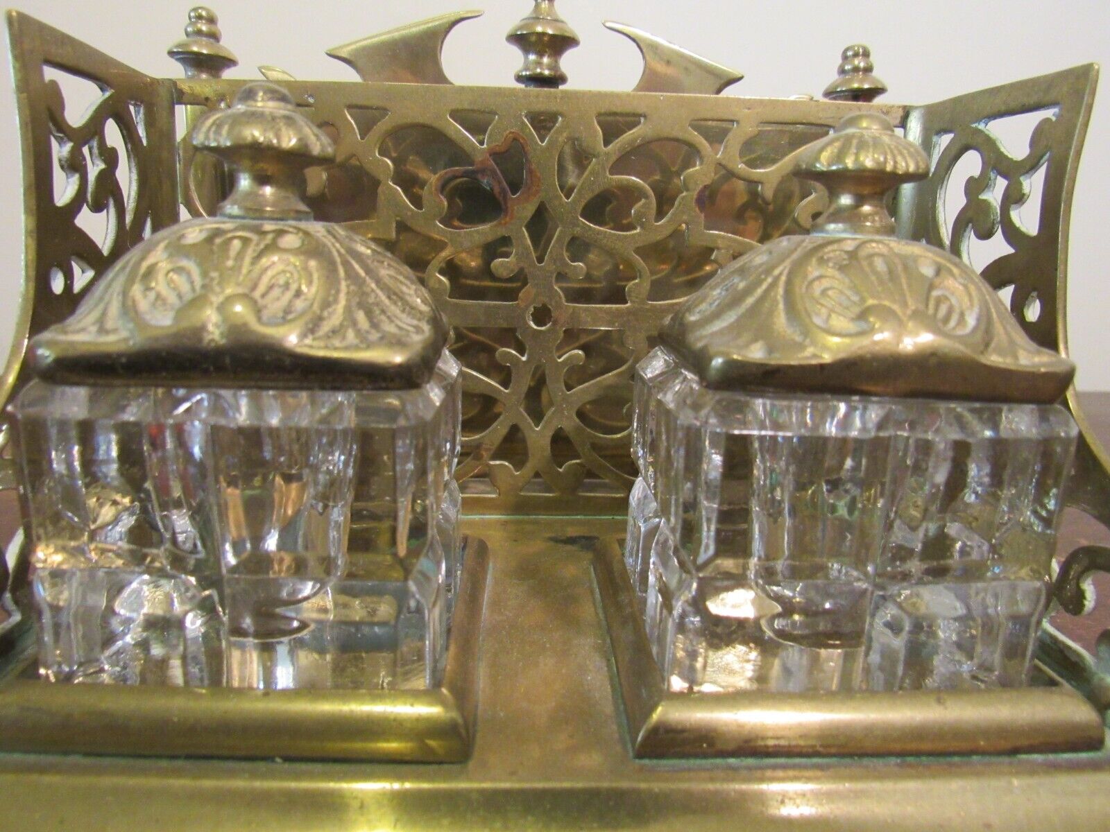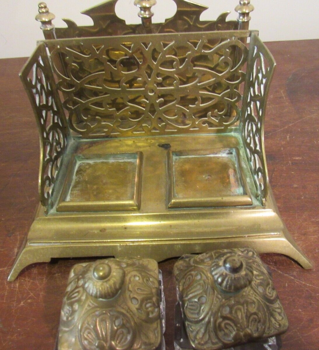 Brass inkstand with two glass inkwells with decorative unattached lids. The stand has an elaborate design featuring cut-out patterns and curves. In the front is a pen channel, and in the rear a letter holder.
