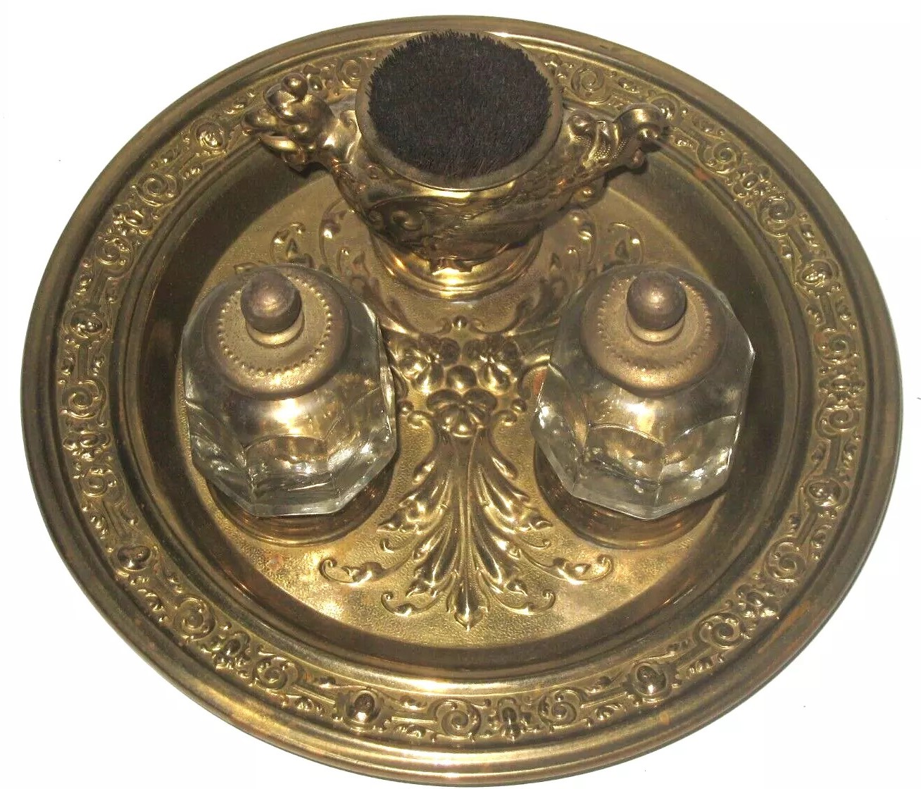 This inkstand features a stamped sheet brass tray, saucer-shaped with intricate patterns and raised edges. The tray holds two pressed glass inkwells with pegged bottoms, each designed with eight facets, giving them an octagonal shape. The inkwells’ lids have ball finals. Completing the inkstand is a pen wipe held within an urn-shaped holder, crafted in the form of a stylized griffin. Italian Renaissance style.