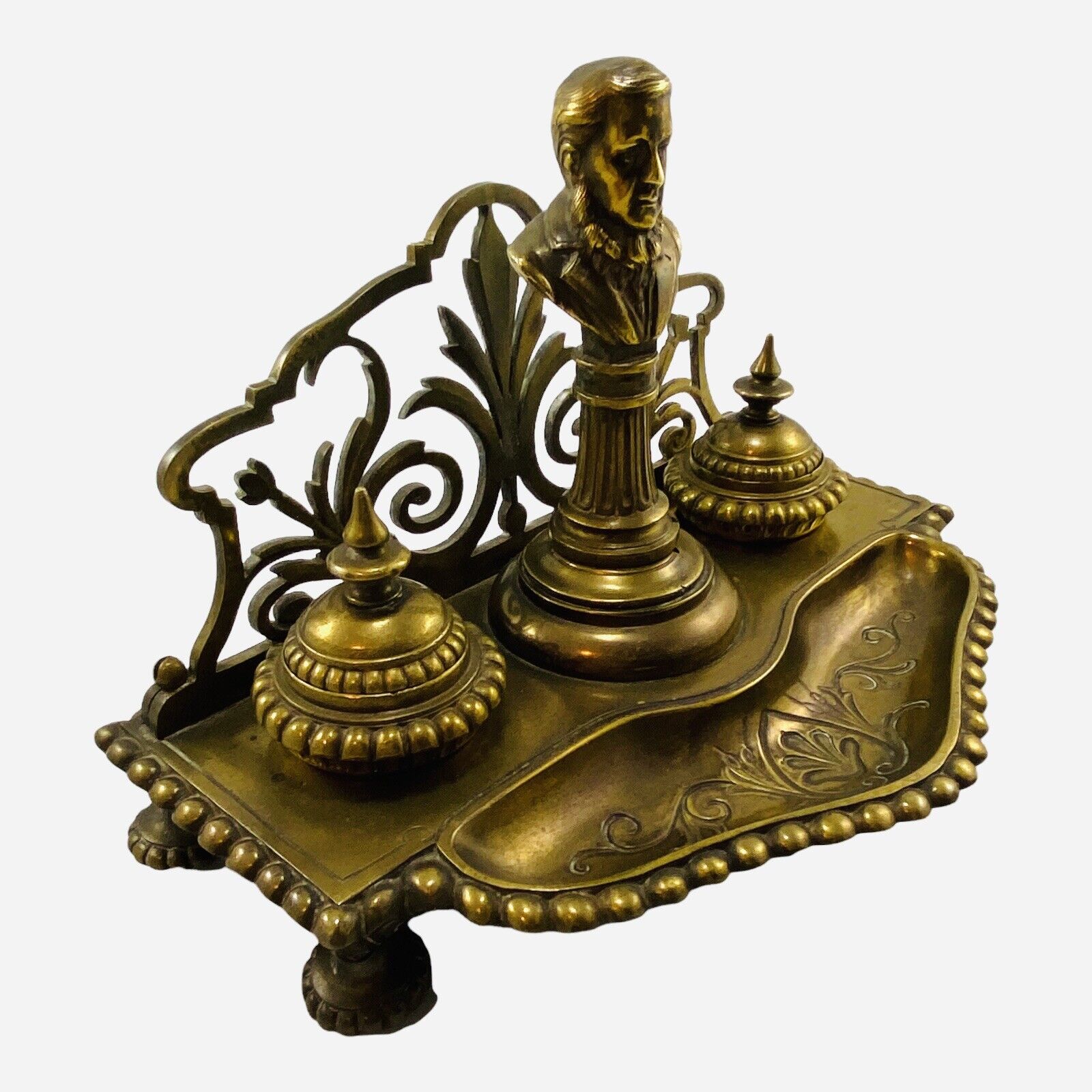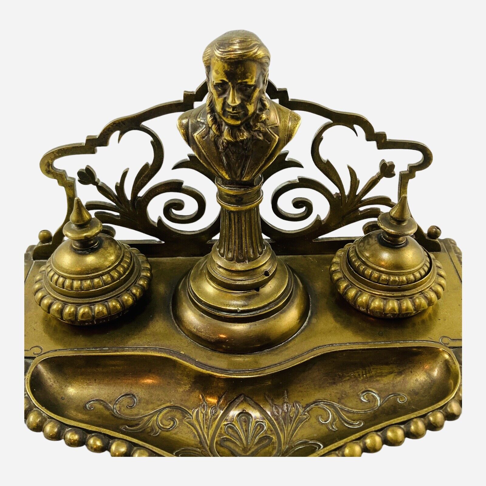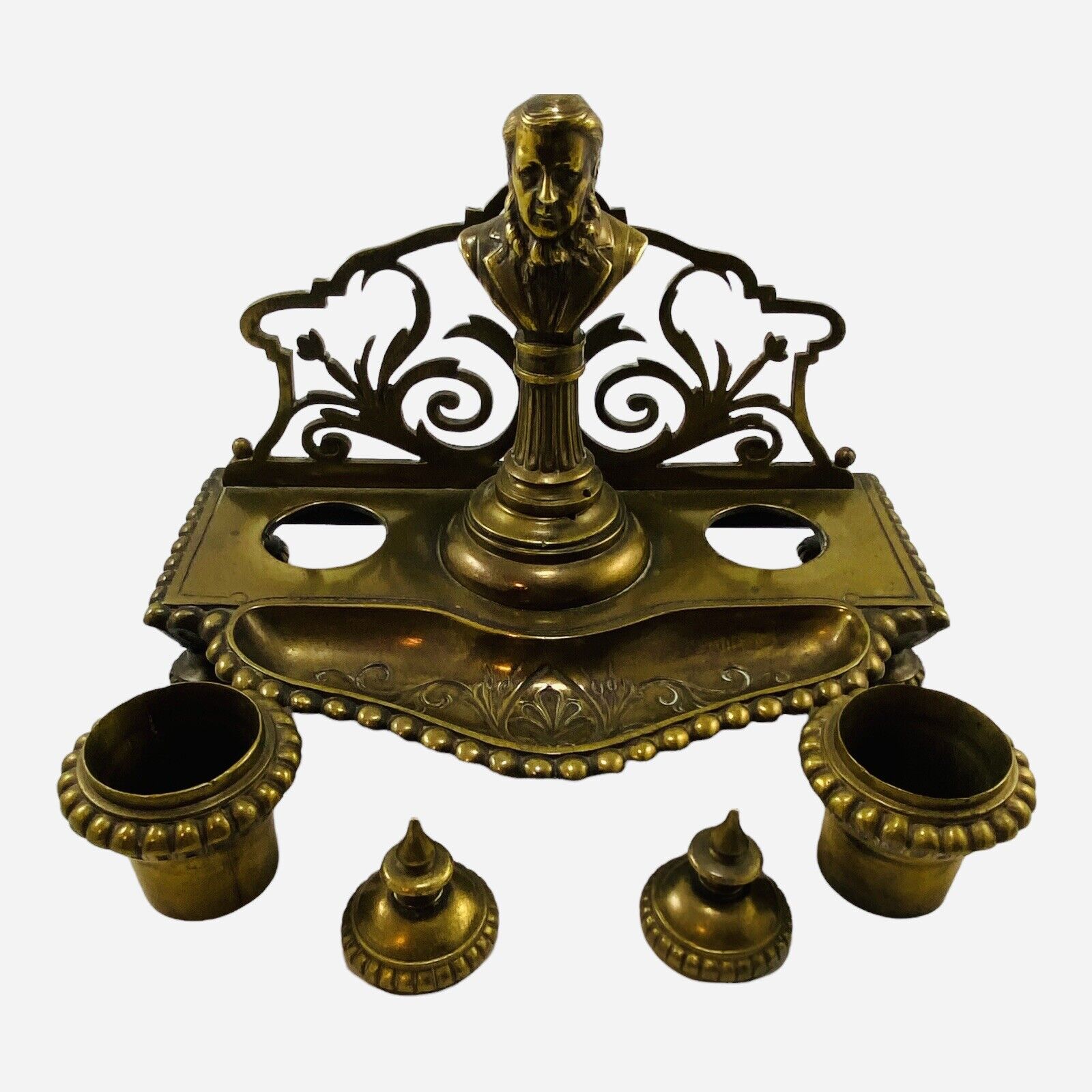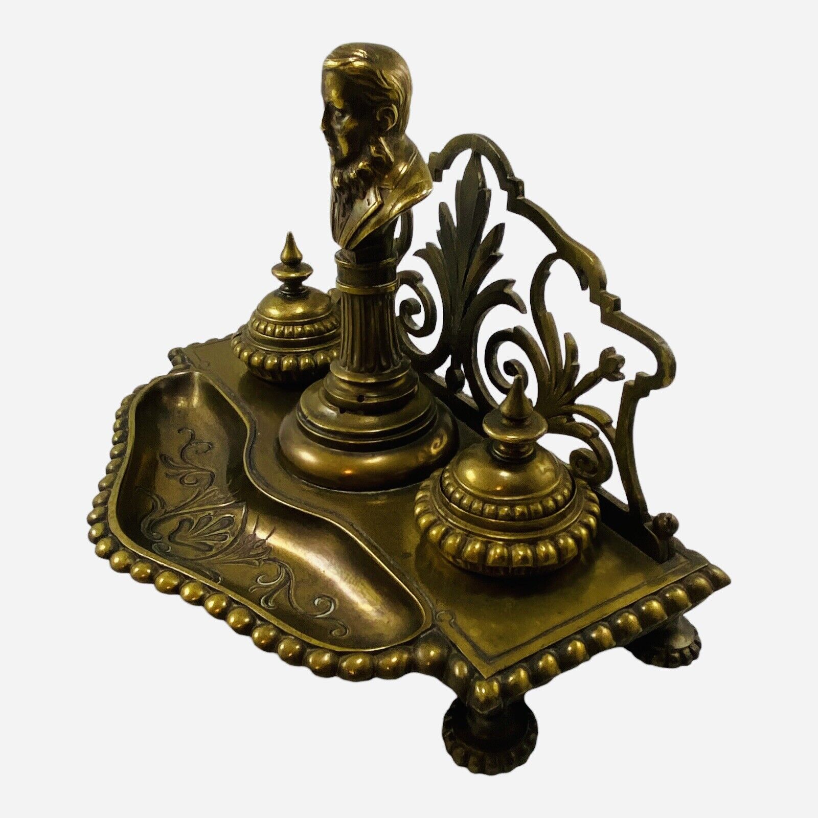 Ornate double inkstand all in brass with a man’s bust (famous?) as the centerpiece.