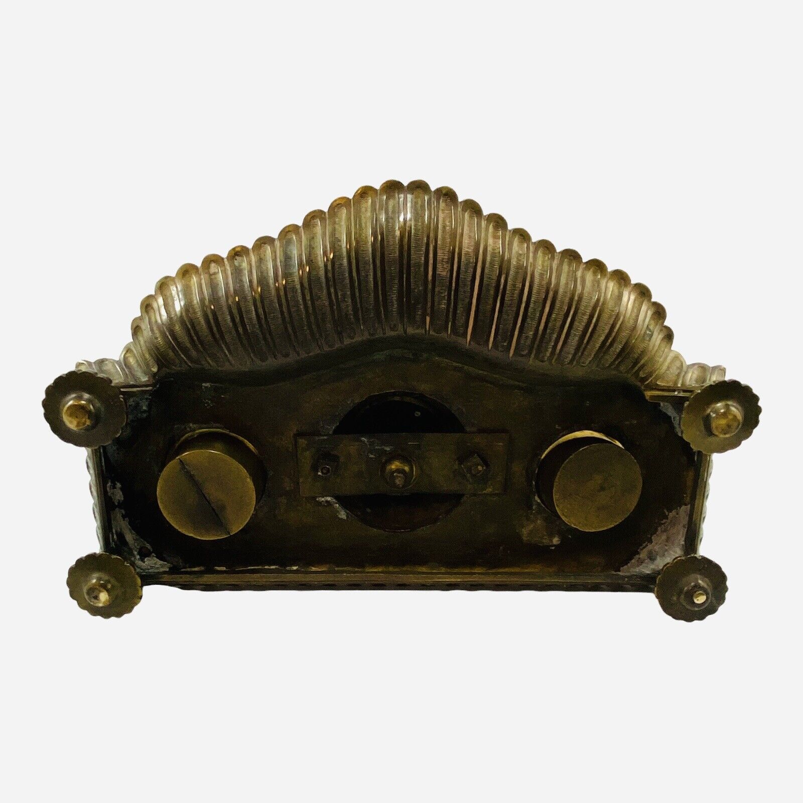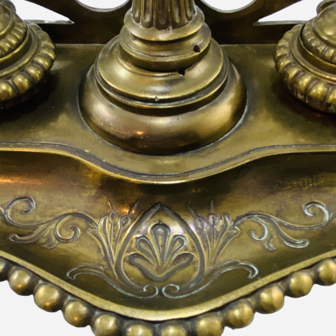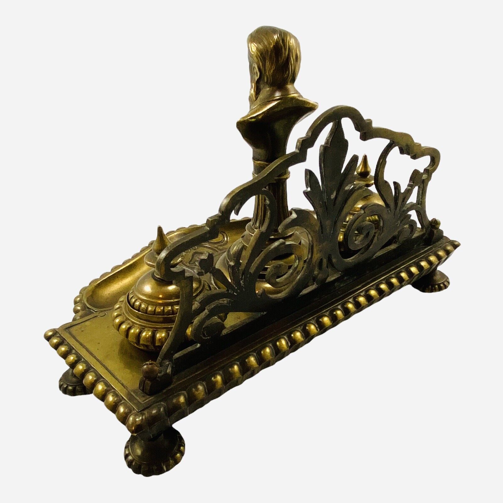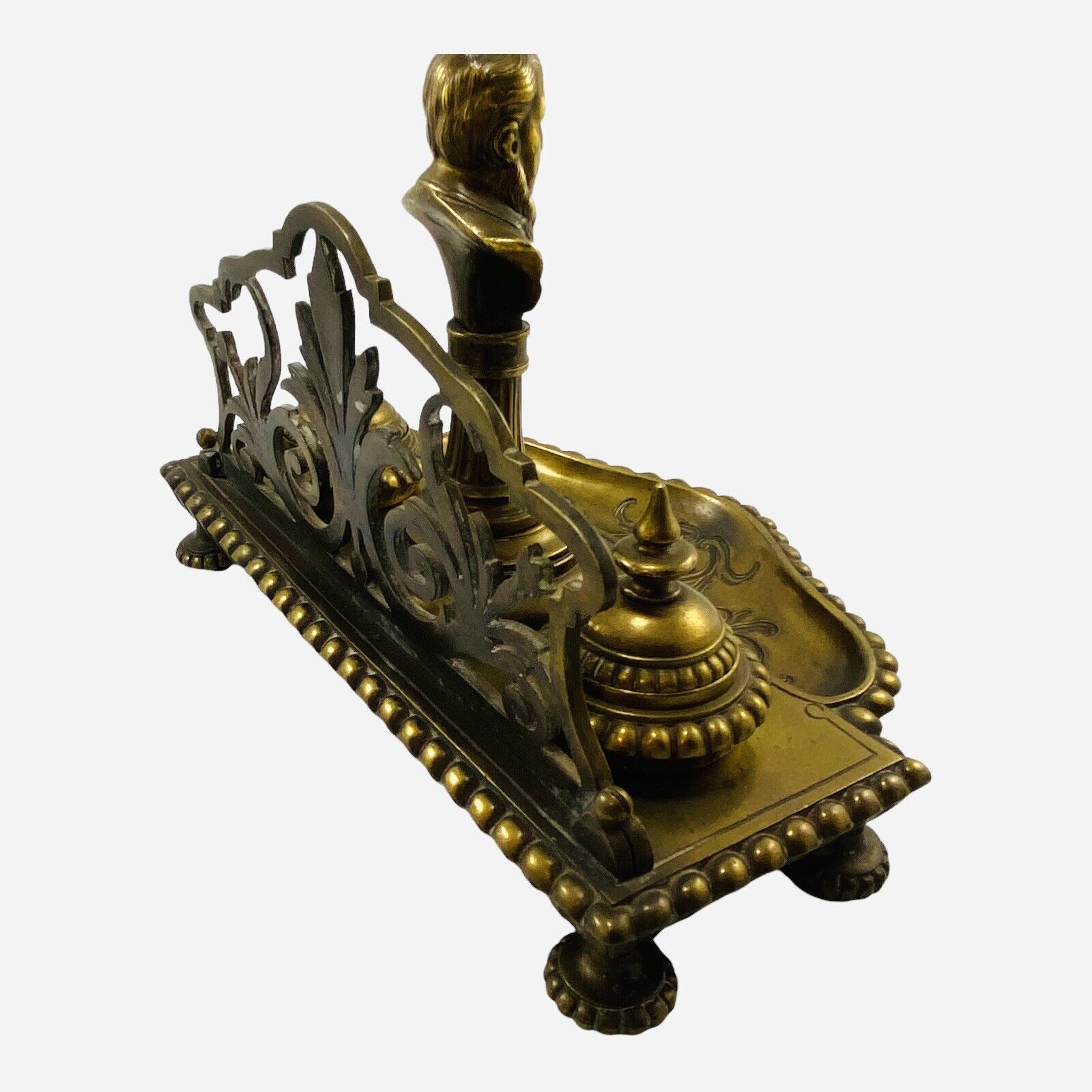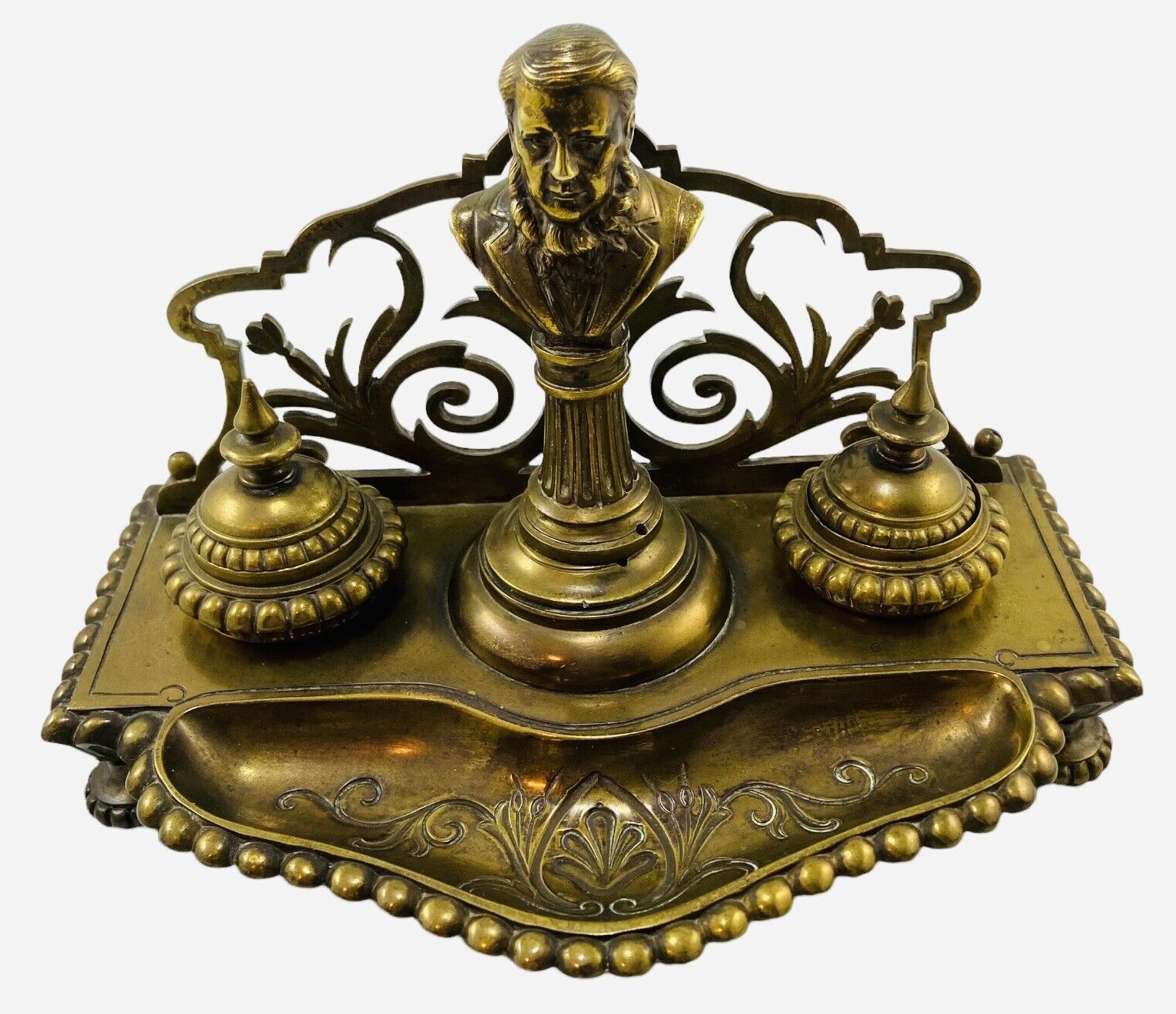 Ornate double inkstand all in brass with a man’s bust (famous?) as the centerpiece.