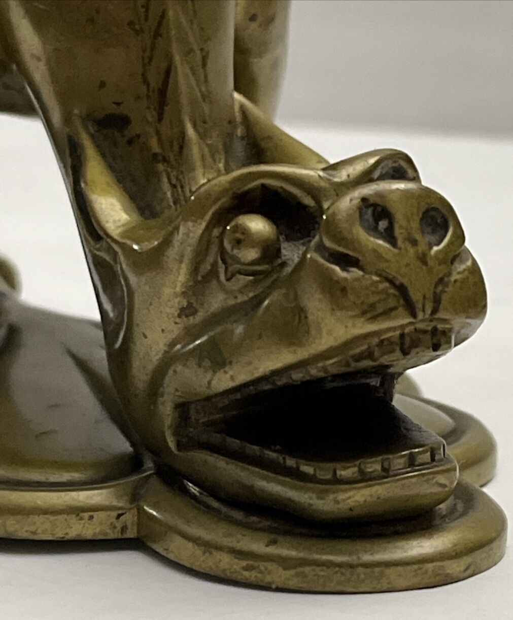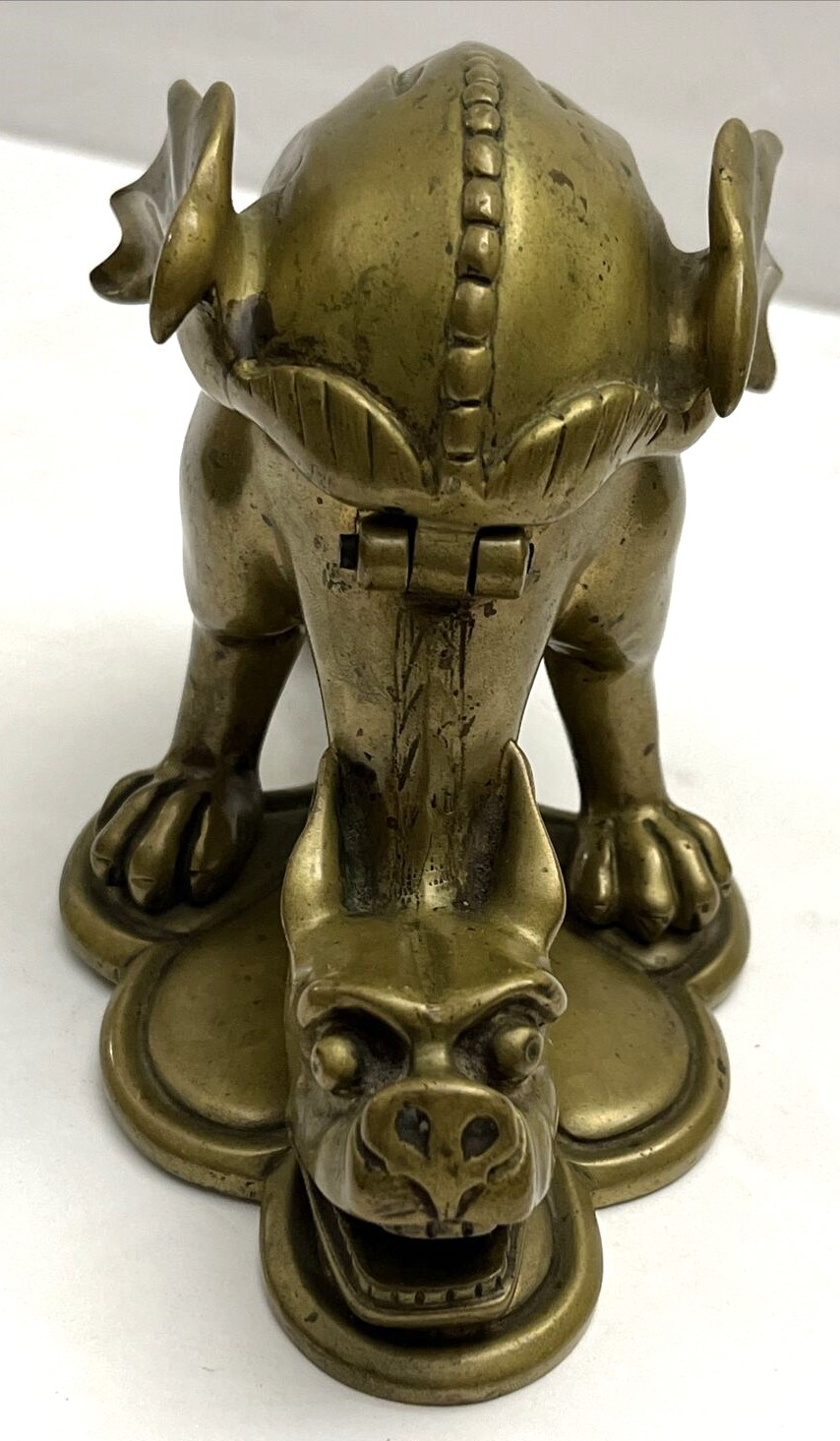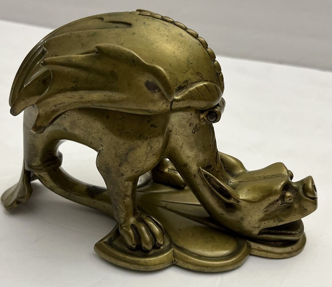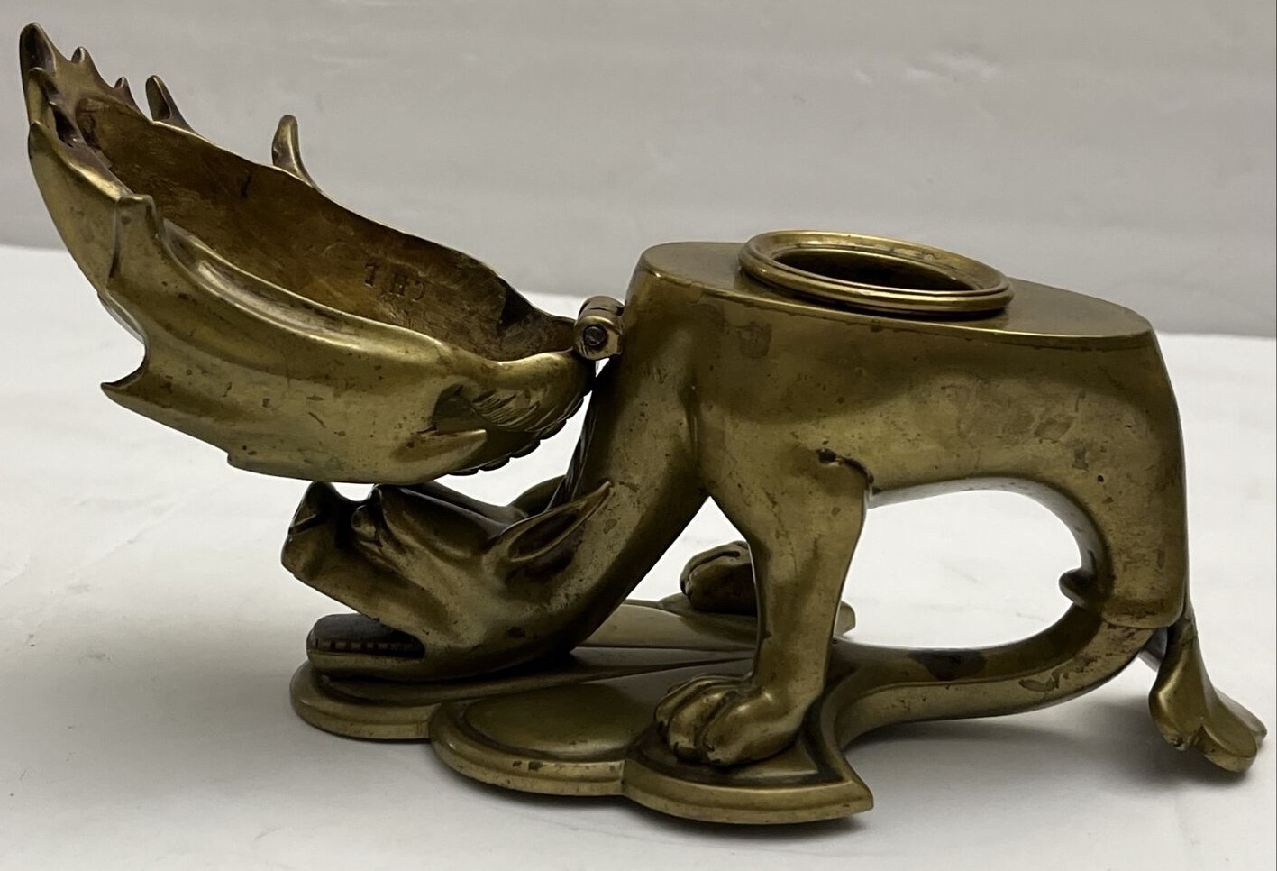 This dragon with its pointed ears, sharp wings, and long tail has its head down and mouth open, ready for a pen to rest there. The winged back opens to access the inkwell (insert missing). The piece is marked CH L on the underside.