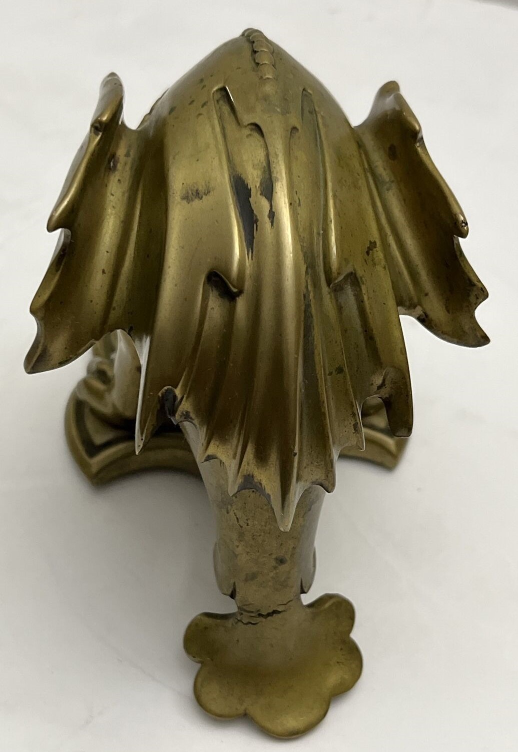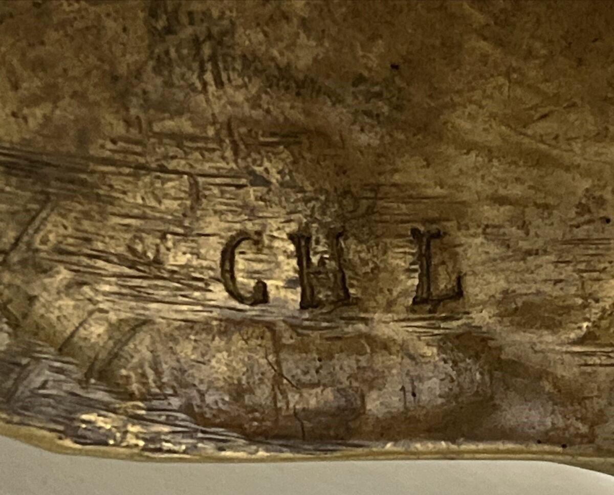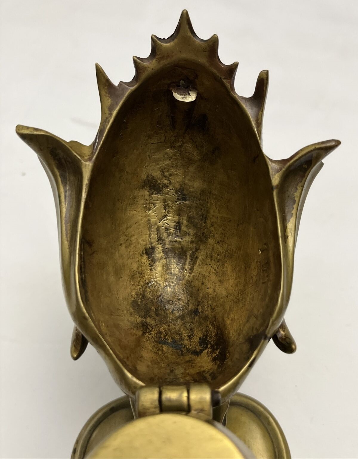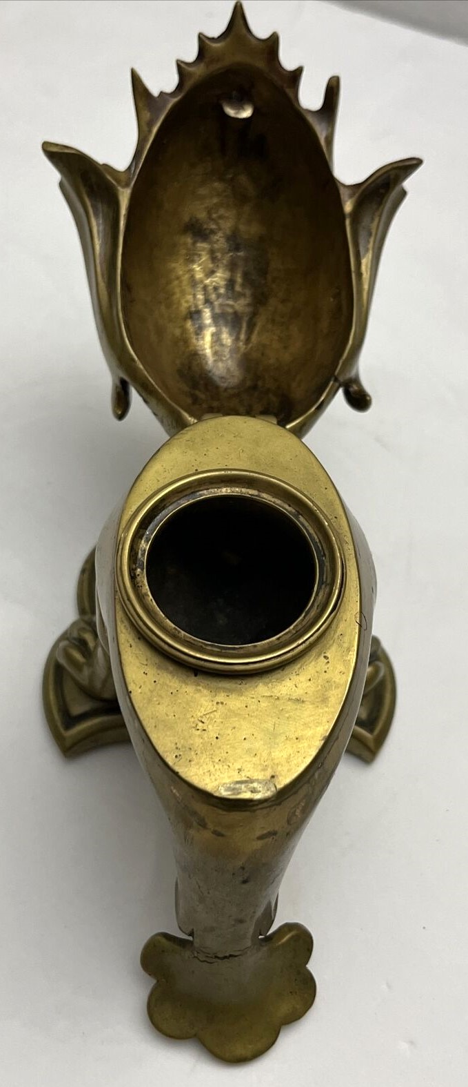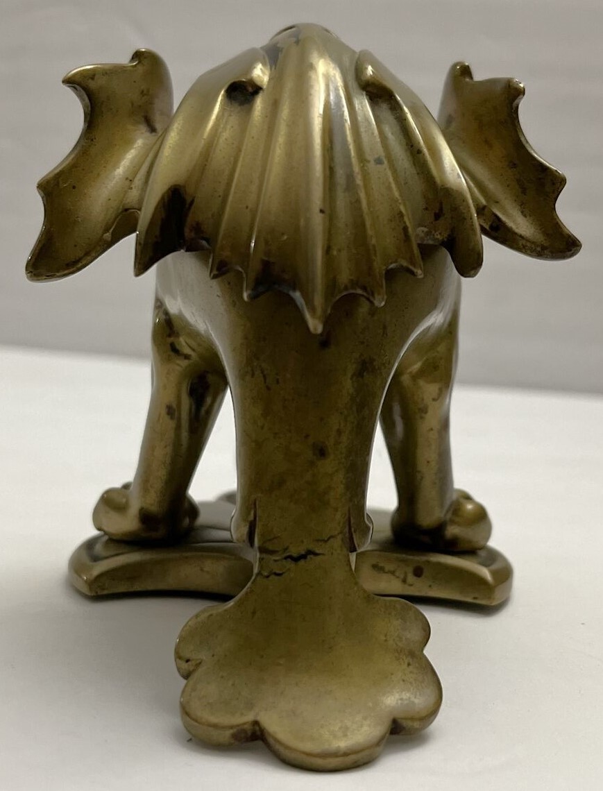 This dragon with its pointed ears, sharp wings, and long tail has its head down and mouth open, ready for a pen to rest there. The winged back opens to access the inkwell (insert missing). The piece is marked CH L on the underside.