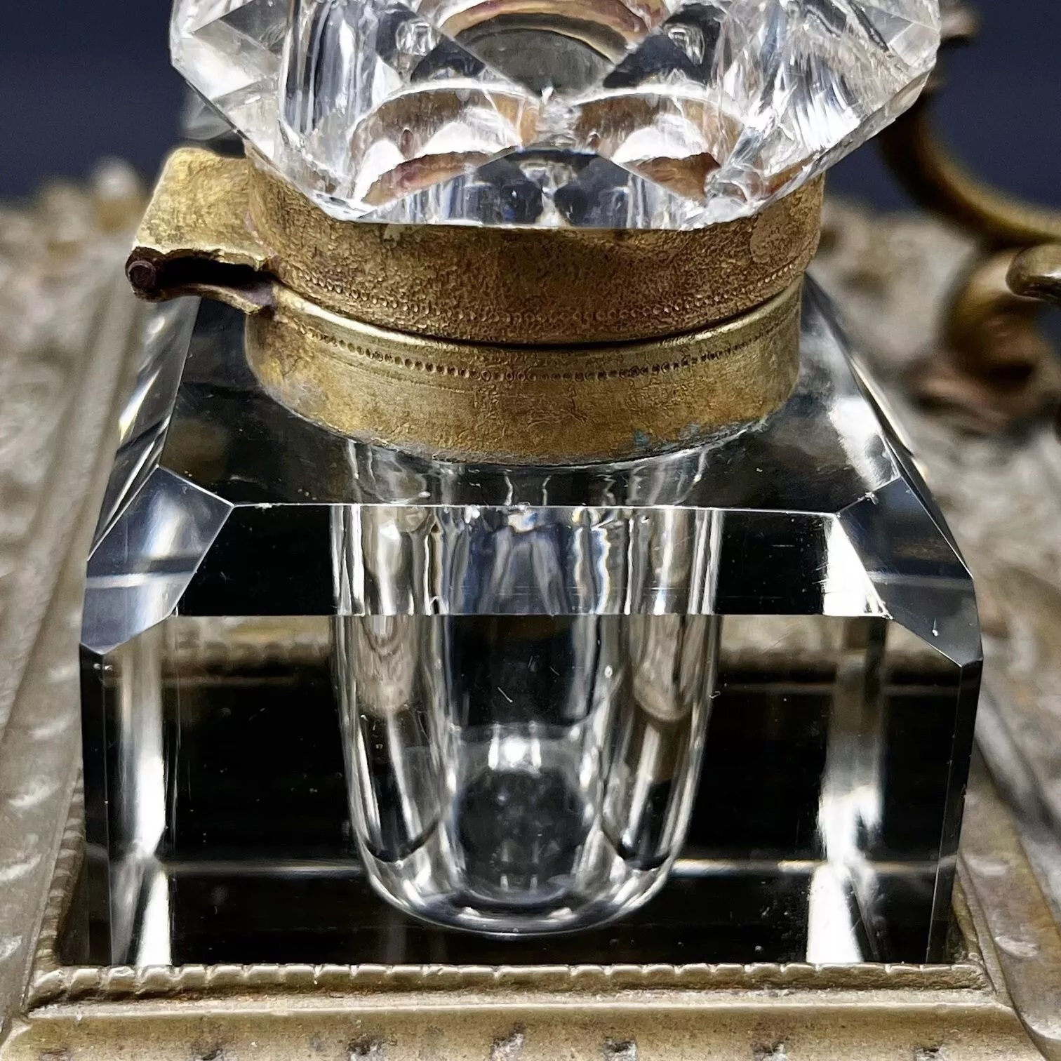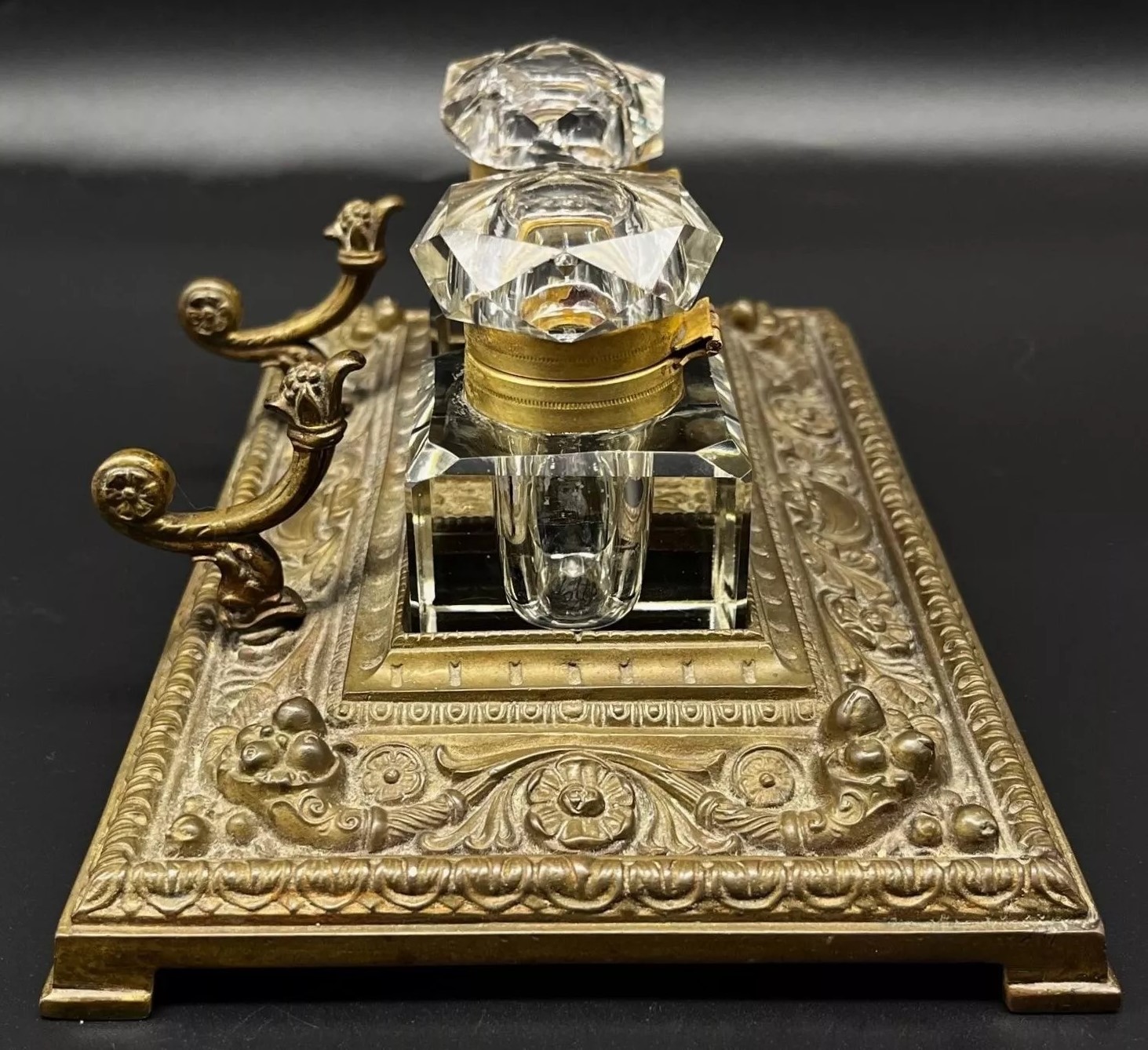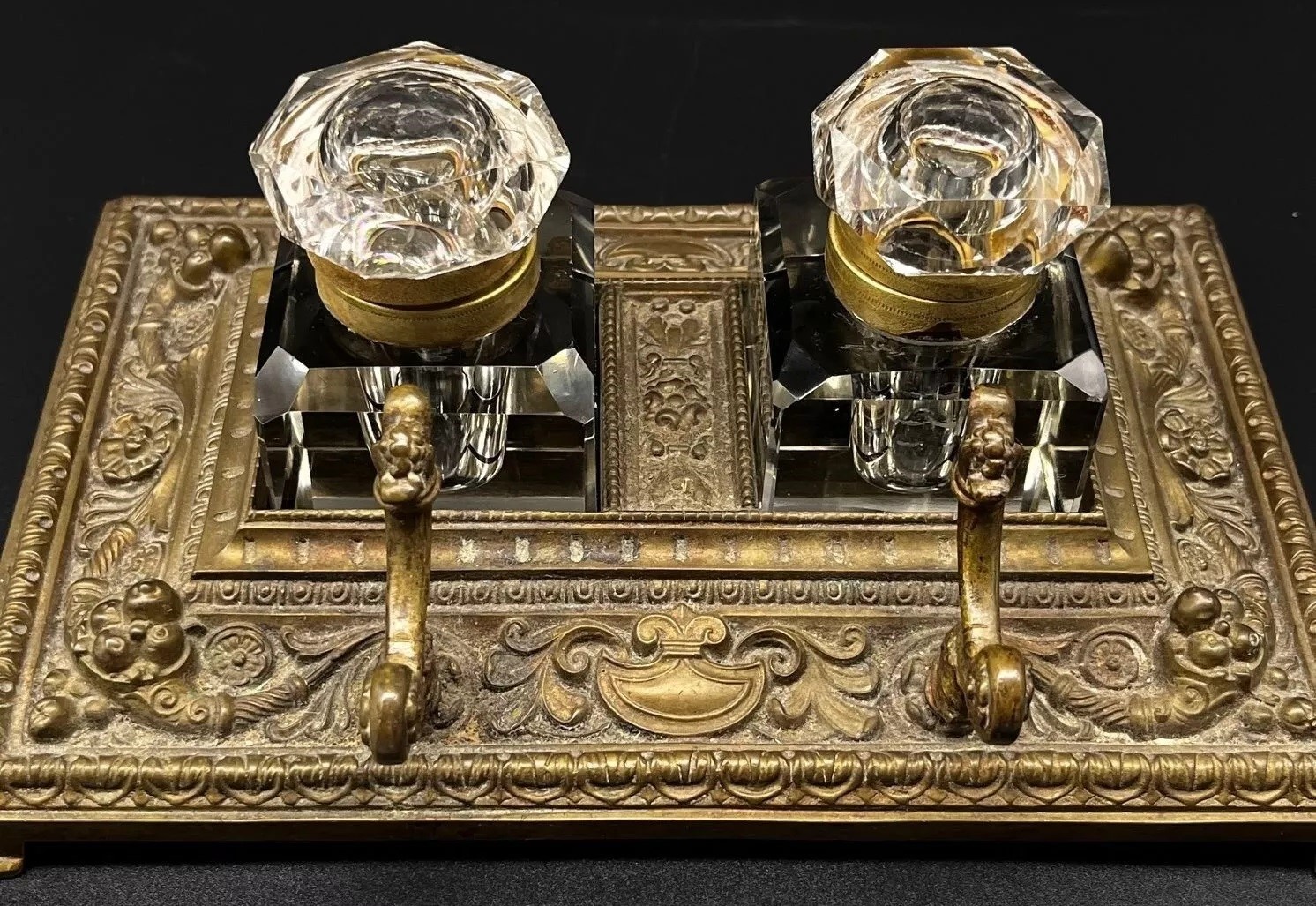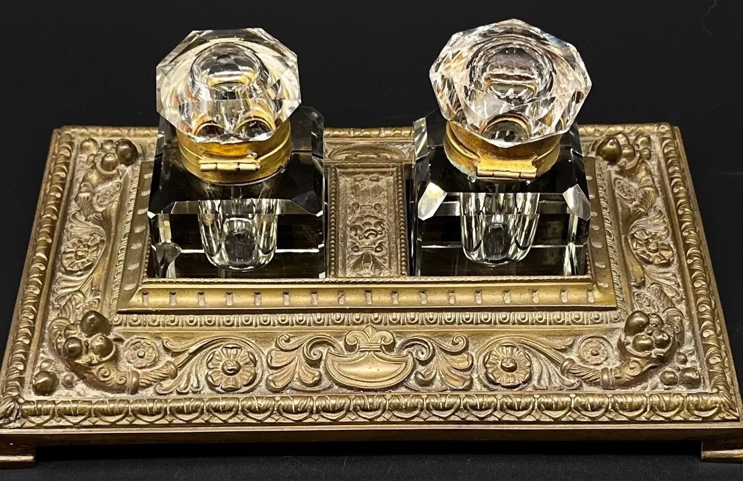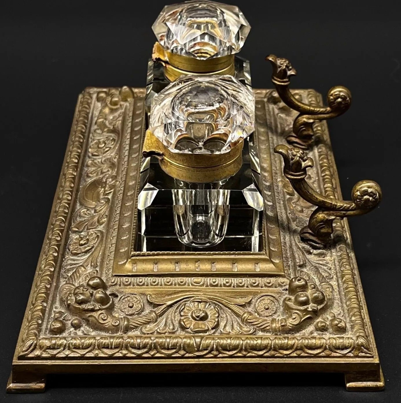 This inkstand features two glass inkwells with faceted designs set into an ornate brass metal stand decorated with Rococo-style acanthus leaves and fruit and scrollwork. In front of the inkwells, there is a pen holder.