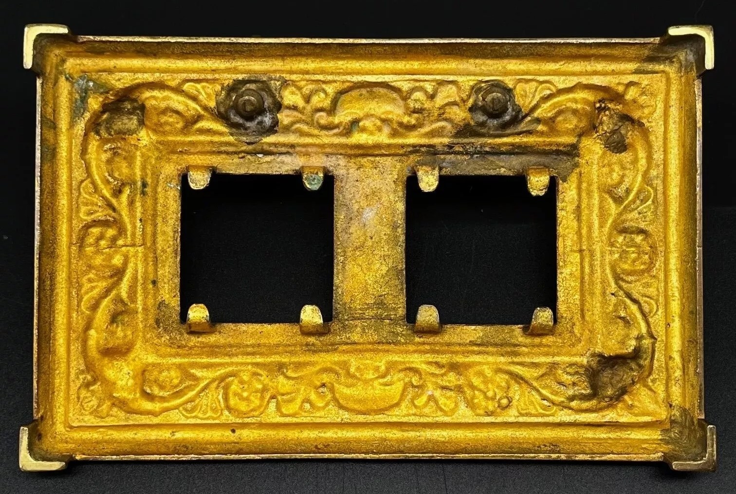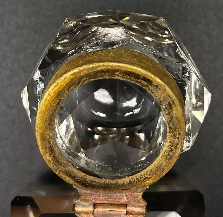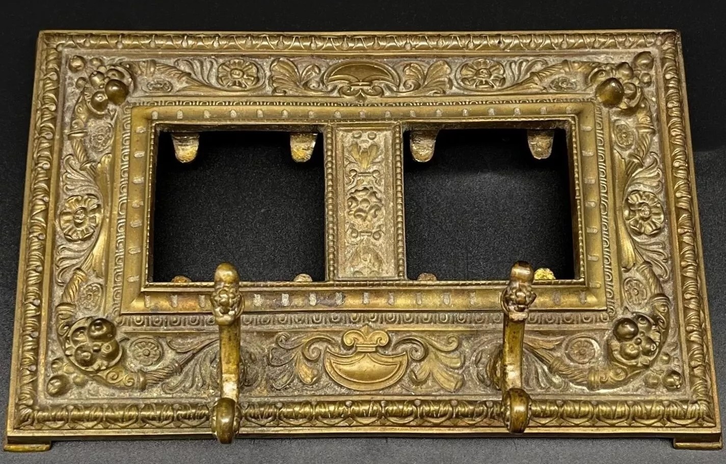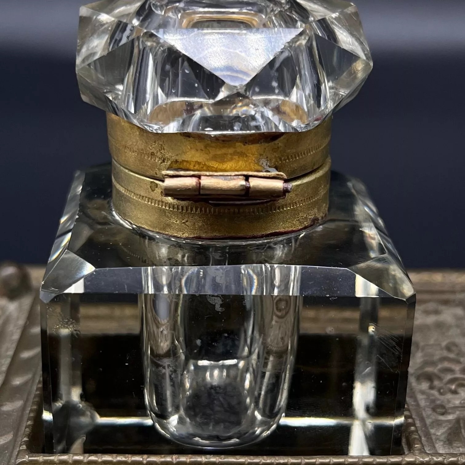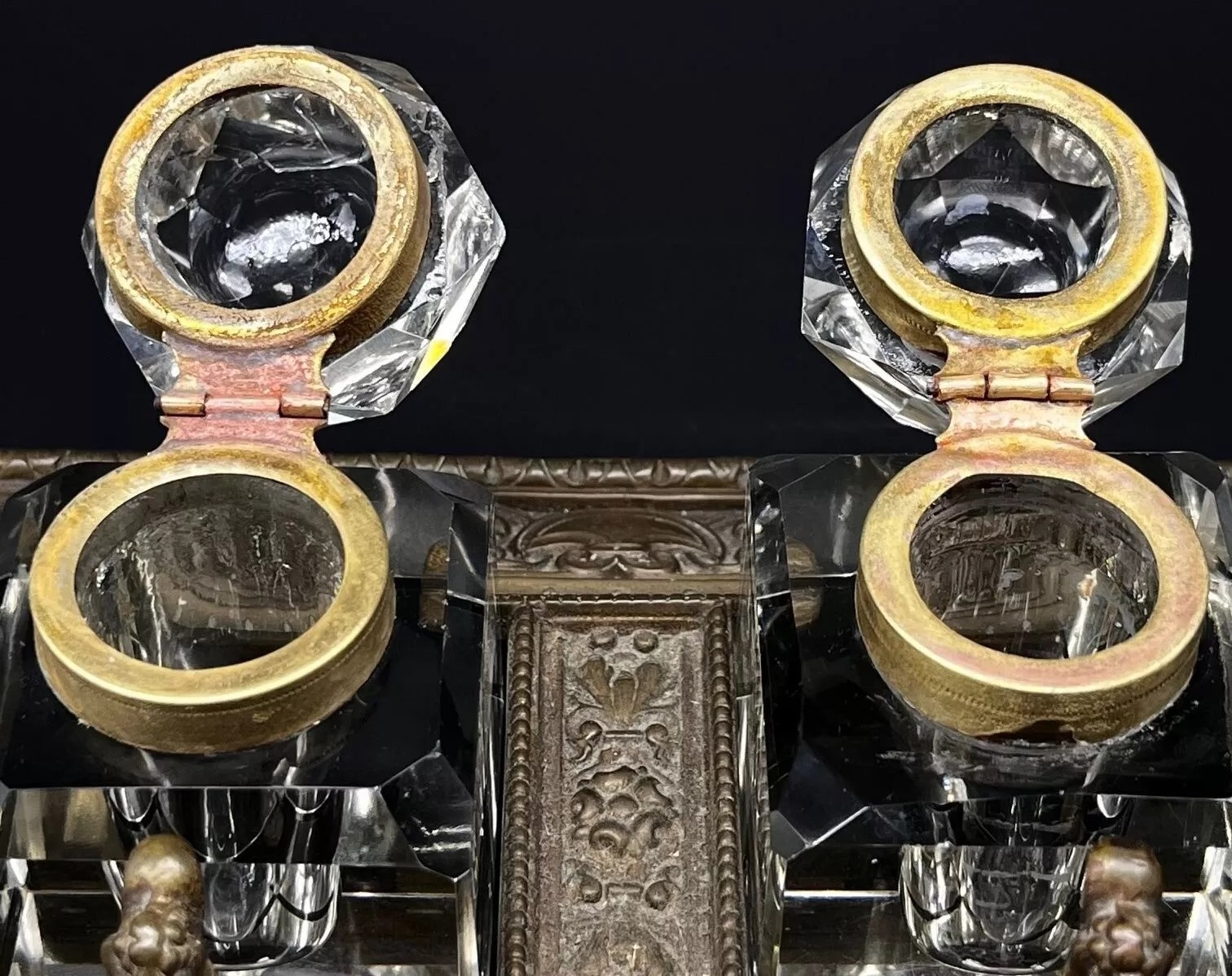 This inkstand features two glass inkwells with faceted designs set into an ornate brass metal stand decorated with Rococo-style acanthus leaves and fruit and scrollwork. In front of the inkwells, there is a pen holder.