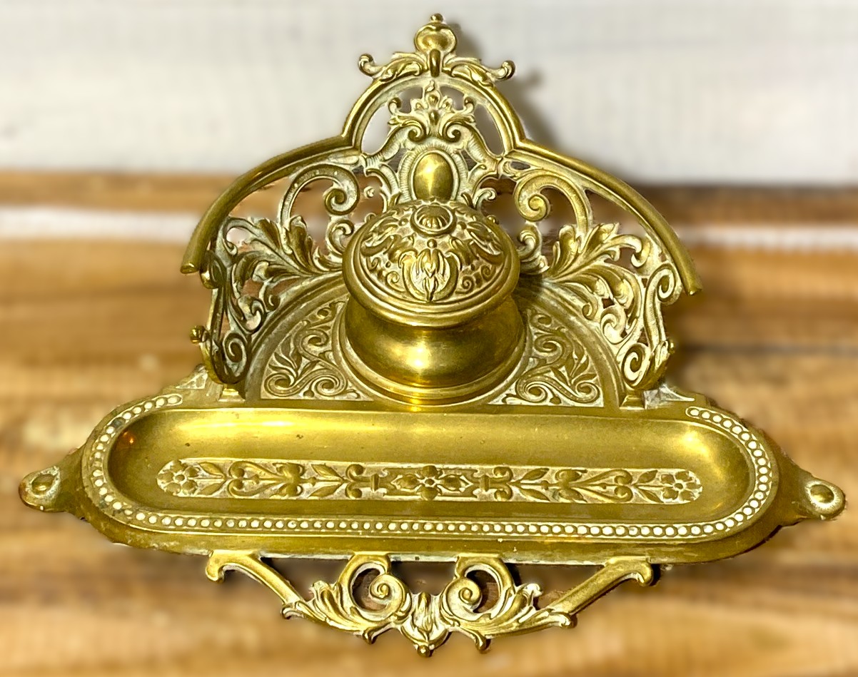 - The Inkwell: A single, central inkwell rises from the back of the base. It is cylindrical and has a hinged lid. The lid is domed with a flattened top, which is adorned with an intricate, low-relief design.