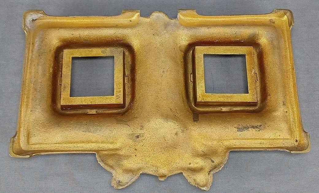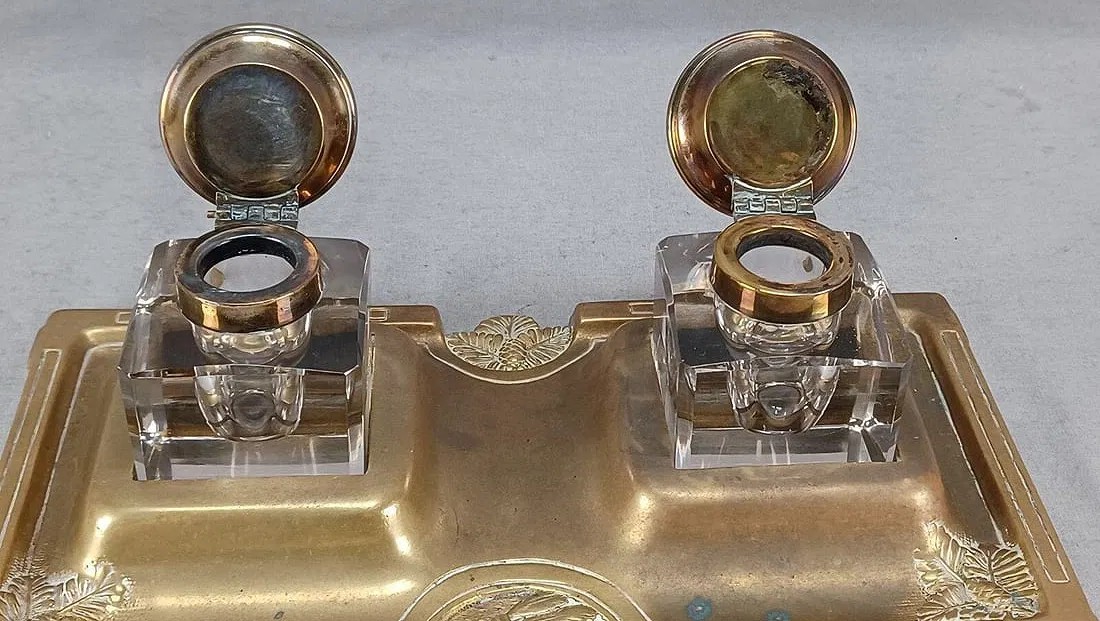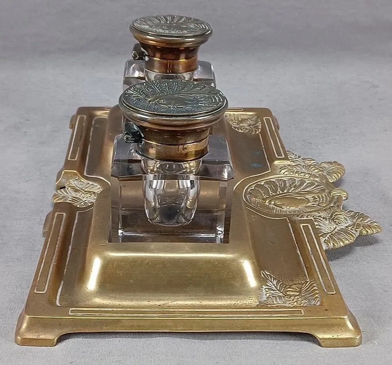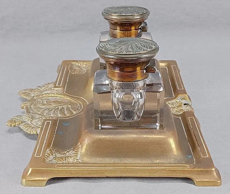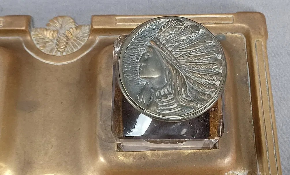 This brass inkstand holds two separate inkwells. The brass base has two square openings that fit the glass inkwells. The front of the stand is decorated with a raised, round panel depicting a Native American chief in profile wearing a full headdress. This profile is framed by a border with decorative pinecones at the corners. The inkwells are covered by two hinged lids, which are also decorated with the same repoussé profile of the Indian chief.