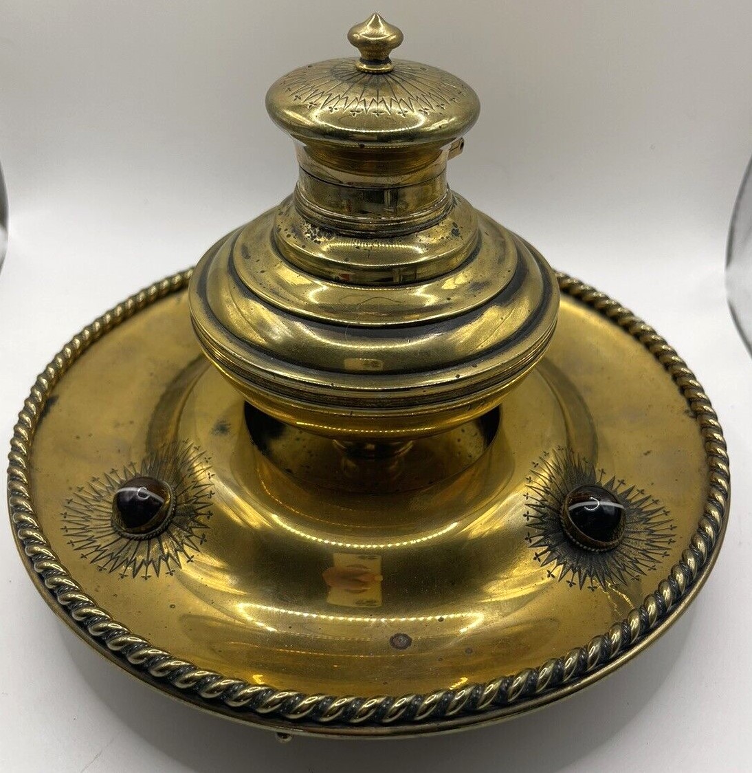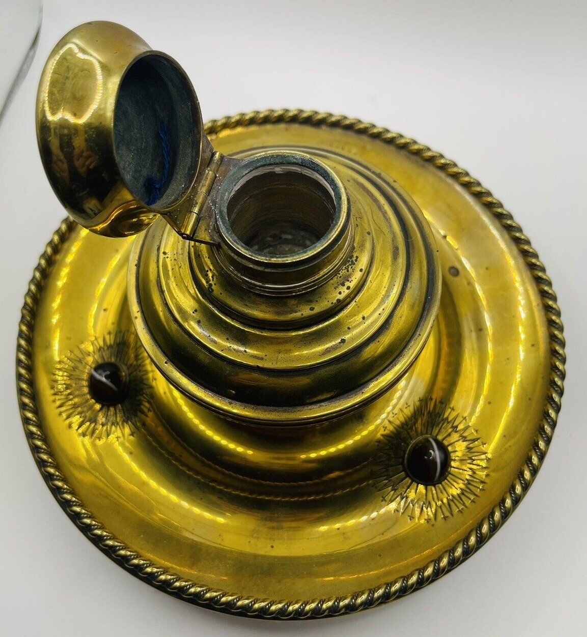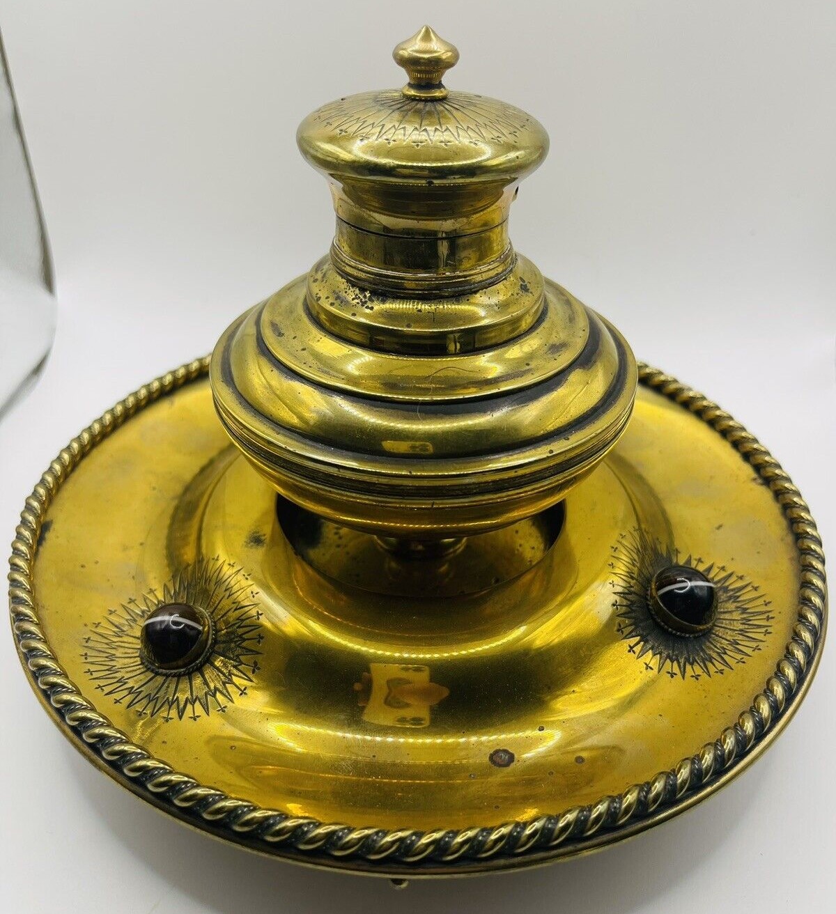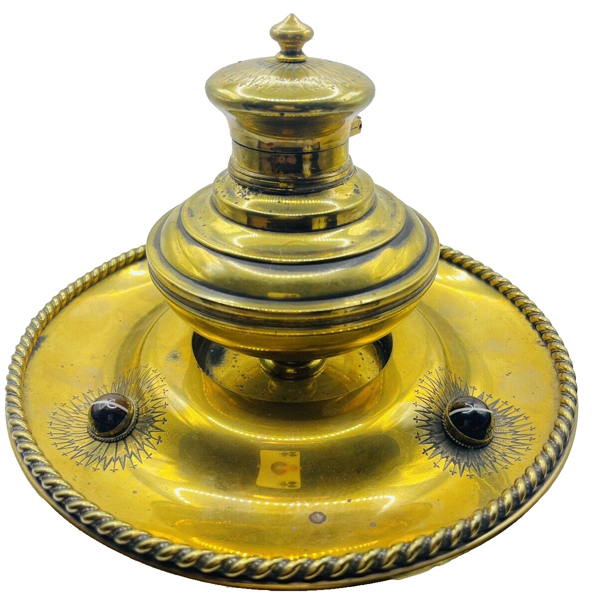 This brass, circular urn-shaped inkstand is decorated with three glass cabochons surrounded with sunburst engraving on the saucer base with a twisted rope border. The urn-shaped inkwell with a domed lid and ornamental finial is missing its insert.