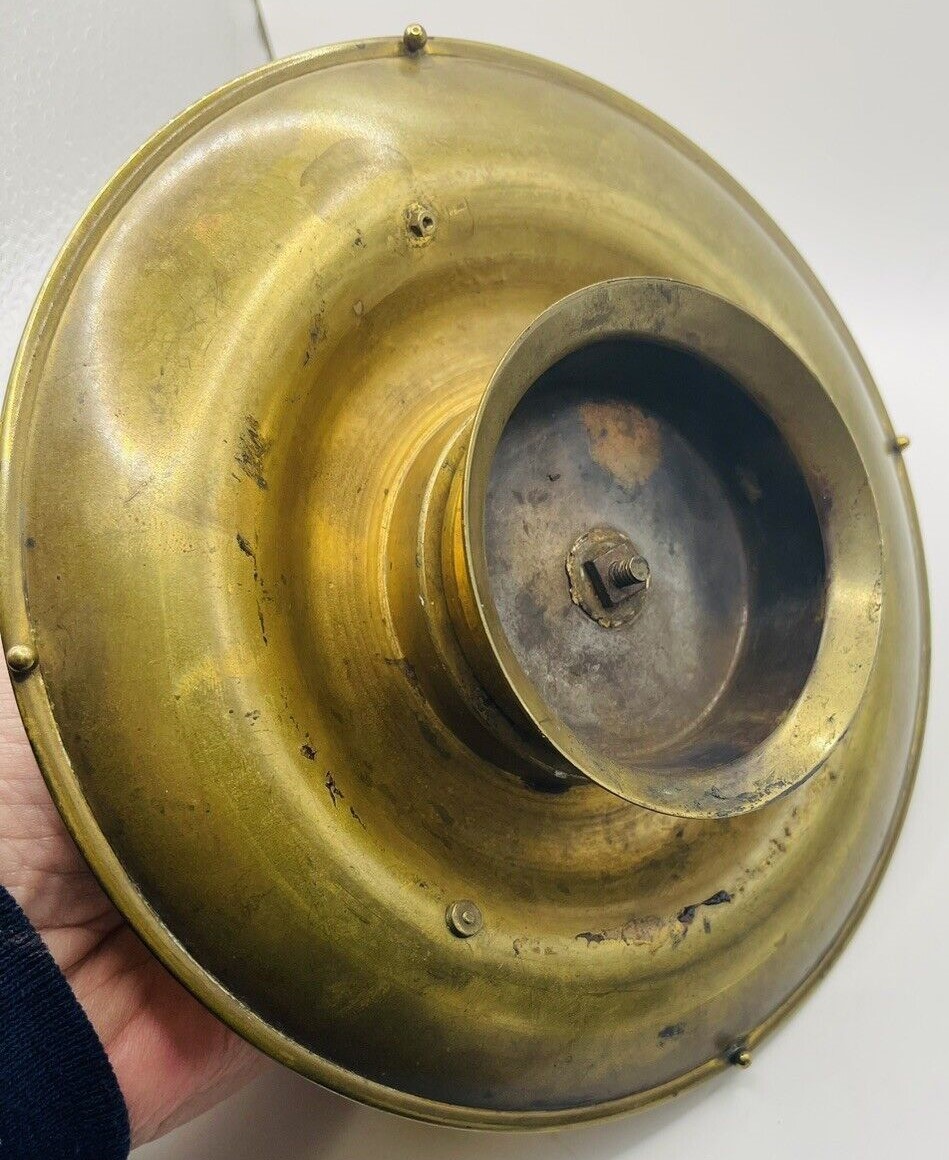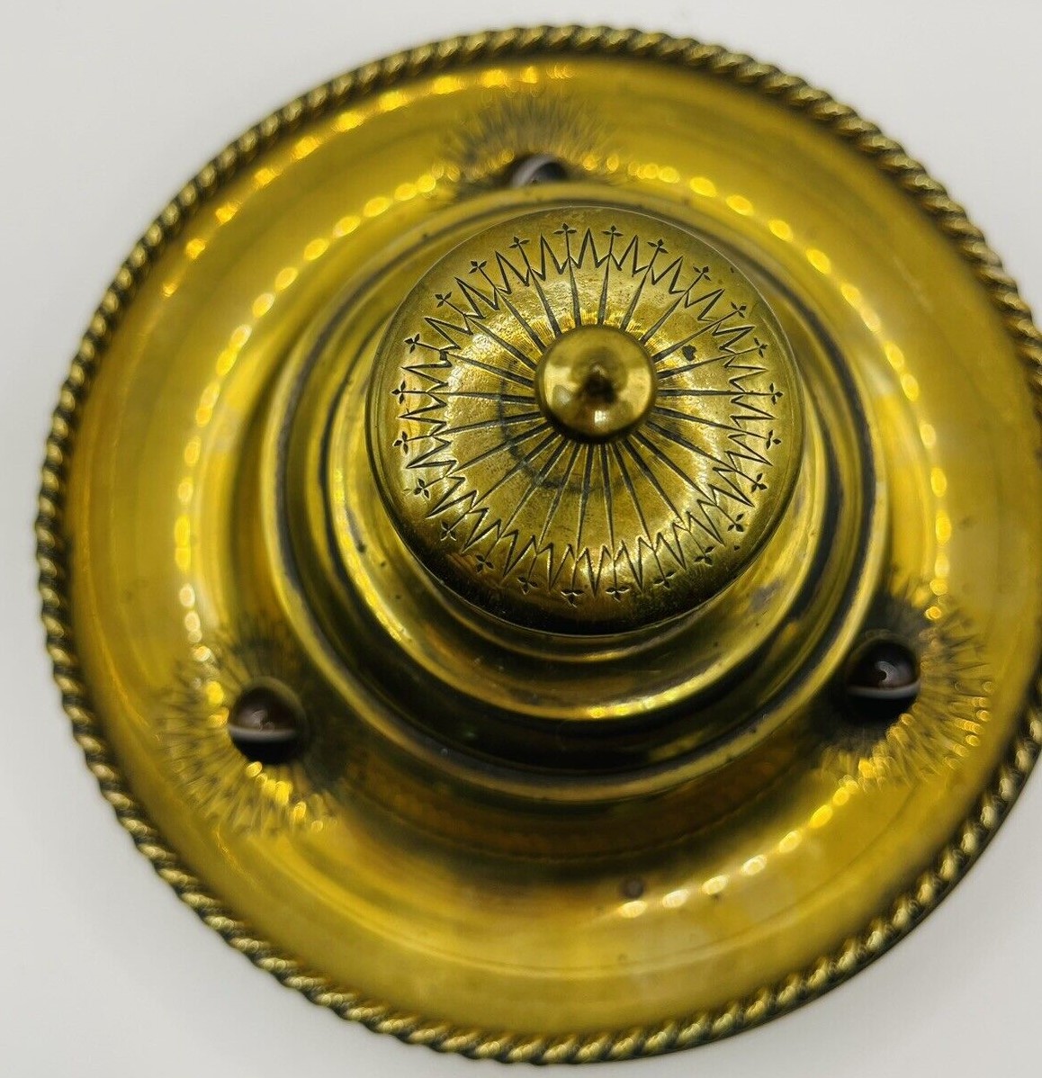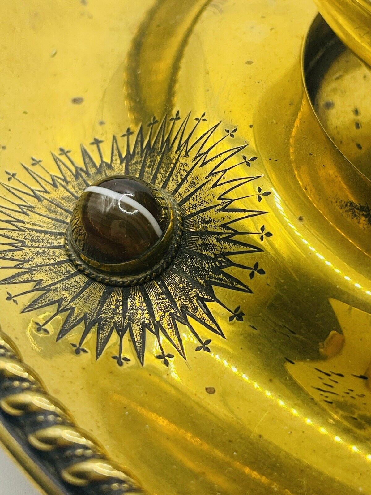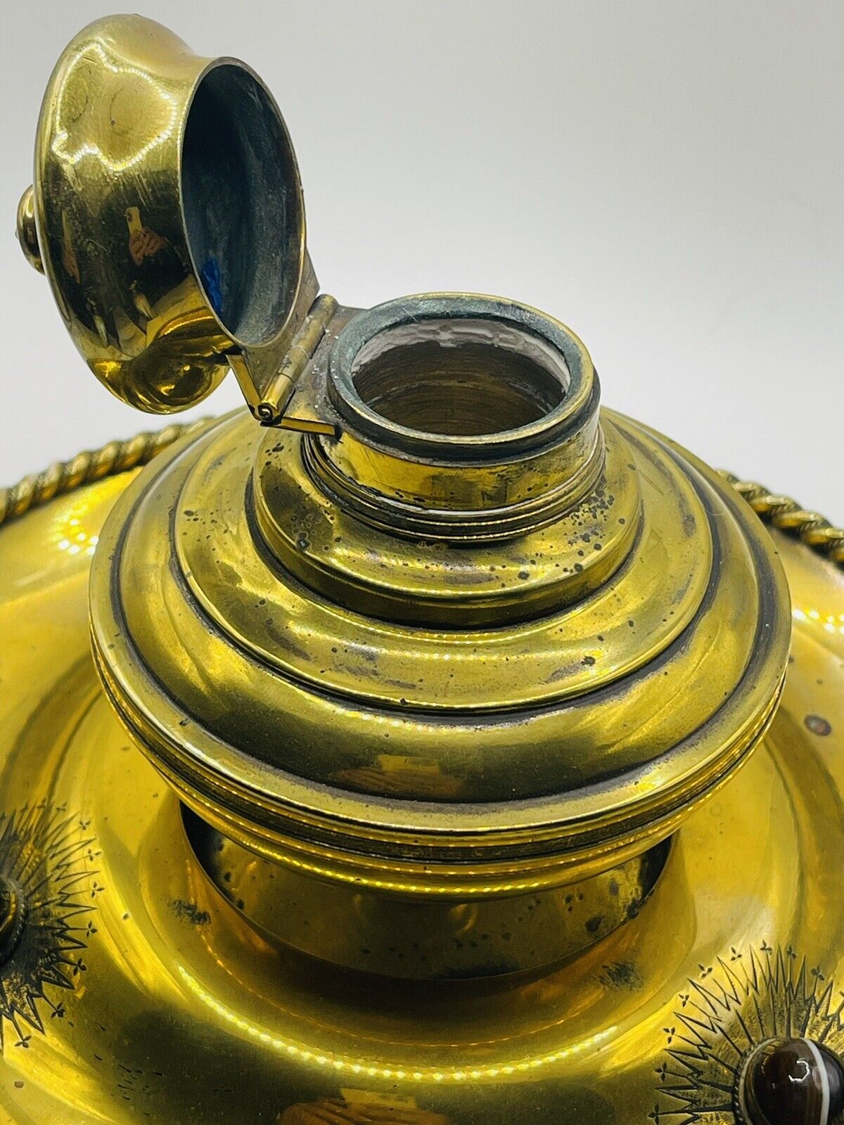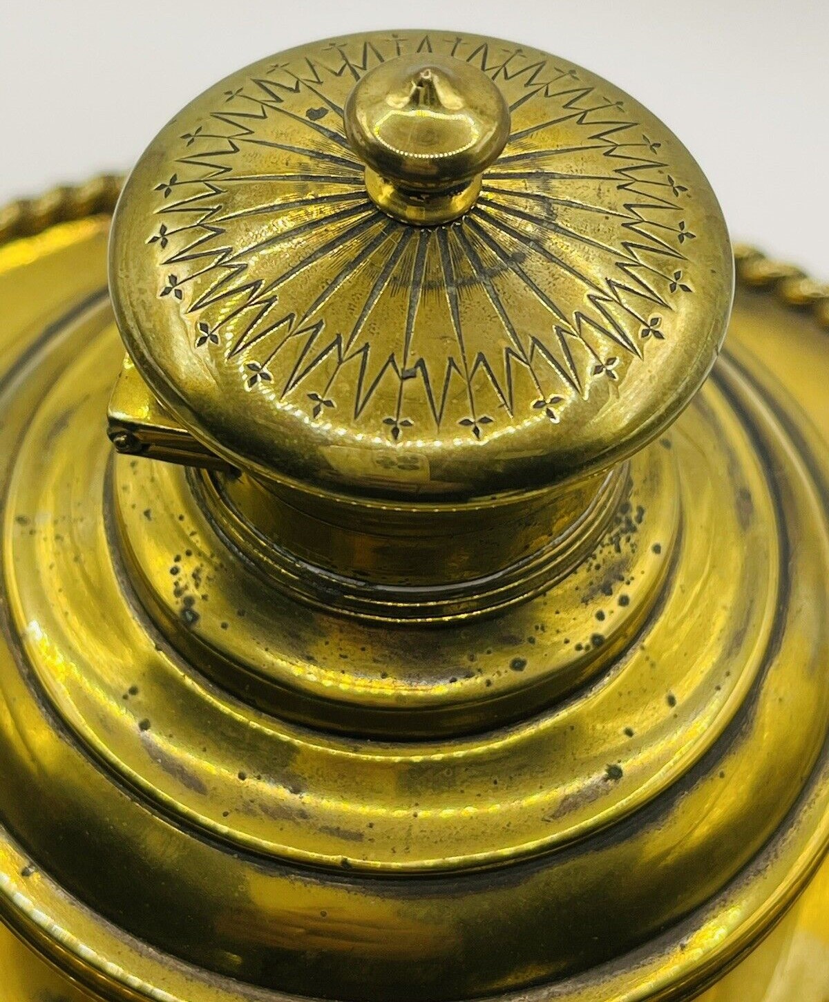 This brass, circular urn-shaped inkstand is decorated with three glass cabochons surrounded with sunburst engraving on the saucer base with a twisted rope border. The urn-shaped inkwell with a domed lid and ornamental finial is missing its insert.