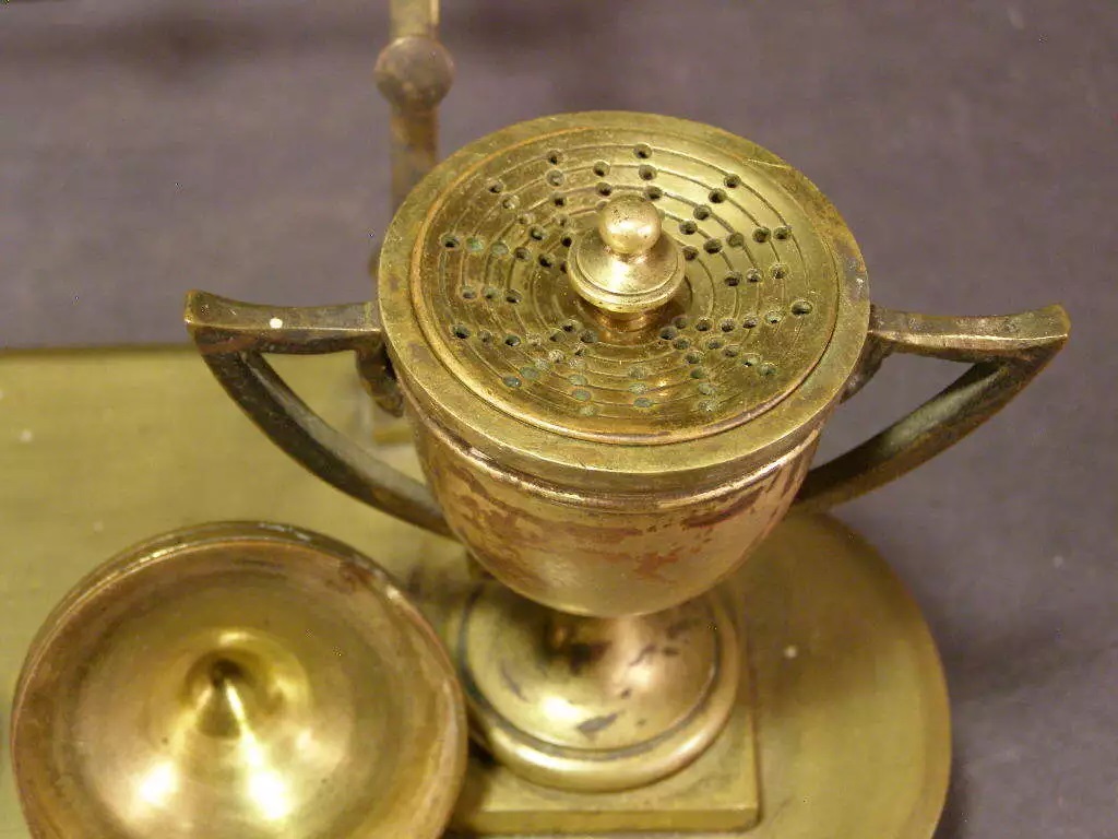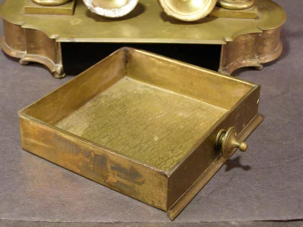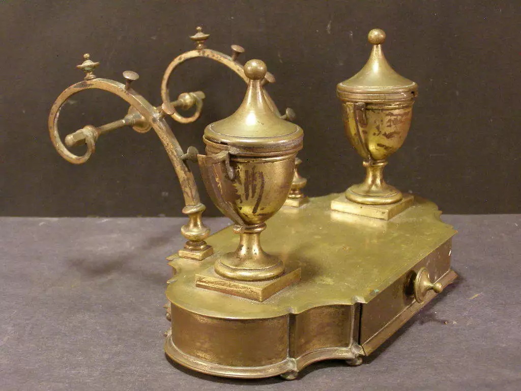 A brass inkstand with an urn-shaped inkwell and sander. Both pieces have finial-topped lids and ornate handles. The pen rack has curved brass arms designed to hold pens. Located at the front is a pullout drawer.