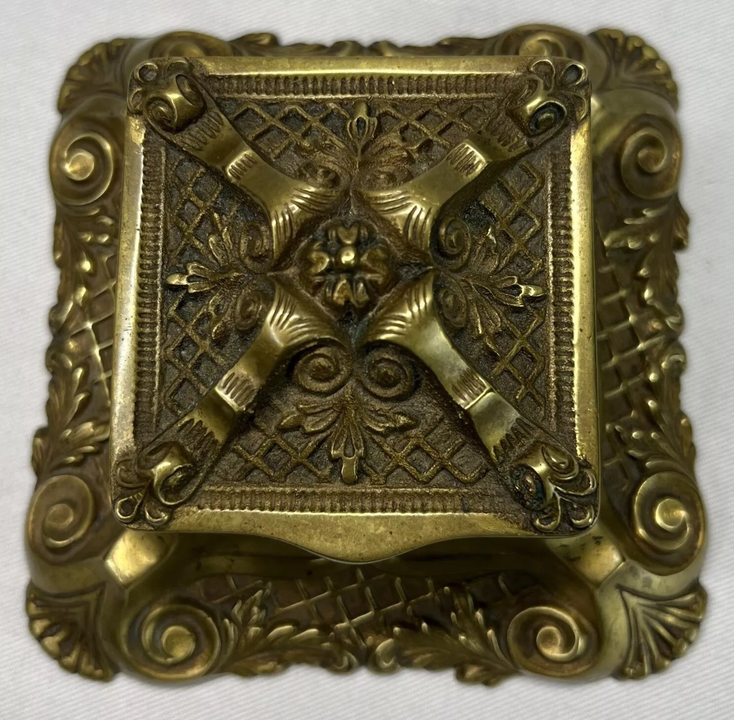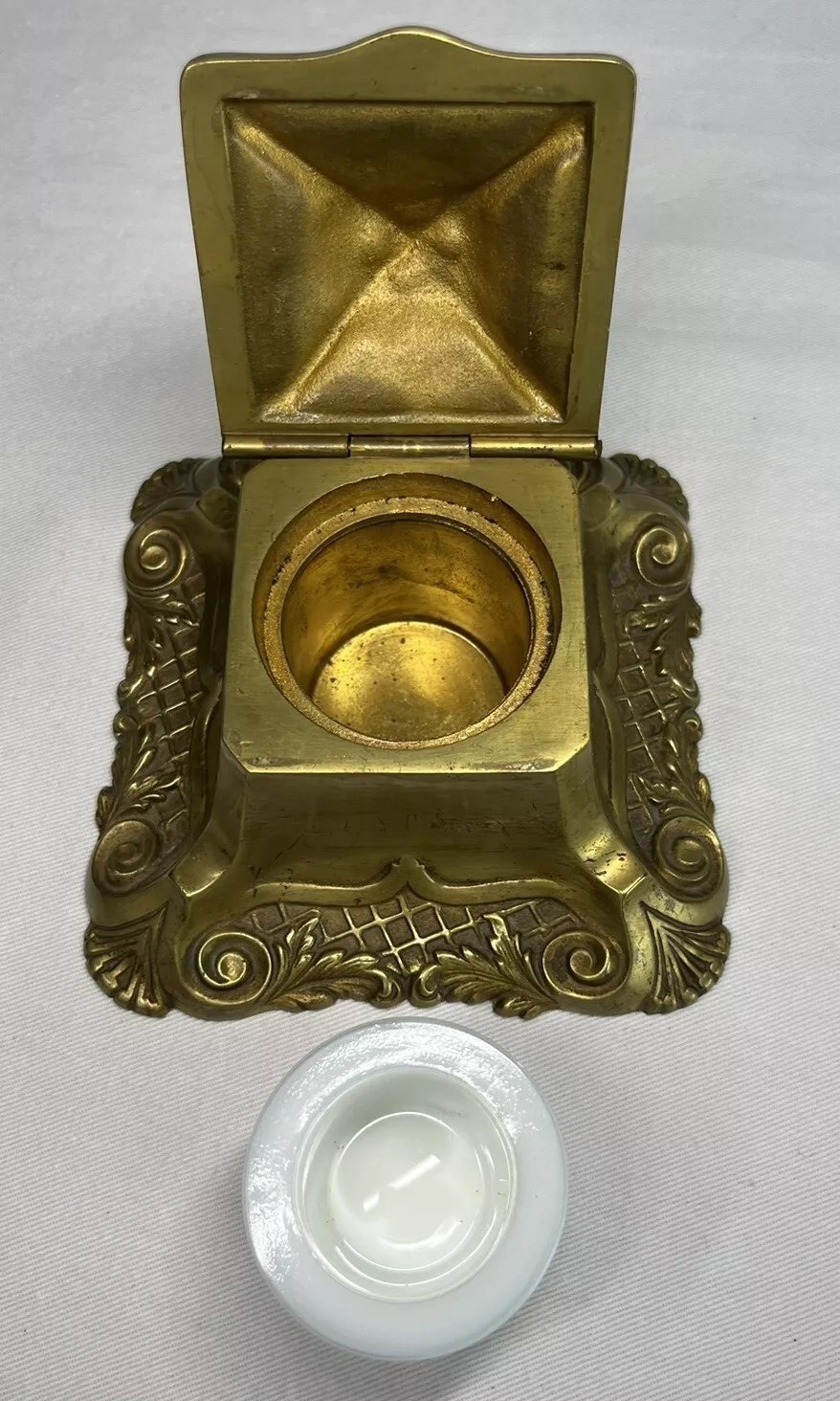 This brass inkwell was manufactured by the Bradley & Hubbard Manufacturing Company. This piece features intricate detailing, including acanthus leaves, geometric shapes, and floral motifs.