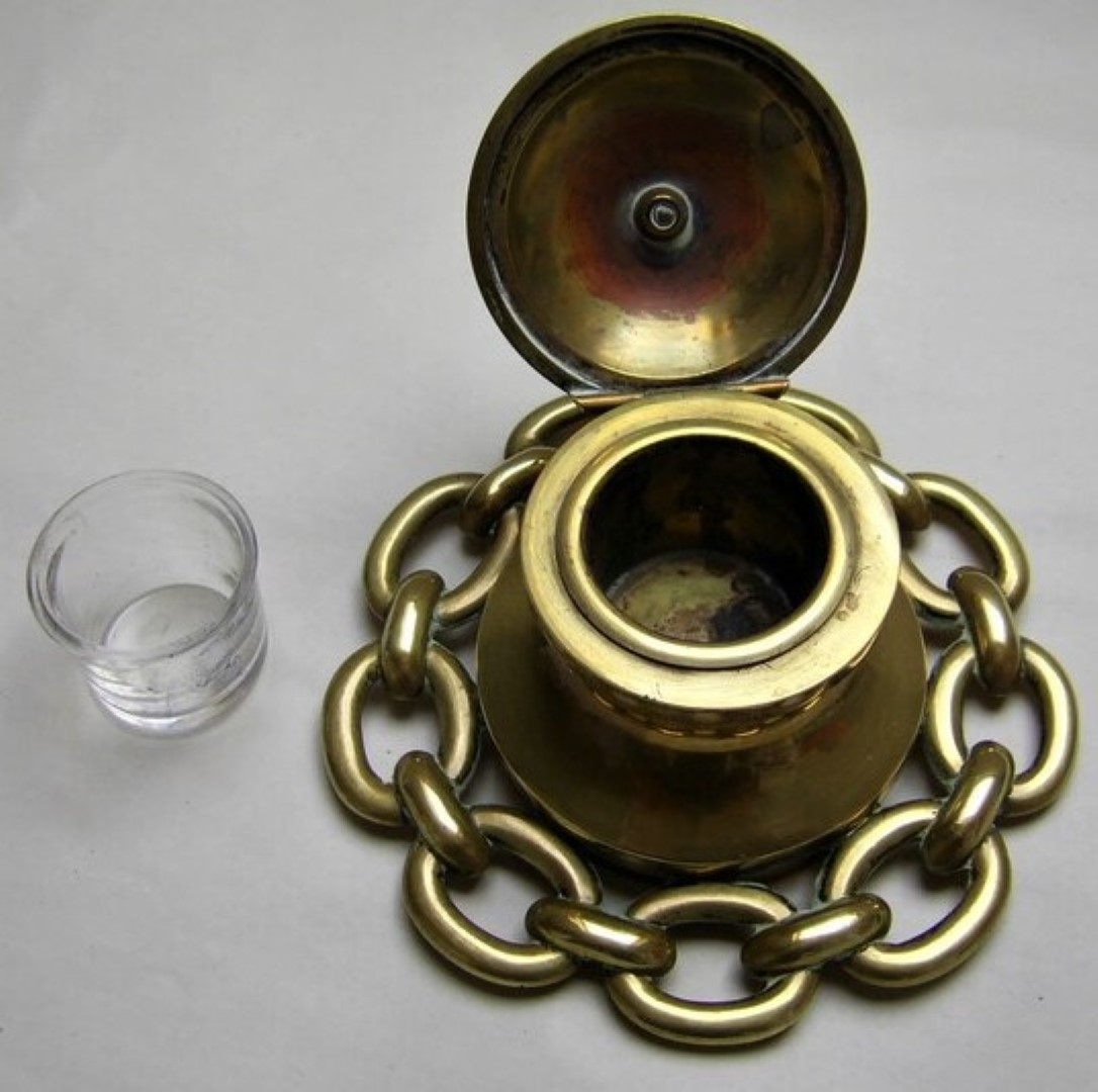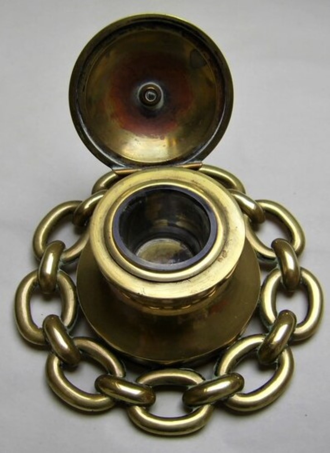 This brass inkwell features a round, polished brass base adorned with a chain-link ornamentation. The lid continues the look with a chain link inserted through the ball finial.