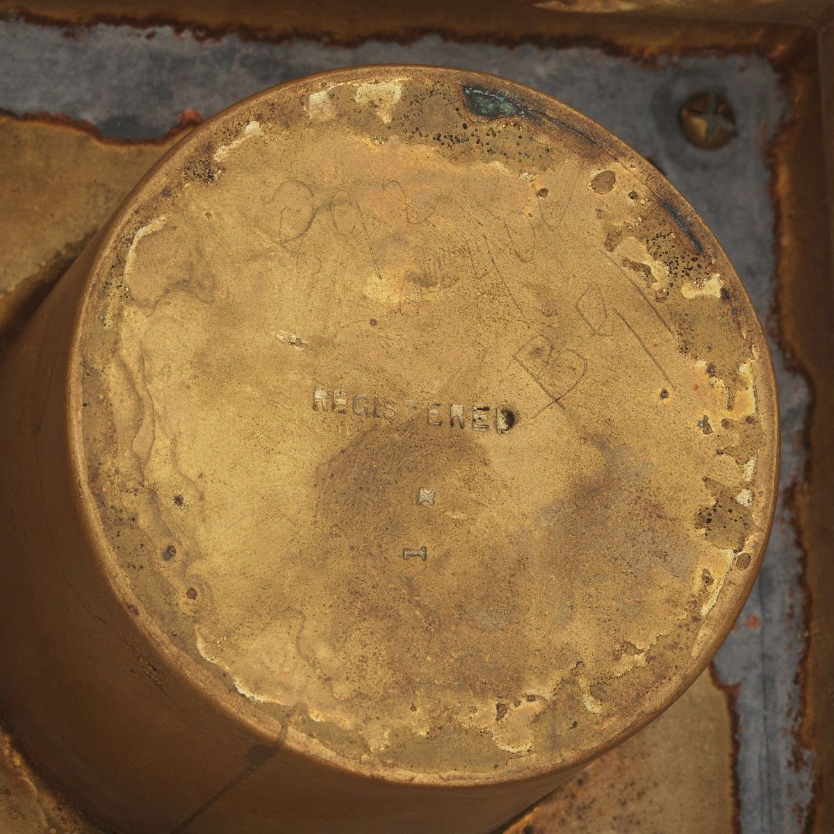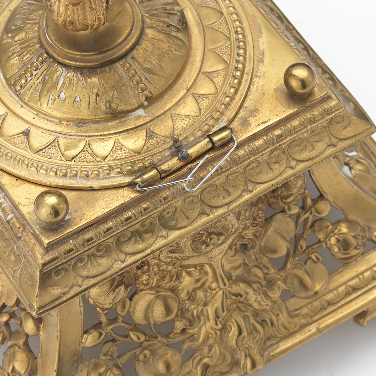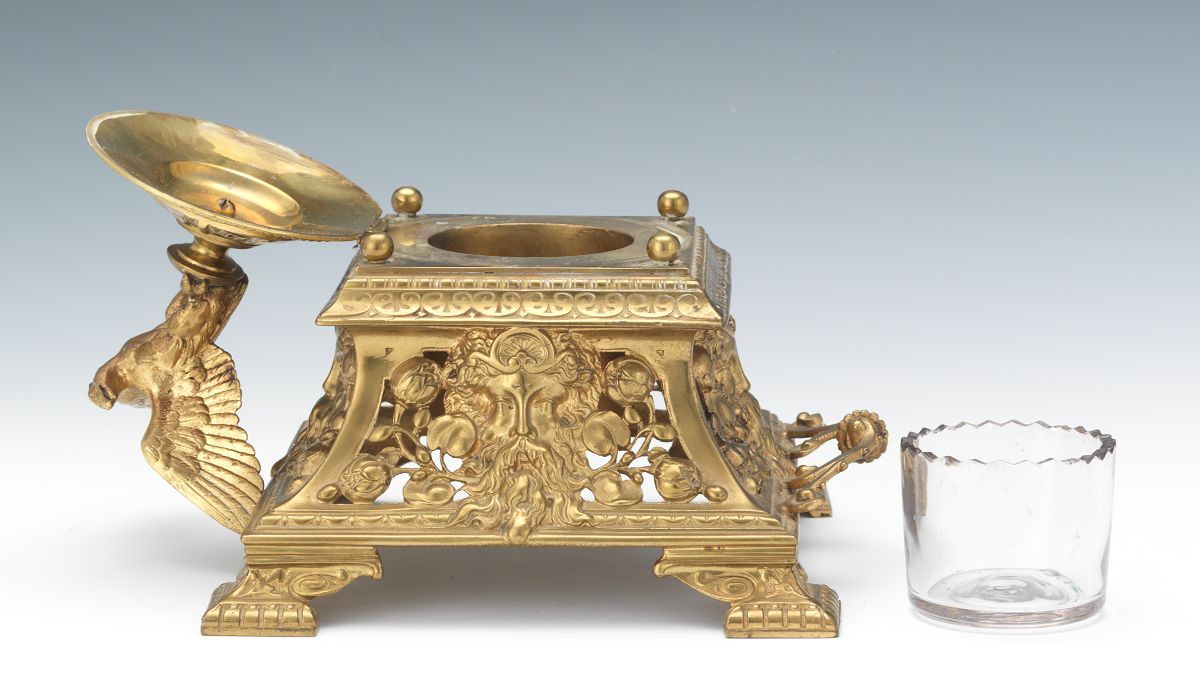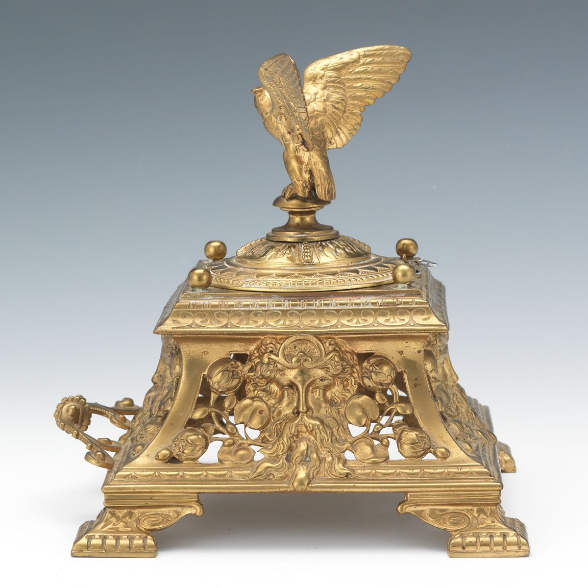 A large cast brass inkwell surmounted by a spread-winged eagle on the hinged lid. Intricately cast side panels feature mythological faces. Stamped “Registered” underneath. Missing hinge pin.