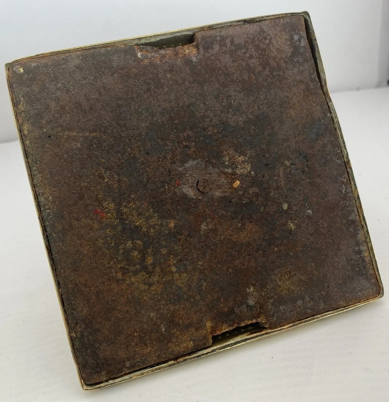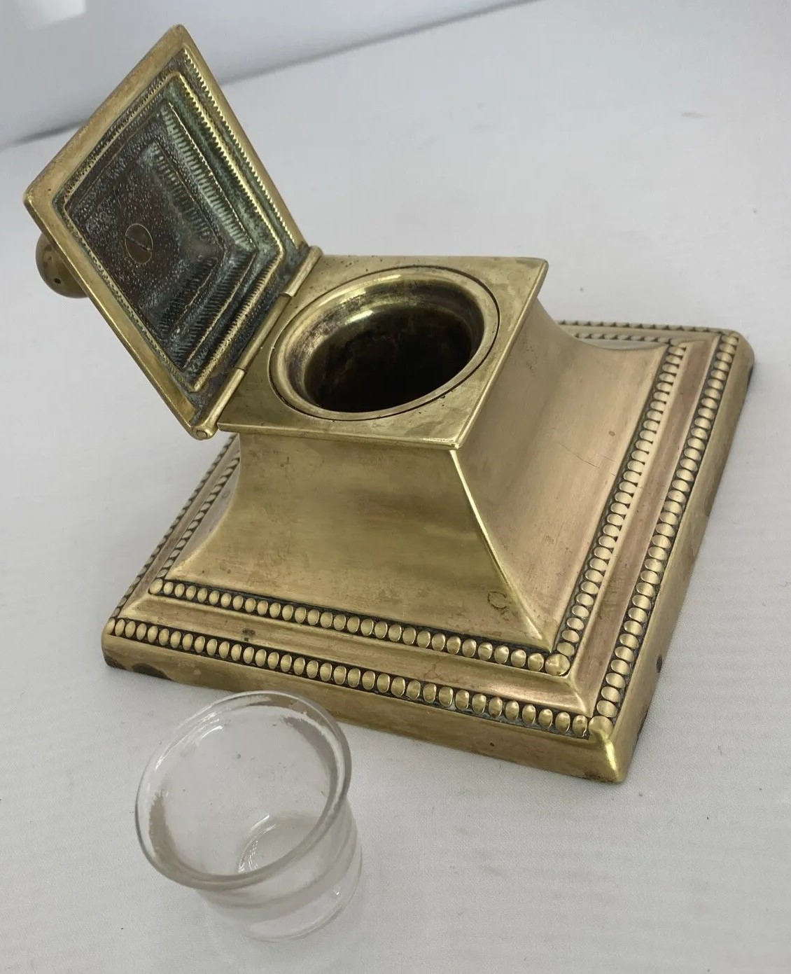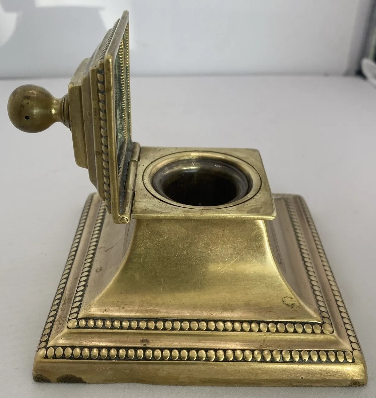 A brass inkwell with a square-on-square base adorned with beading along the edges. The matching lid with a ball finial is hinged.