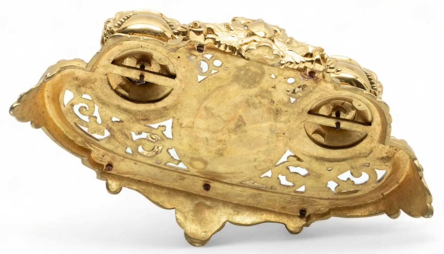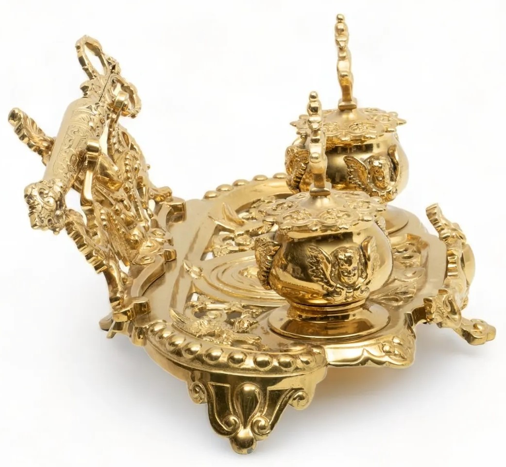 This brass standish with a pierced base and a backsplash with griffins holds two hinged inkwells with angel designs in relief. The set also includes a sheath holding a letter opener and scissors. The scissors are stamped “Germany”.