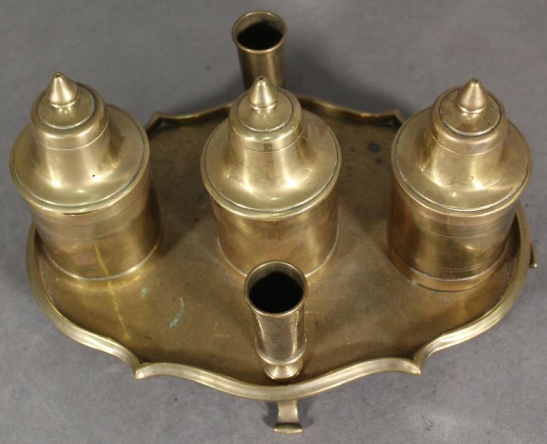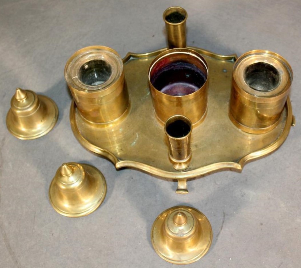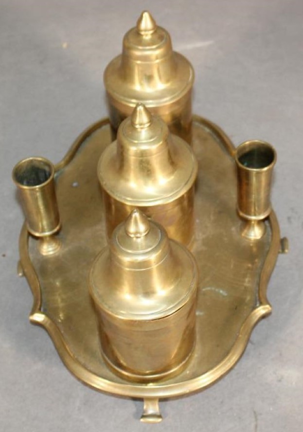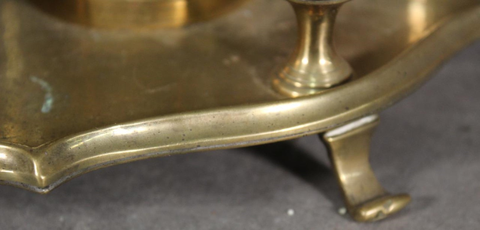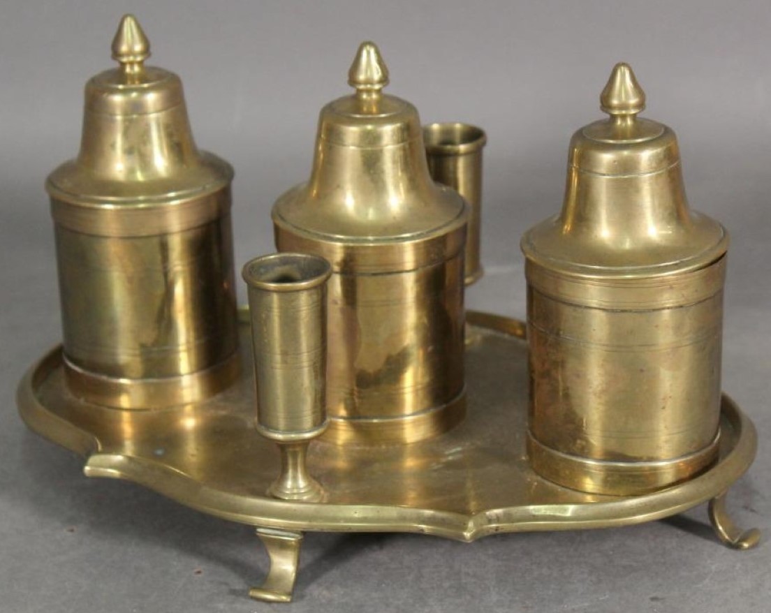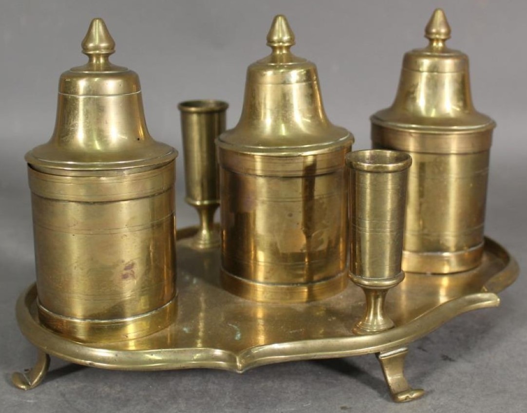 A brass standish – probably English made for the American colonial market circa 1780-1820. The base plate is scalloped and scrolled with a decorative raised lip. It rests on its original feet. The canisters are stationary. Two of the canisters are inkwells. The third was for storage – perhaps for wafers. All three have original lids with turned top finials. One of the glass ink pots is original with a bottom pontil and the other is a later 19th century replacement. Two attached candle holders complete the piece.