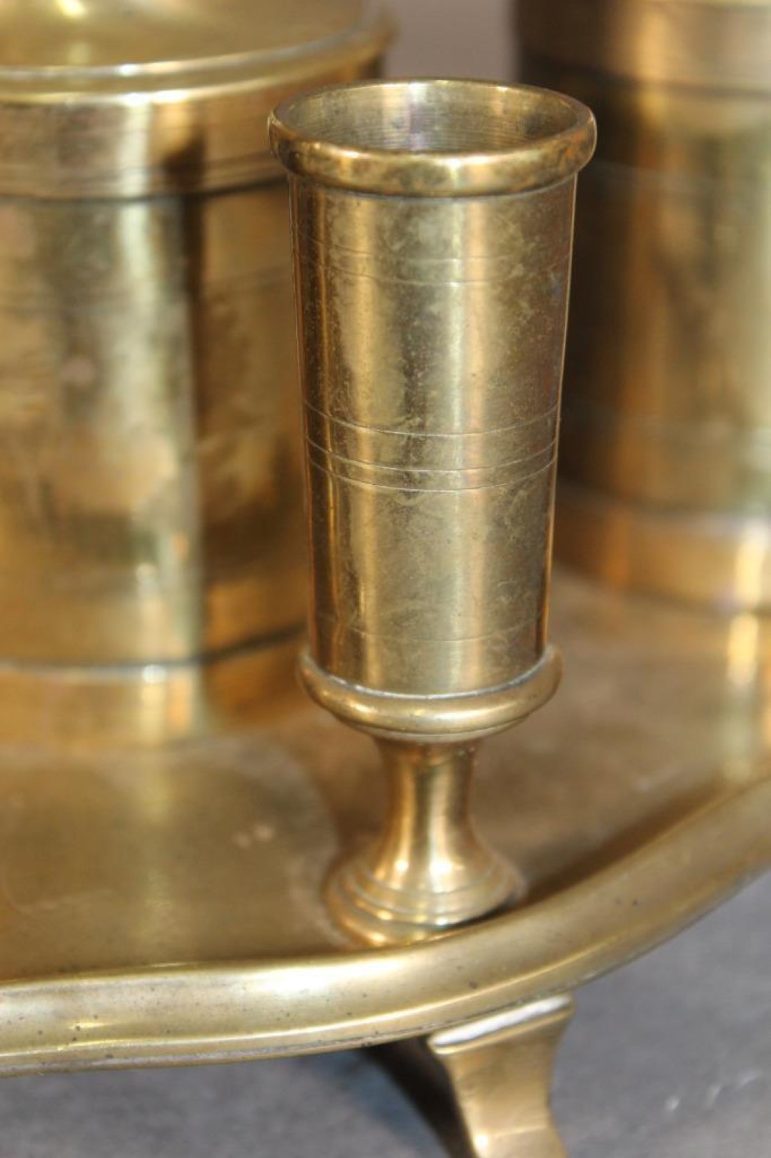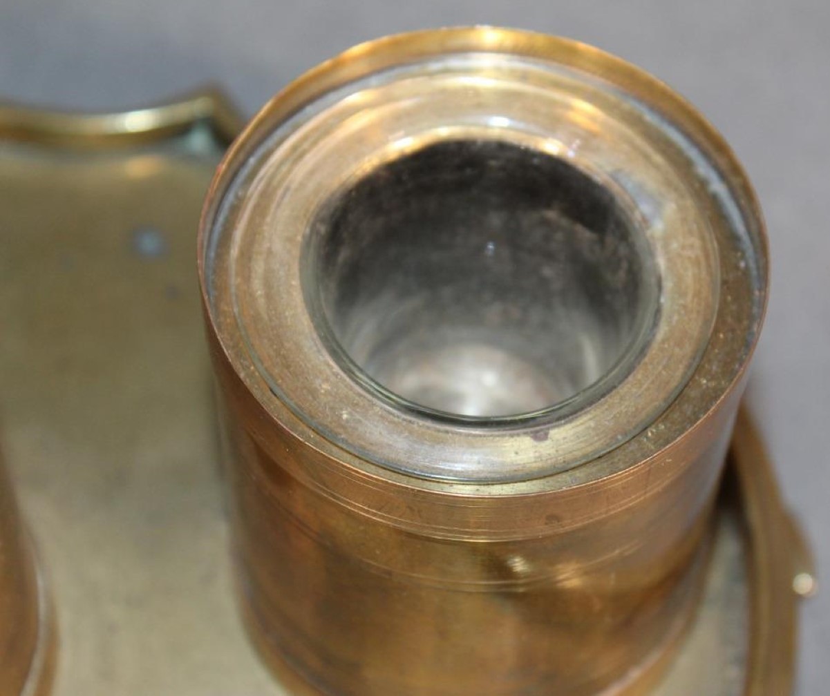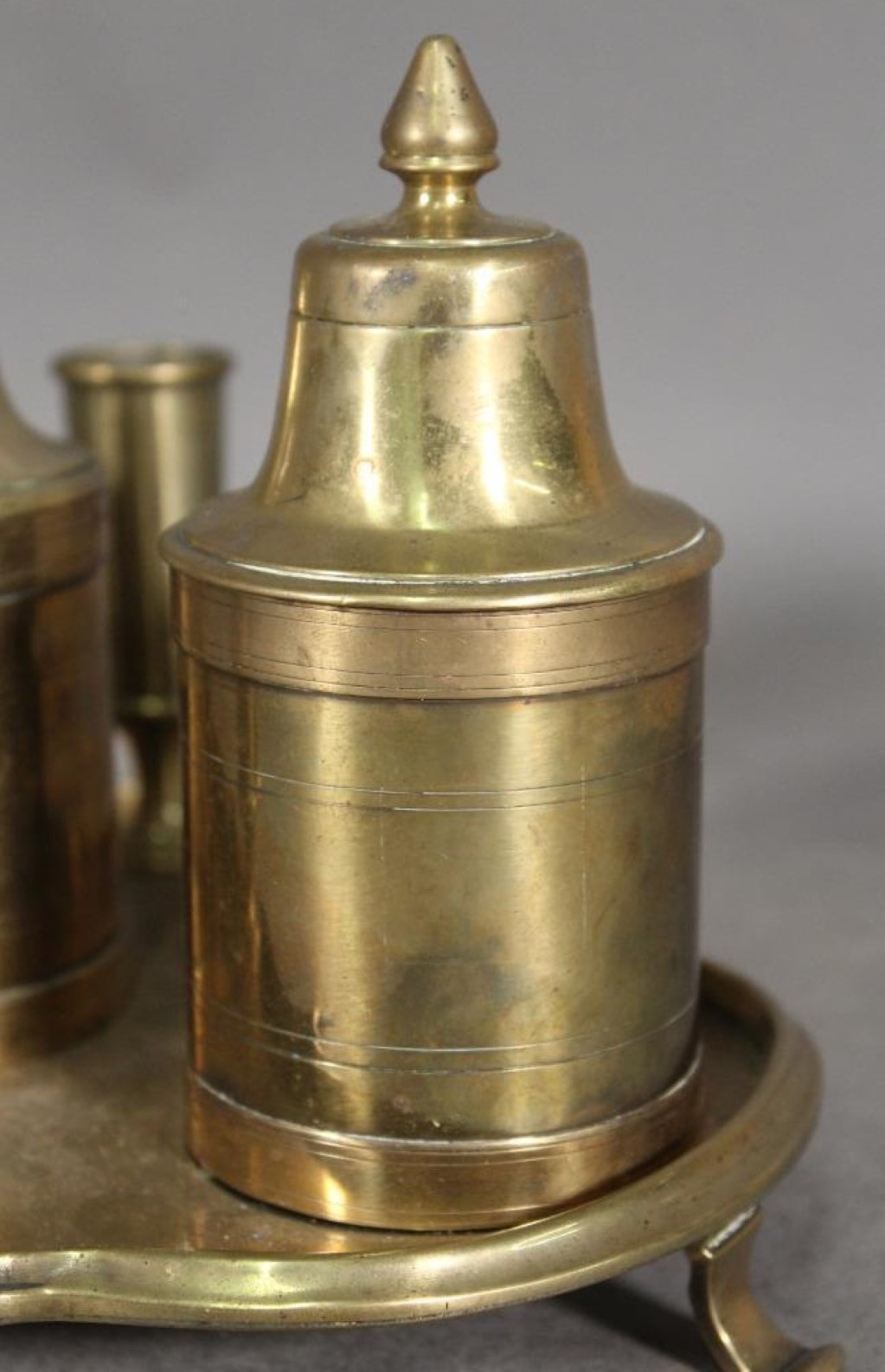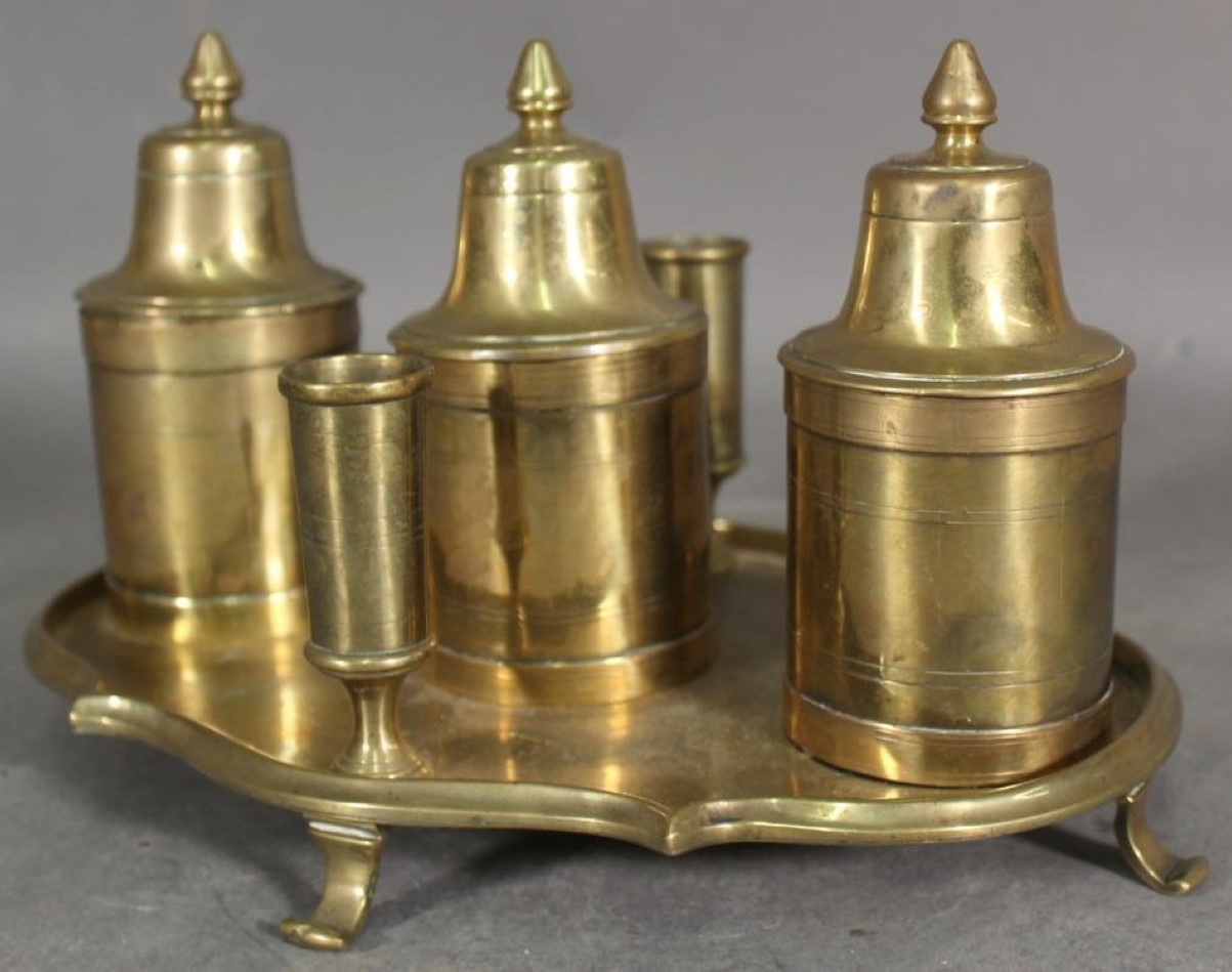 A brass standish – probably English made for the American colonial market circa 1780-1820. The base plate is scalloped and scrolled with a decorative raised lip. It rests on its original feet. The canisters are stationary. Two of the canisters are inkwells. The third was for storage – perhaps for wafers. All three have original lids with turned top finials. One of the glass ink pots is original with a bottom pontil and the other is a later 19th century replacement. Two attached candle holders complete the piece.