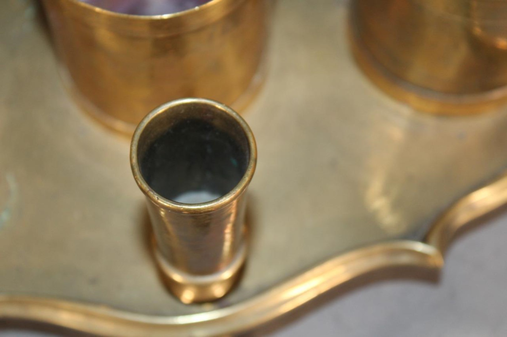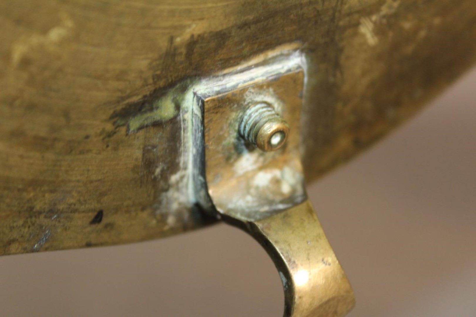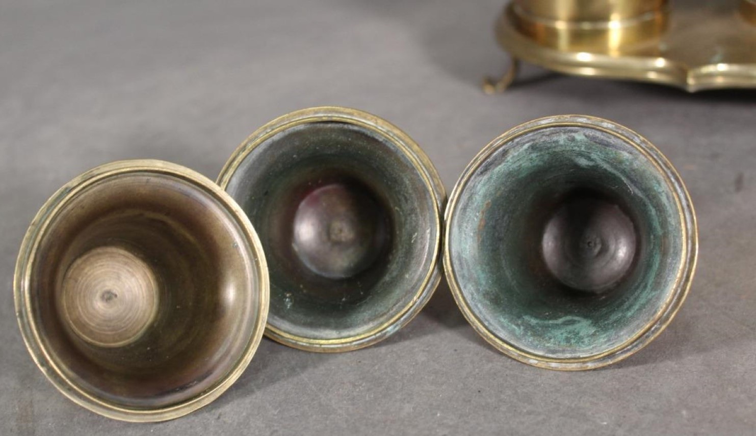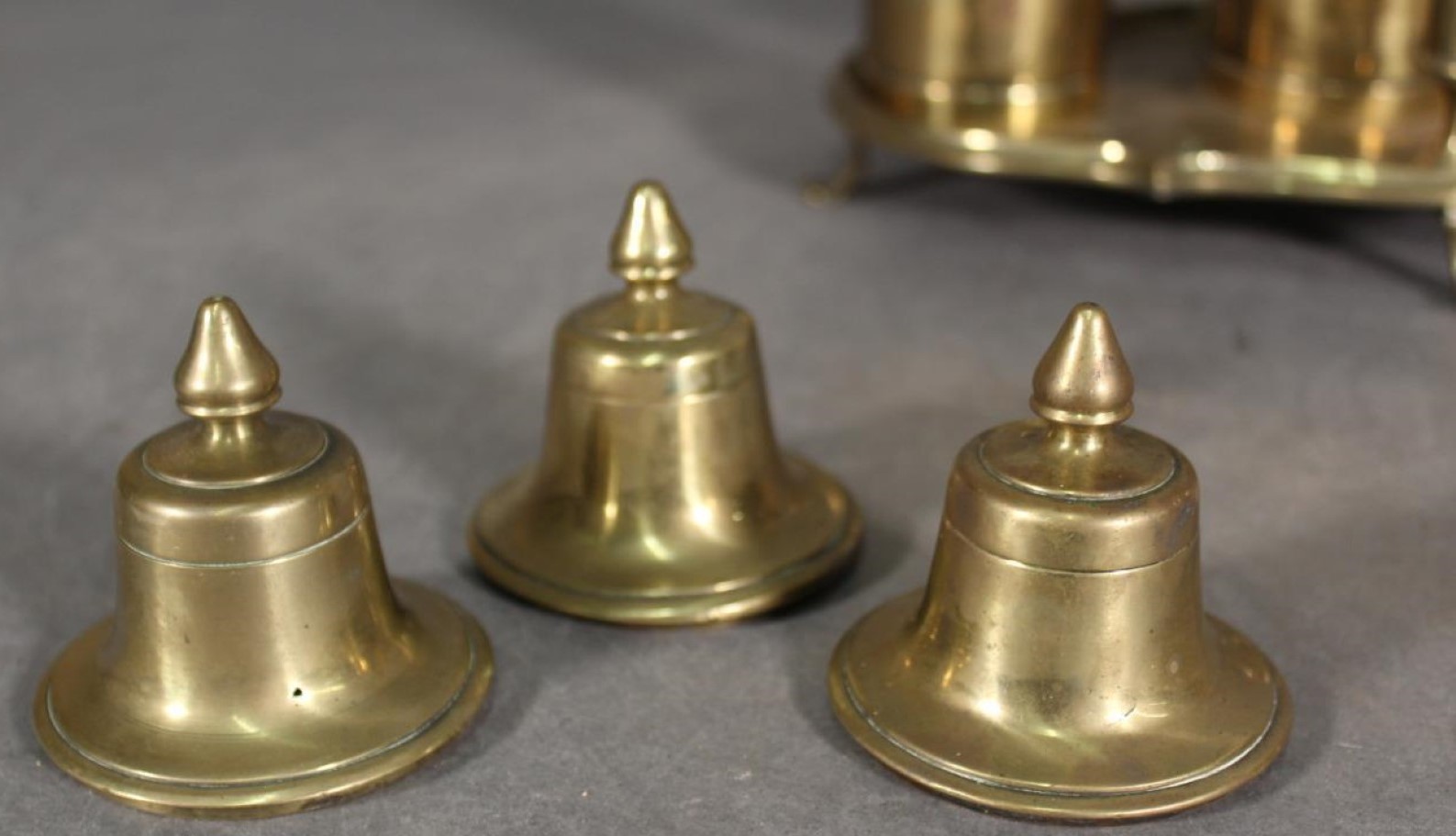 A brass standish – probably English made for the American colonial market circa 1780-1820. The base plate is scalloped and scrolled with a decorative raised lip. It rests on its original feet. The canisters are stationary. Two of the canisters are inkwells. The third was for storage – perhaps for wafers. All three have original lids with turned top finials. One of the glass ink pots is original with a bottom pontil and the other is a later 19th century replacement. Two attached candle holders complete the piece.