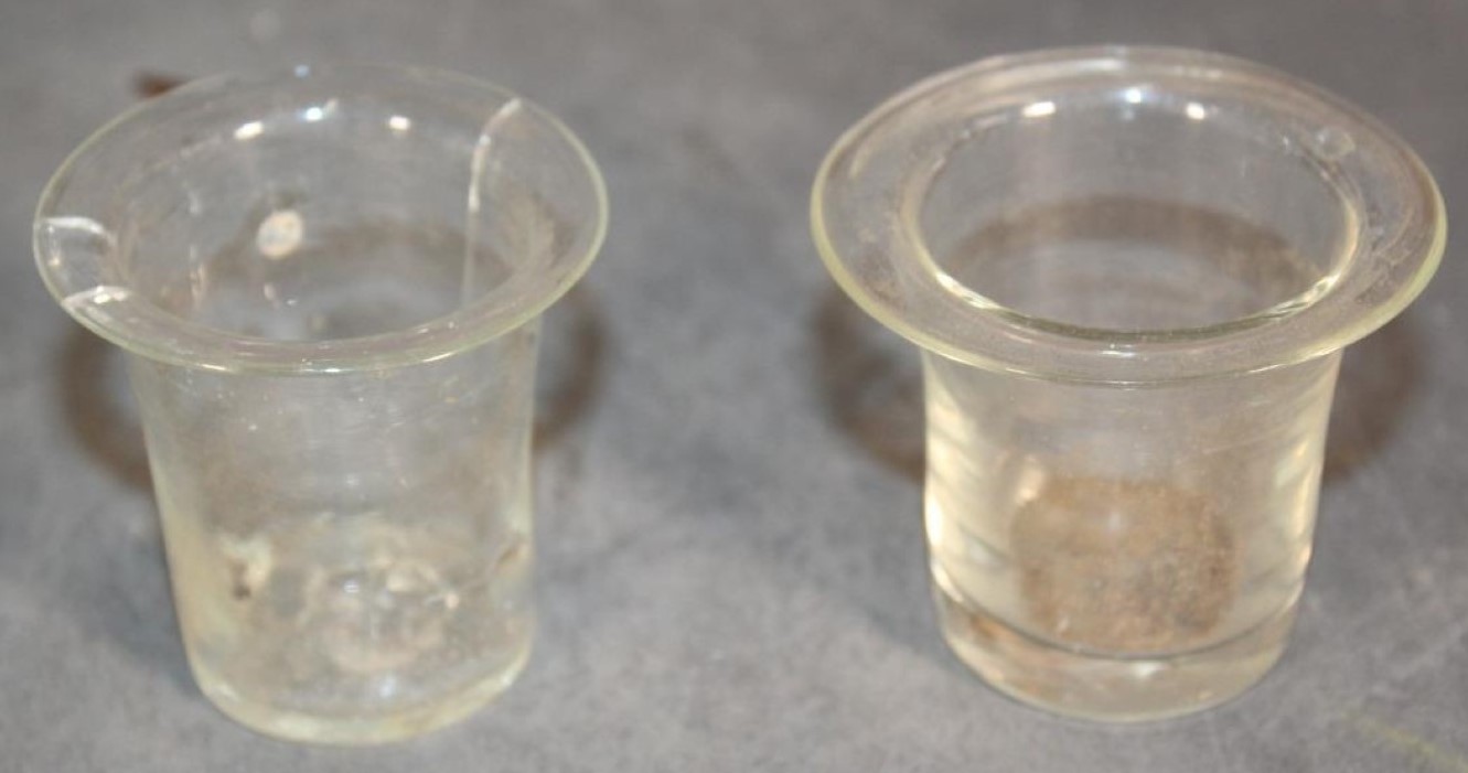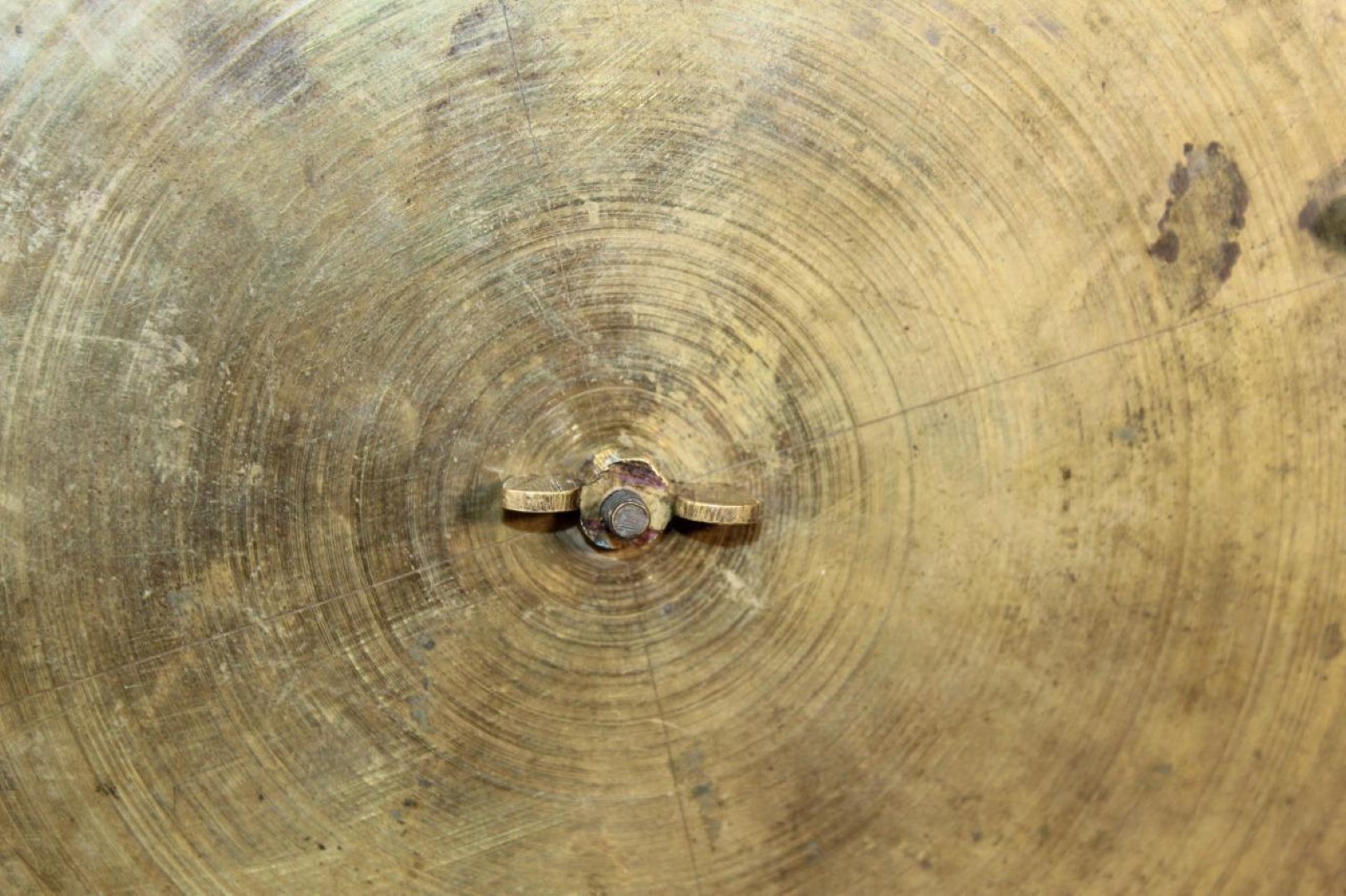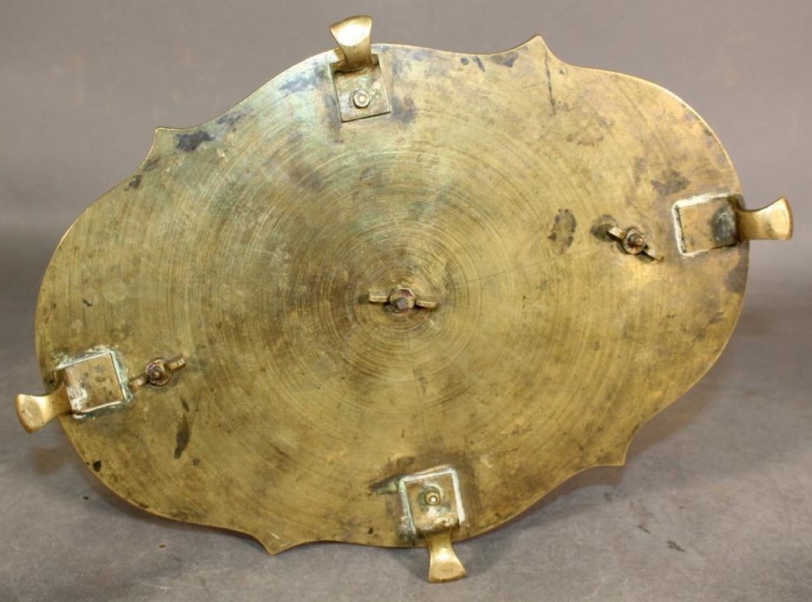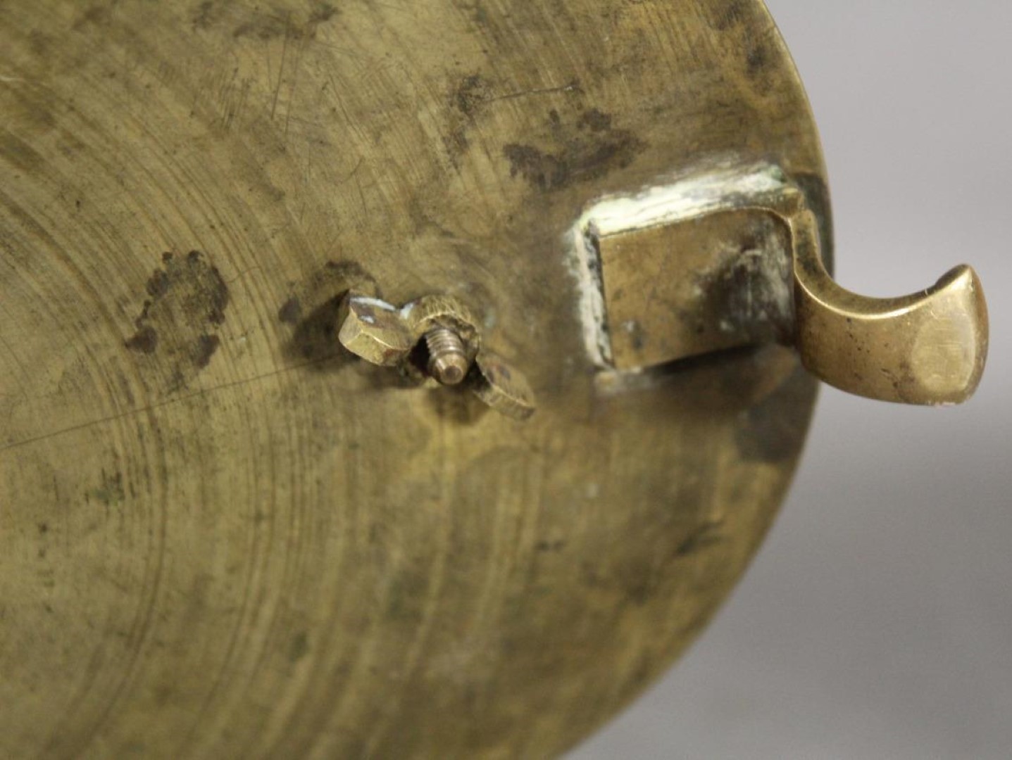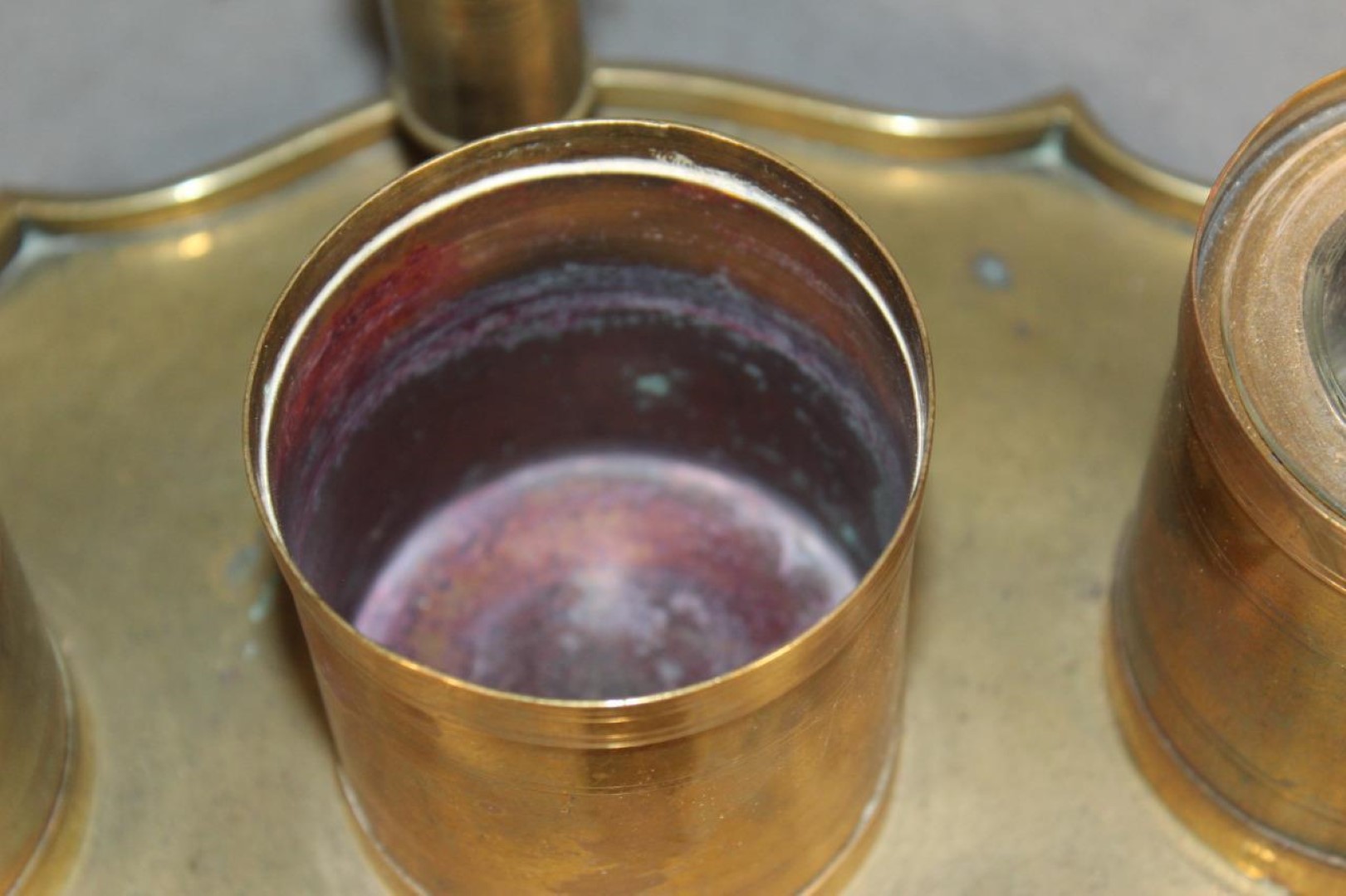 A brass standish – probably English made for the American colonial market circa 1780-1820. The base plate is scalloped and scrolled with a decorative raised lip. It rests on its original feet. The canisters are stationary. Two of the canisters are inkwells. The third was for storage – perhaps for wafers. All three have original lids with turned top finials. One of the glass ink pots is original with a bottom pontil and the other is a later 19th century replacement. Two attached candle holders complete the piece.