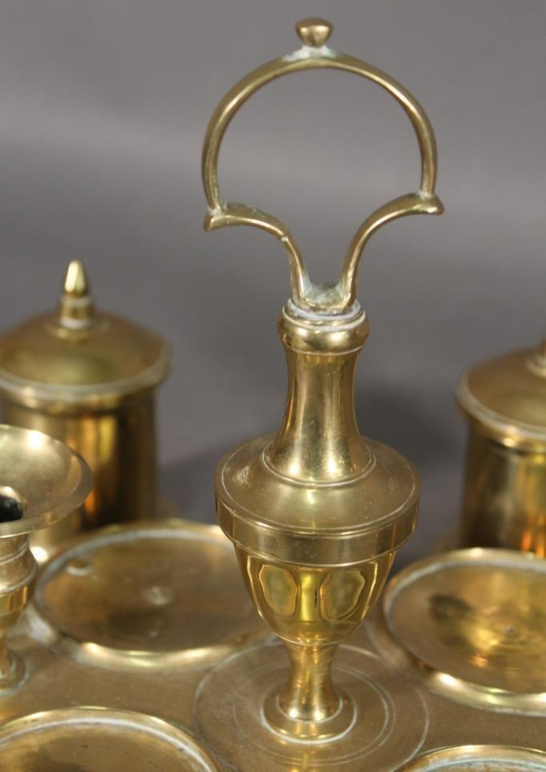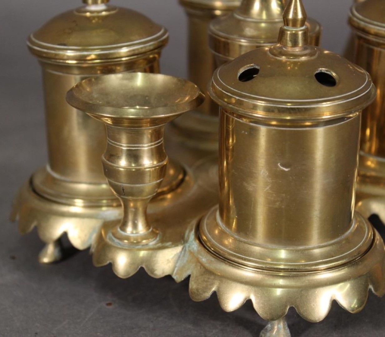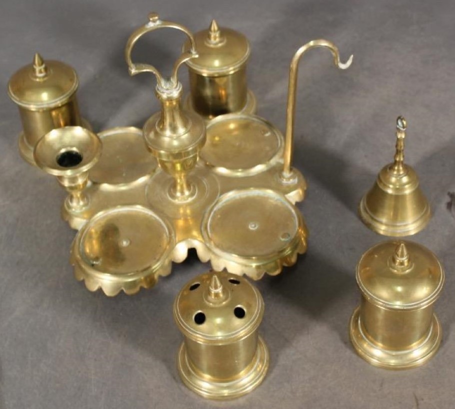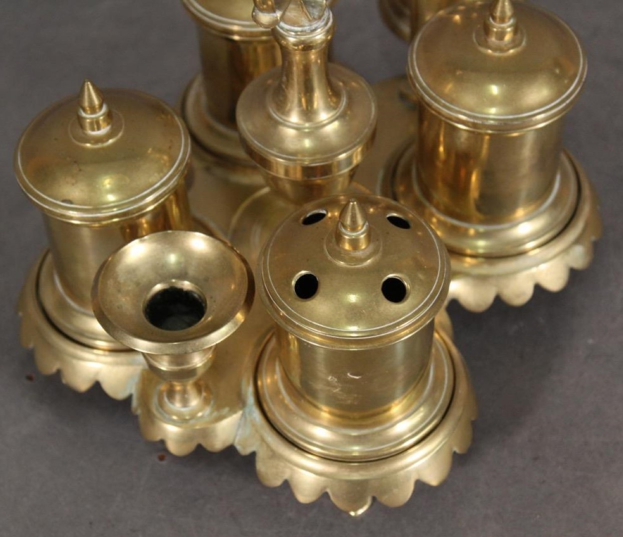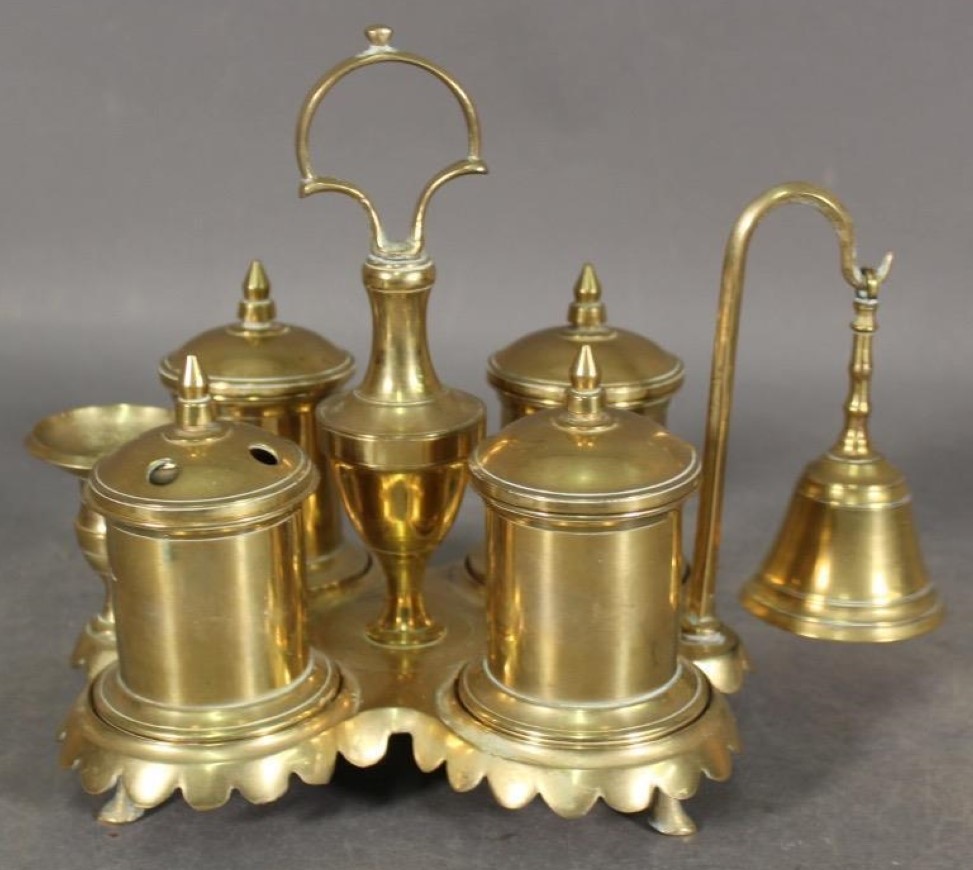 This late 18th century brass standish was probably made in England for the American market. The caster-type standish with a handle holds four cylindrical brass vessels with removeable lids – two inkwells, a sander, and a quill holder – that fit into the scalloped base. Attached is a candle holder and a bell holder with its original bell.