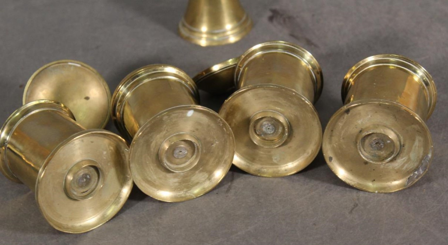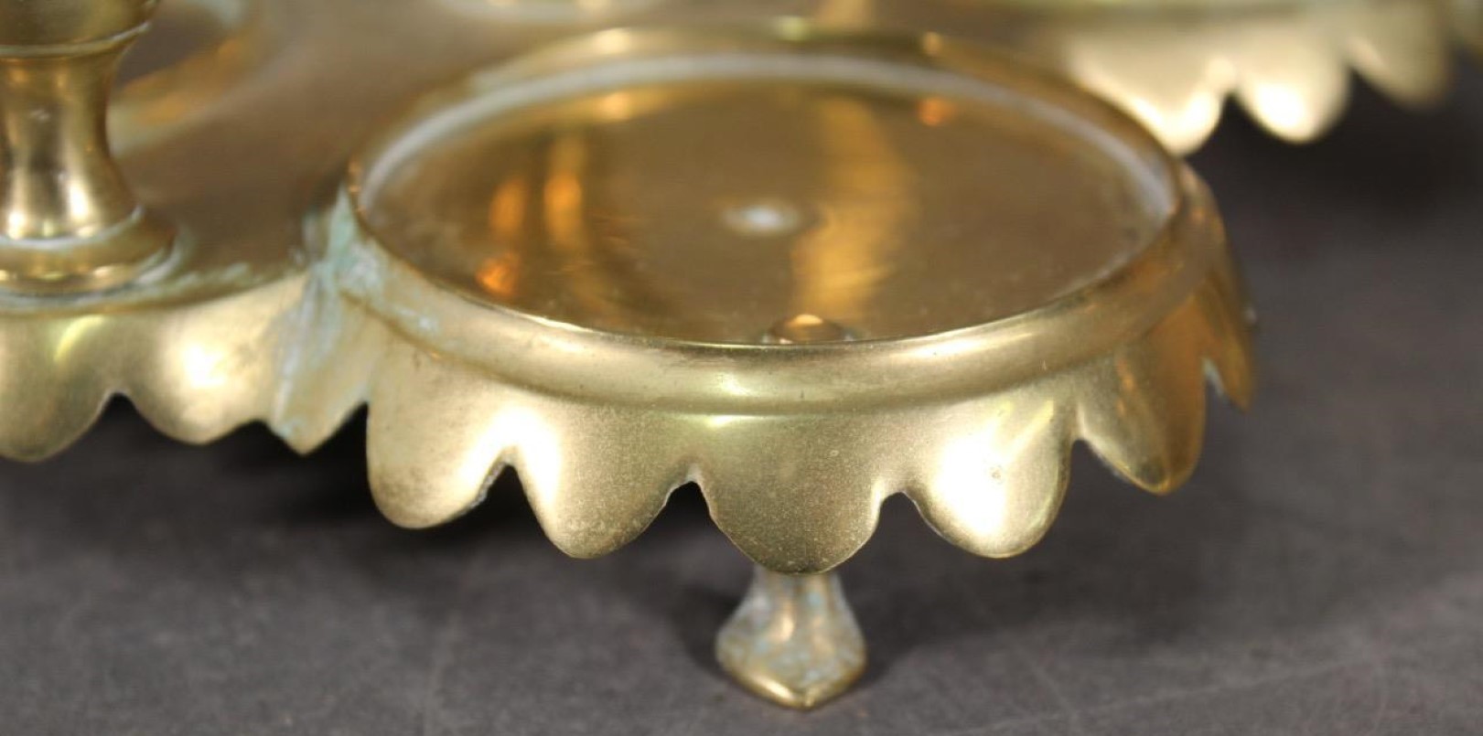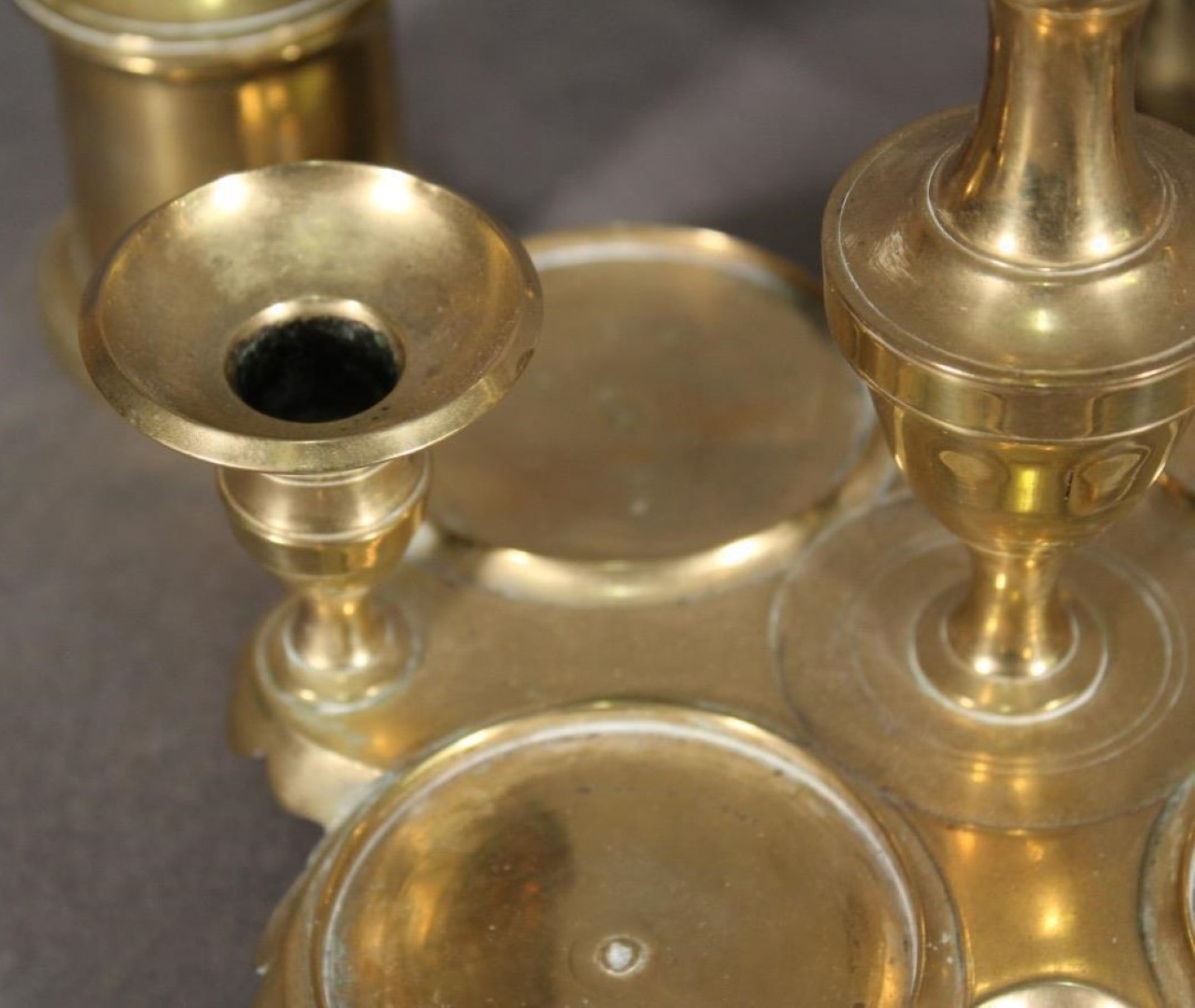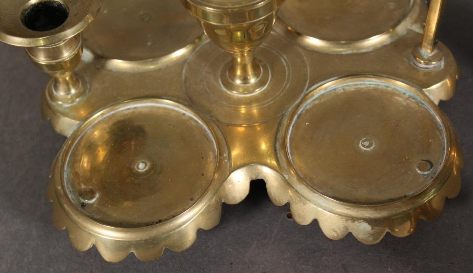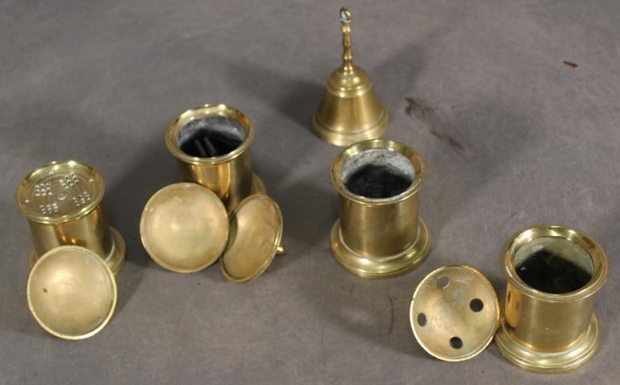 This late 18th century brass standish was probably made in England for the American market. The caster-type standish with a handle holds four cylindrical brass vessels with removeable lids – two inkwells, a sander, and a quill holder – that fit into the scalloped base. Attached is a candle holder and a bell holder with its original bell.