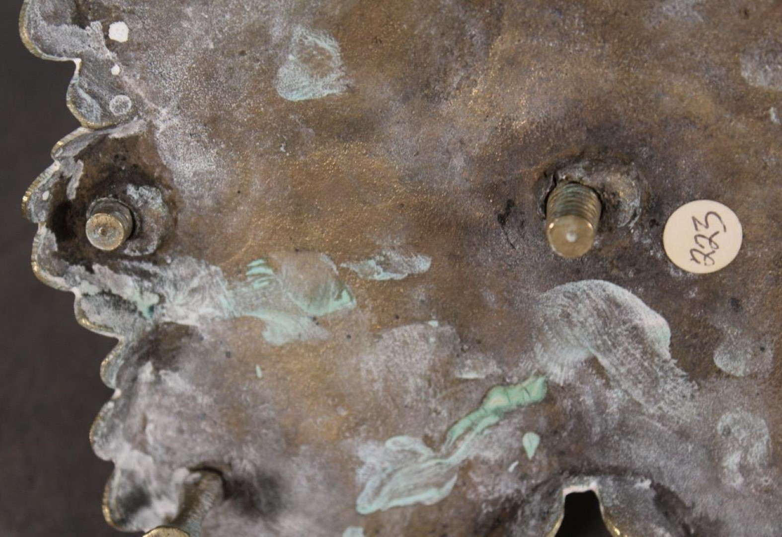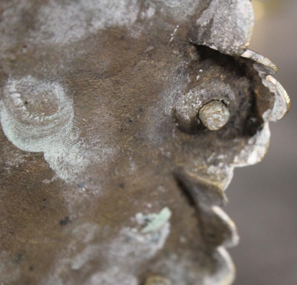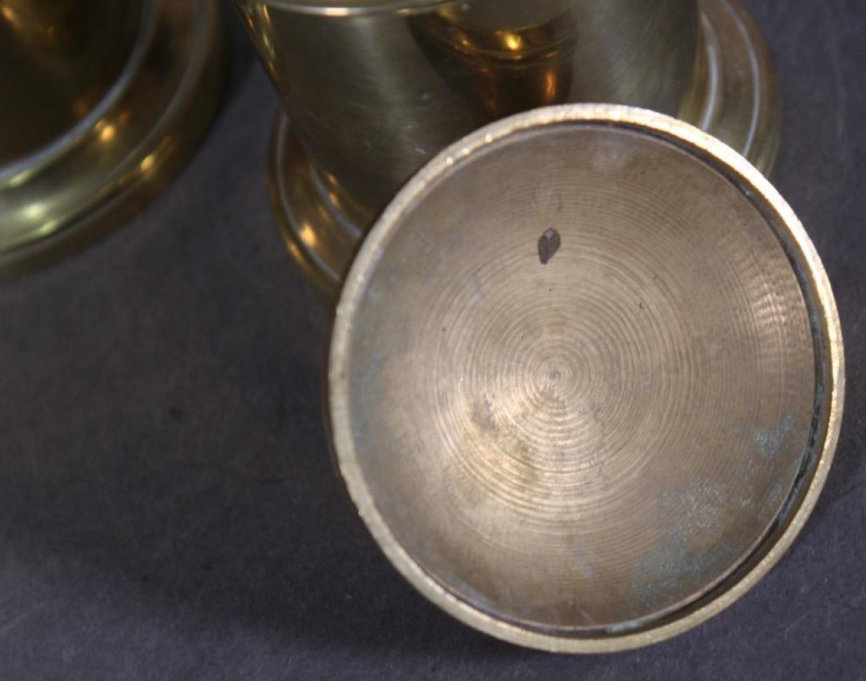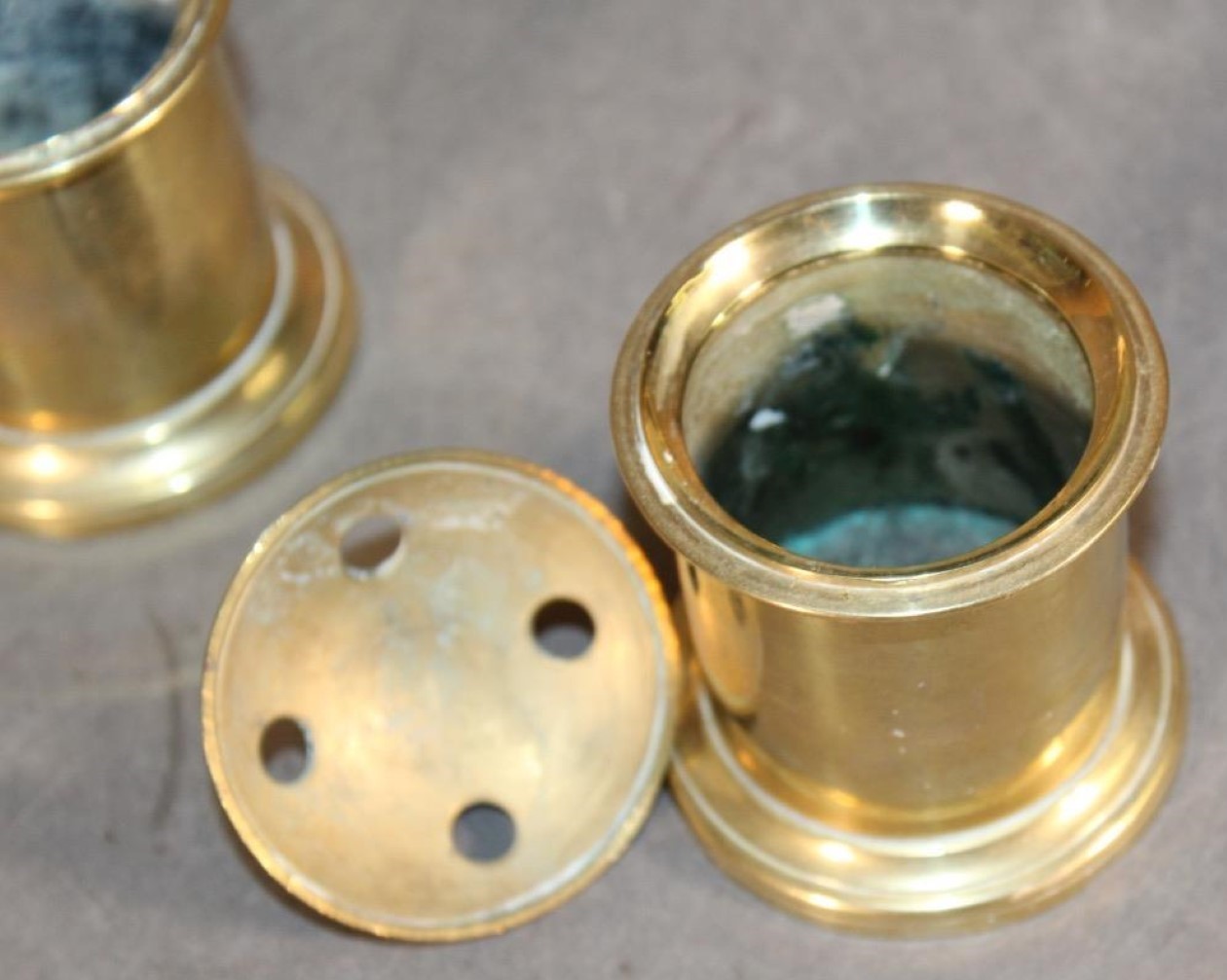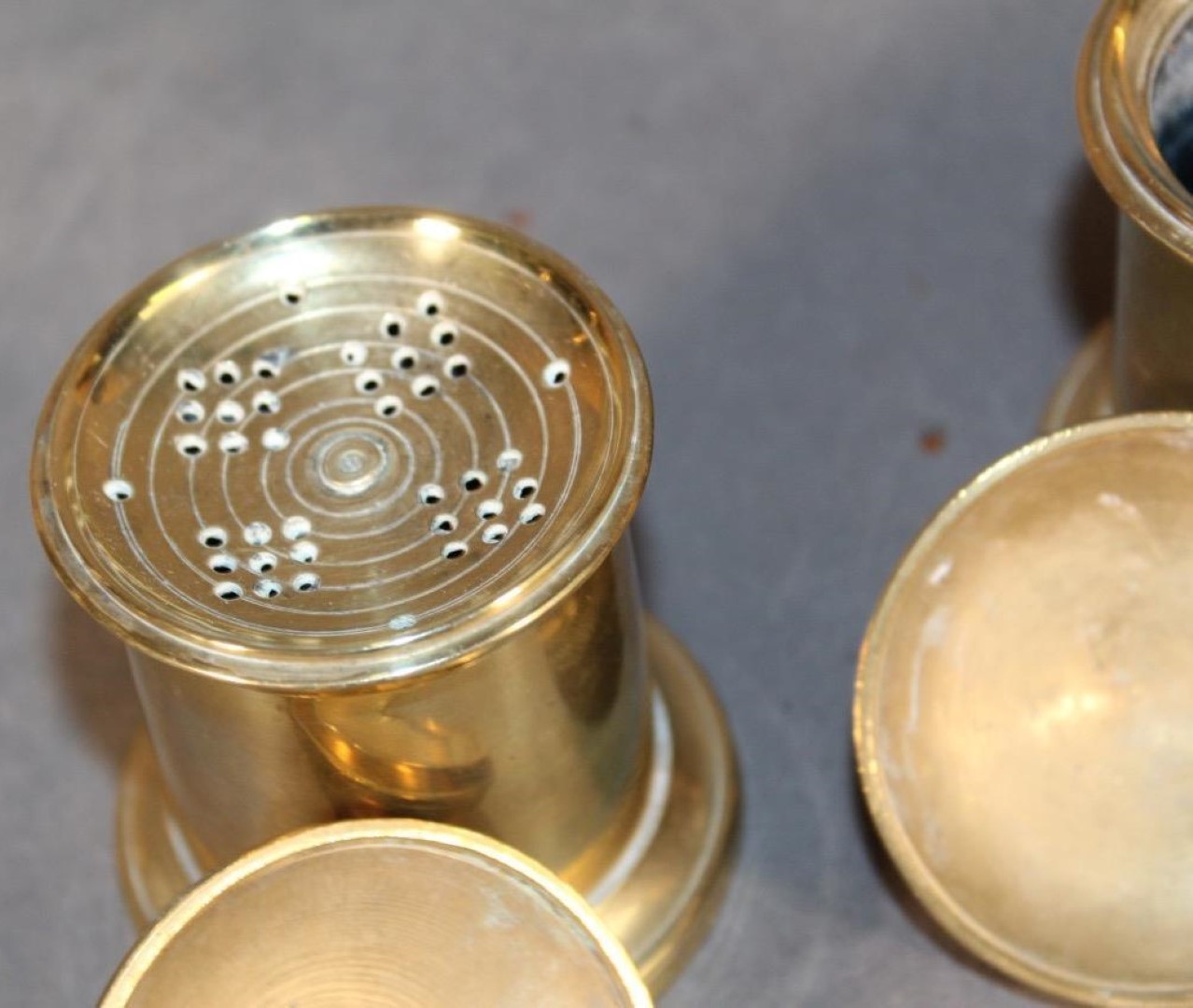 This late 18th century brass standish was probably made in England for the American market. The caster-type standish with a handle holds four cylindrical brass vessels with removeable lids – two inkwells, a sander, and a quill holder – that fit into the scalloped base. Attached is a candle holder and a bell holder with its original bell.