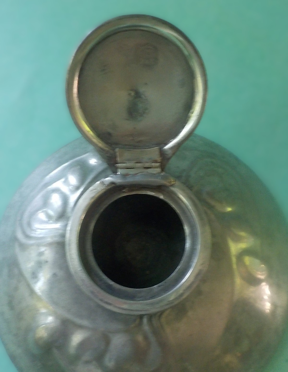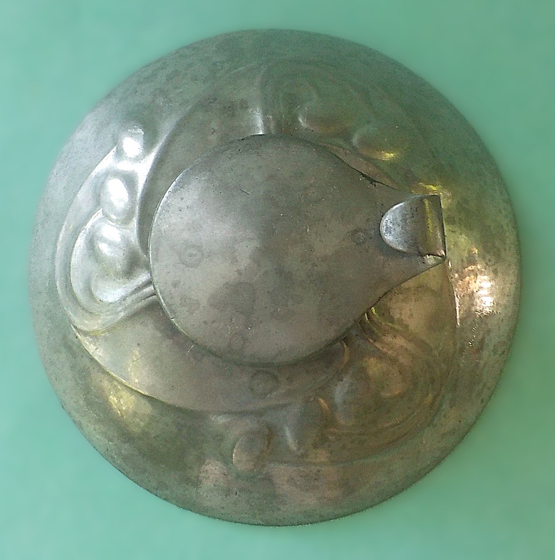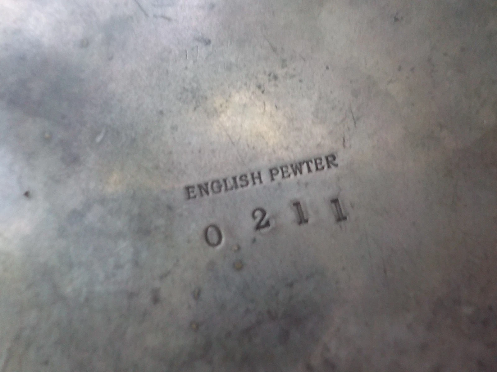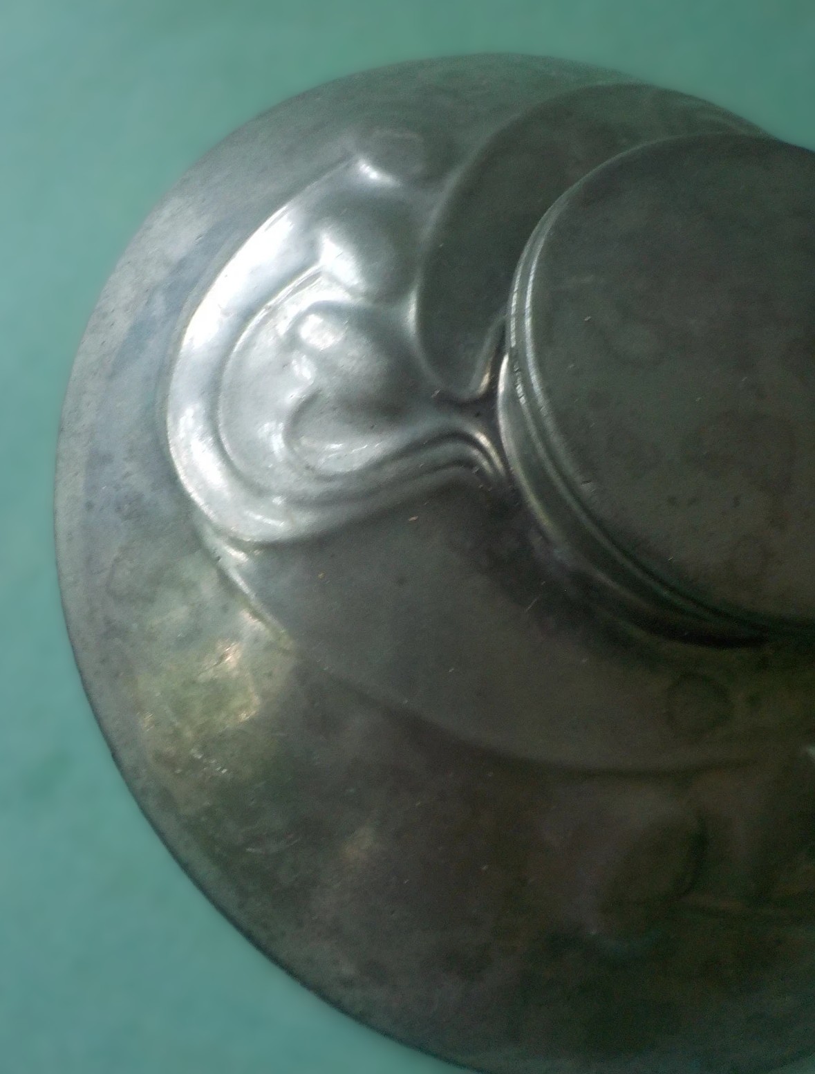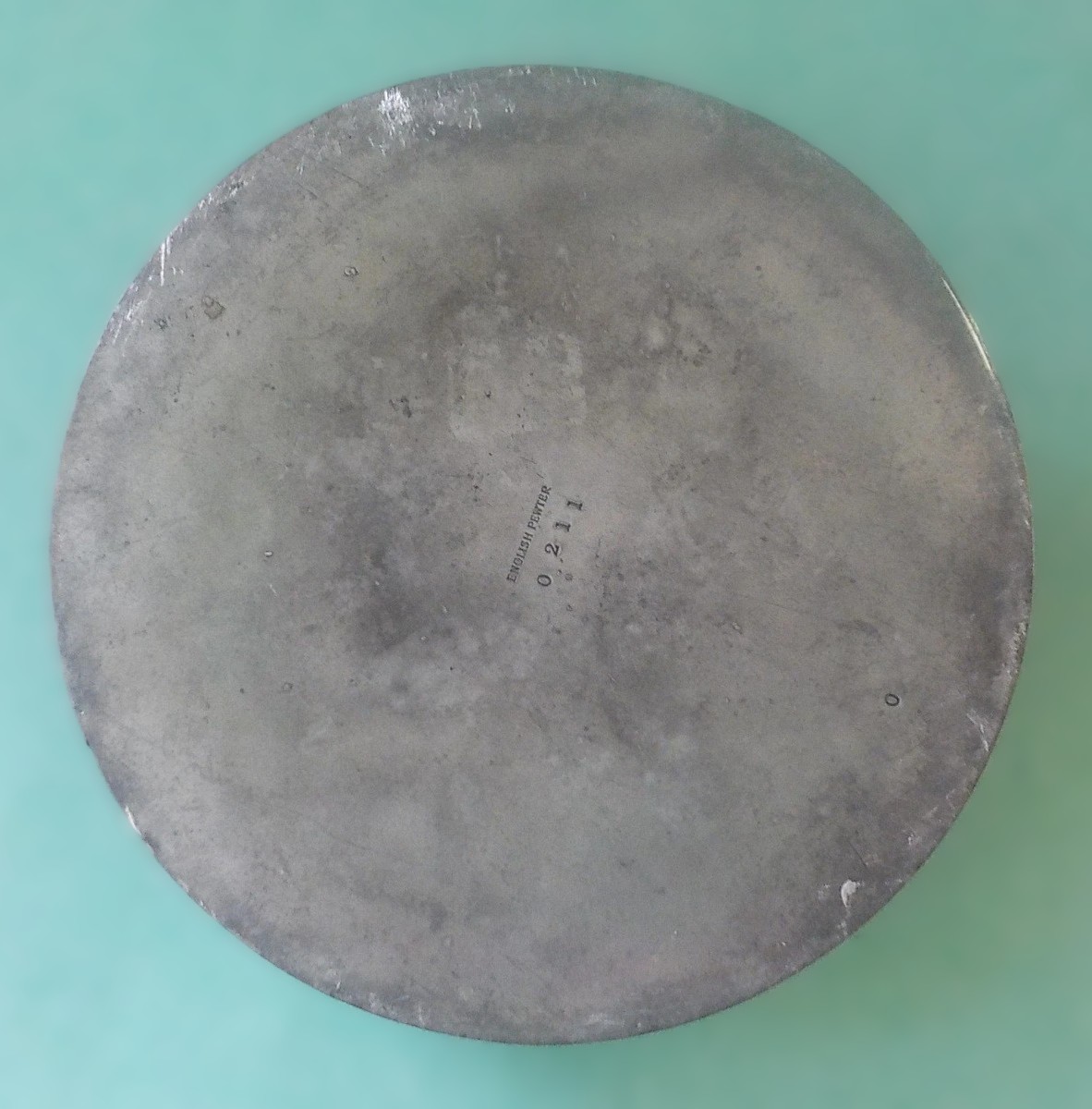 The underside is impressed with the markings “English Pewter 0211” and the letter “O”. The number 0211 is the specific model number for this design. The mark “English Pewter” indicates it is from the “Tudric” line produced by Liberty & Co. The impressed letter “O” is a date letter used by the company to signify the year of production. The letter “O” in this specific series corresponds to the year 1905, placing the inkwell squarely within the height of the Art Nouveau period when Archibald Knox was designing for the company.
