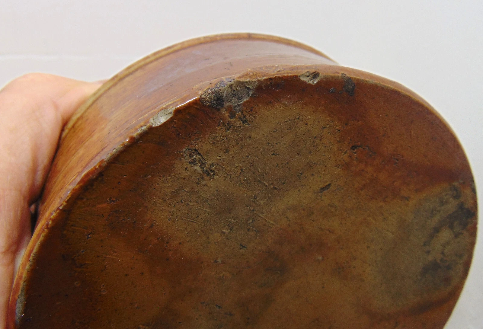 - Material and Glaze: The inkwell is crafted from stoneware, a robust and non-porous ceramic material. It features a characteristic salt glaze, which gives its surface a subtly textured, somewhat pebbled or “orange peel” finish, along with a slightly lustrous appearance. The color of the stoneware is a typical earthy tone, light brown.