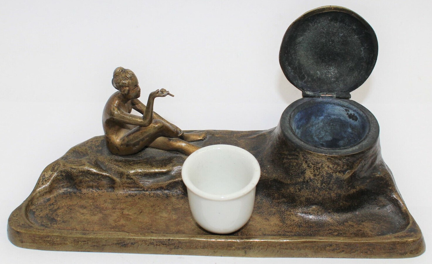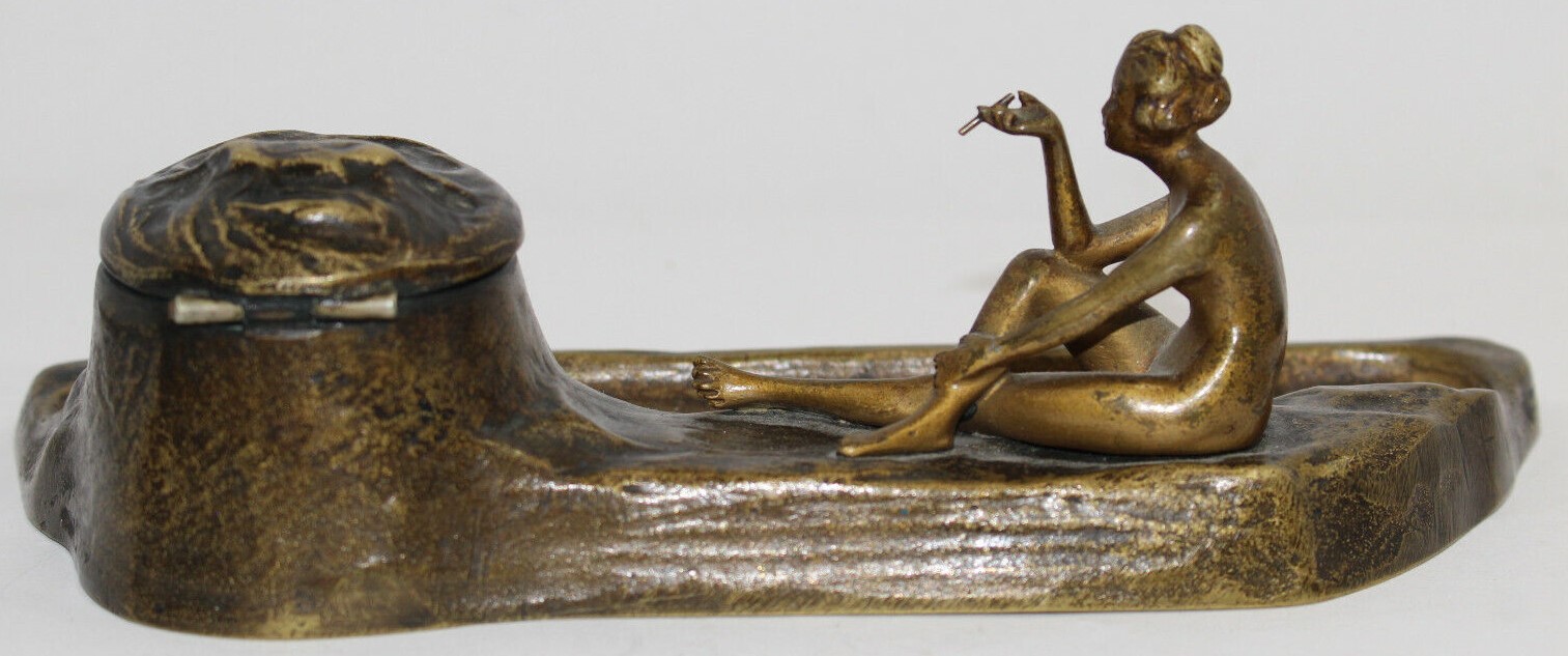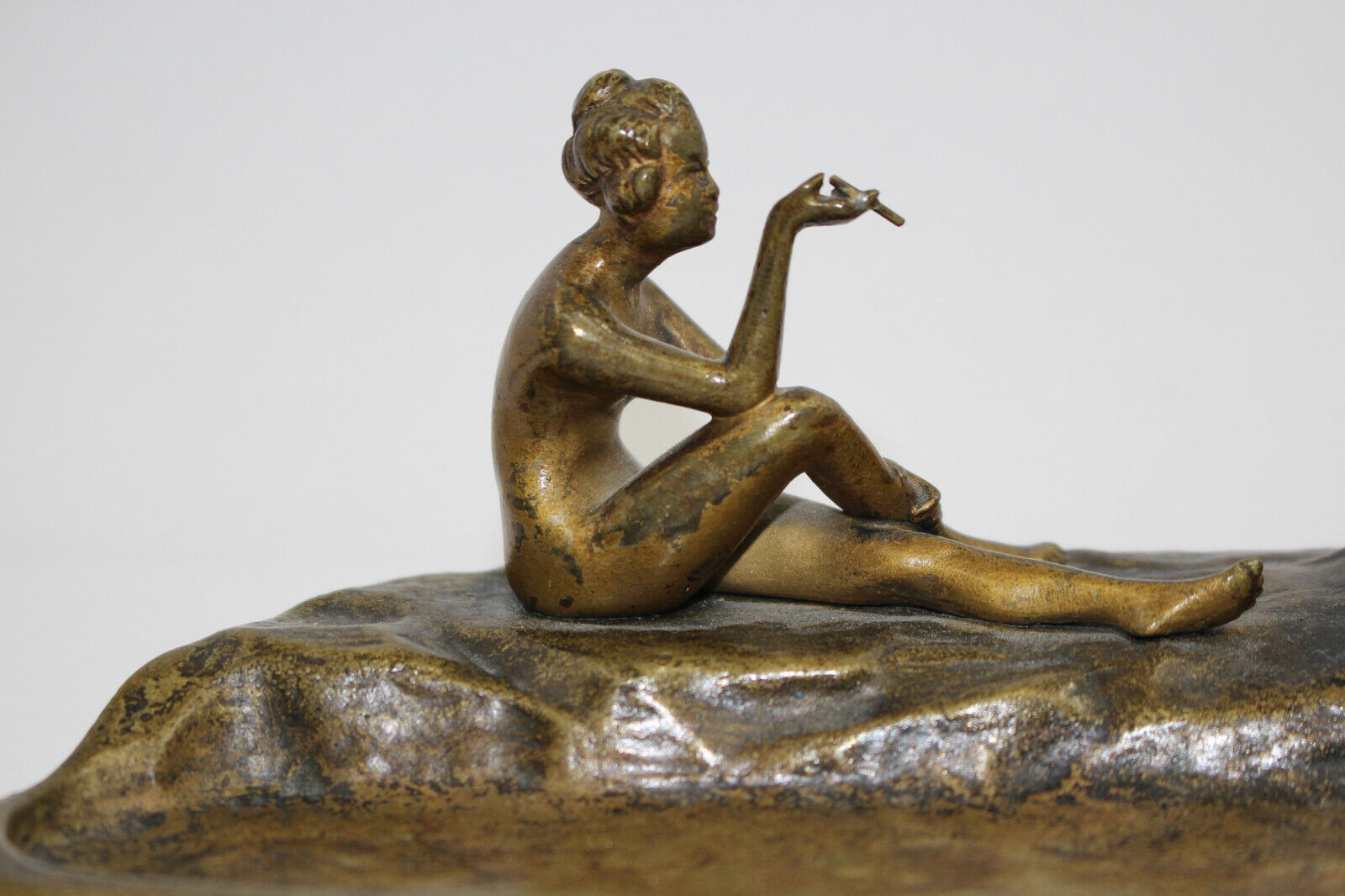 This bronze inkstand features a sculpted figure of a nude woman. She is seated, one leg tucked under her, and the other extended out. Her left hand is raised to her mouth with a cigarette. Opposite her is a mound which holds the inkwell. The front of the inkstand serves as a pen tray.
