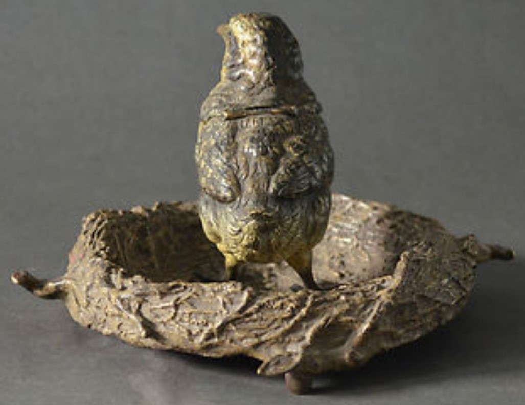 Cold painted Vienna bronze bird in its nest. The head is hinged and opens to the inkwell.