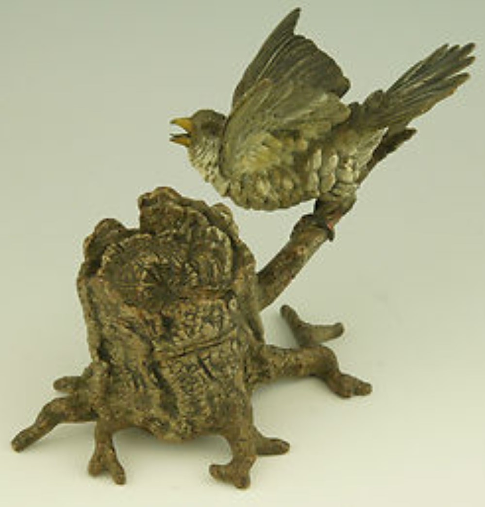 Cold painted bronze inkstand featuring a bird perched on a tree stump (which holds the inkwell).