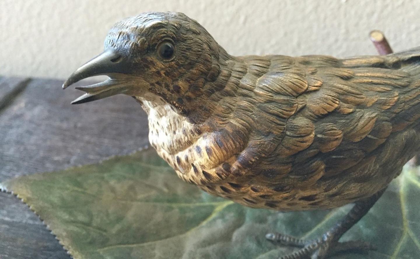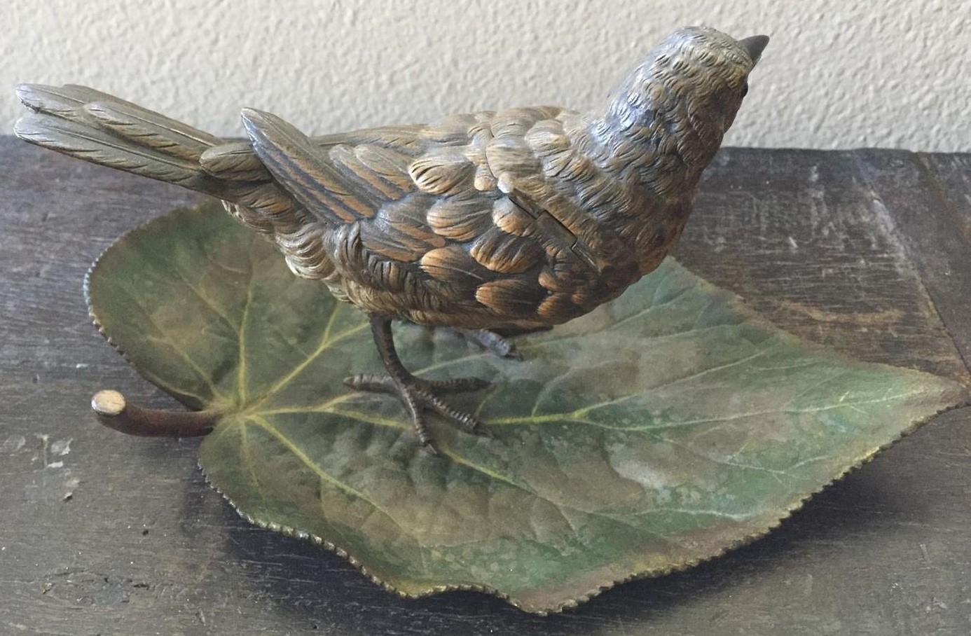 A cold painted bronze bird stands on a leaf. The hinged head opens to access the inkwell.