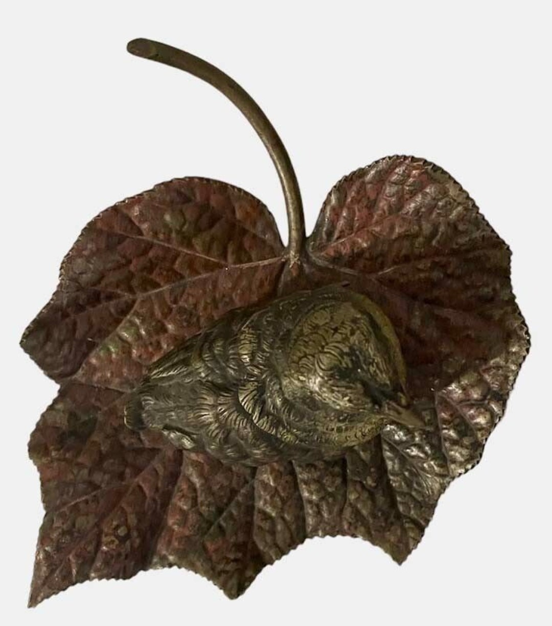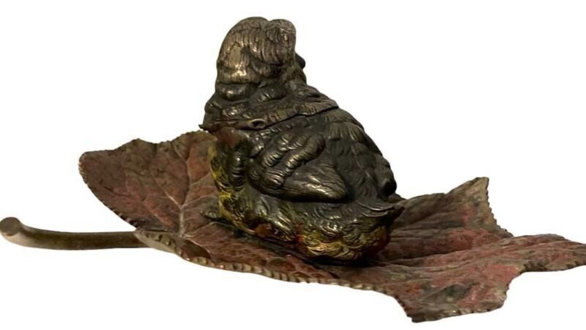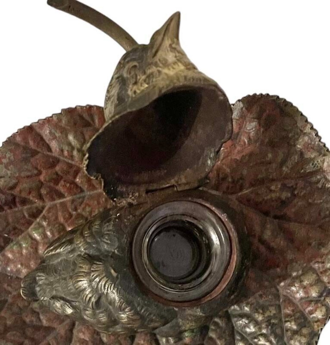 This bronze bird on a leaf is unmarked. The head is hinged and opens to access the inkwell. Two examples shown.