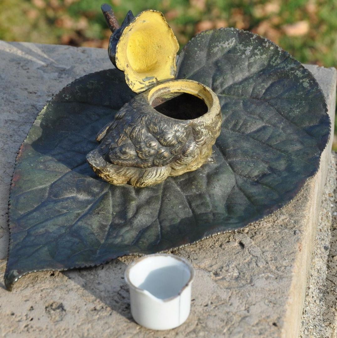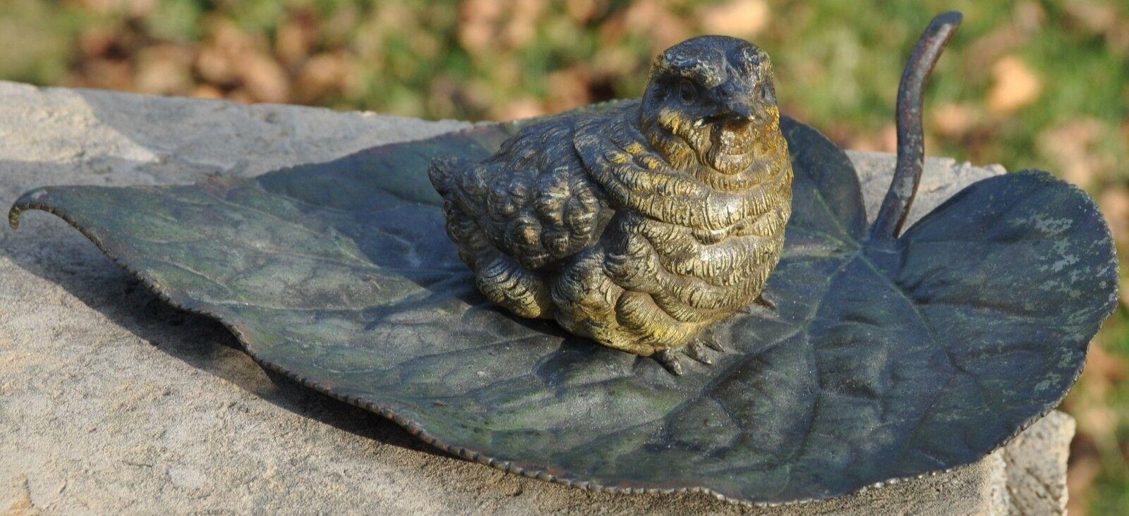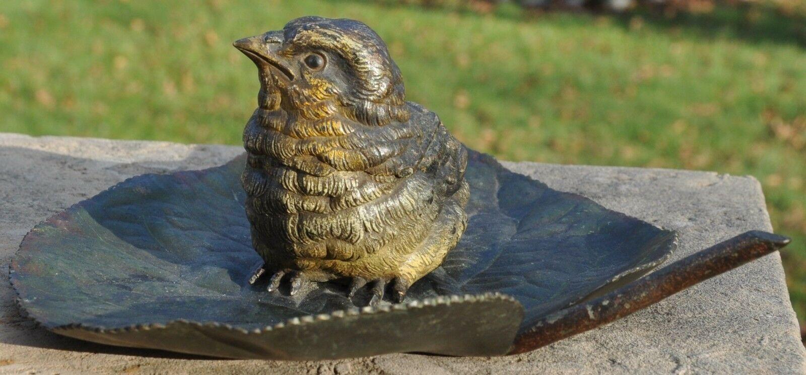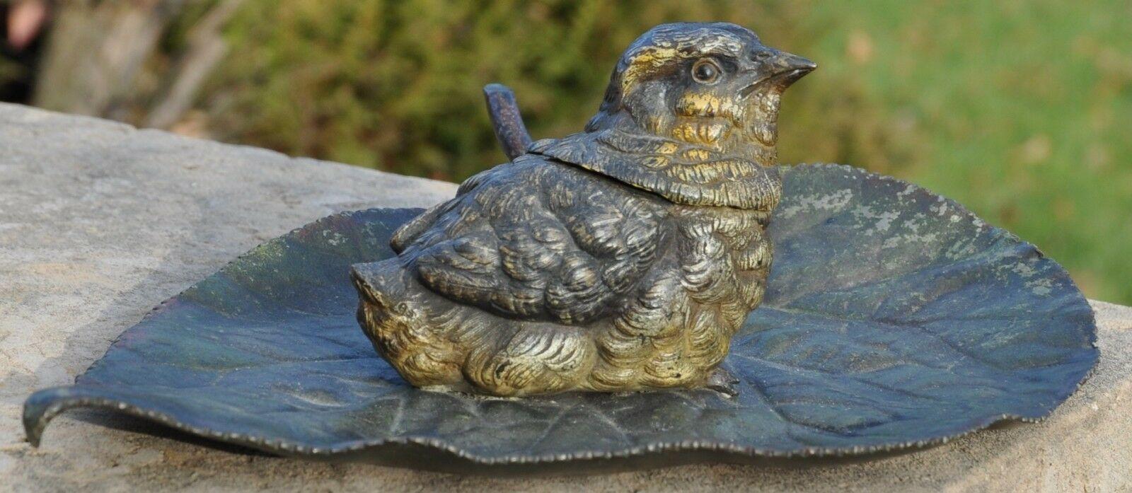 Realistic bronze depiction of a bird on a leaf. The bird’s head is hinged and opens to access the inkwell. The piece is marked “Geschutzt” followed by a 4-digit number.