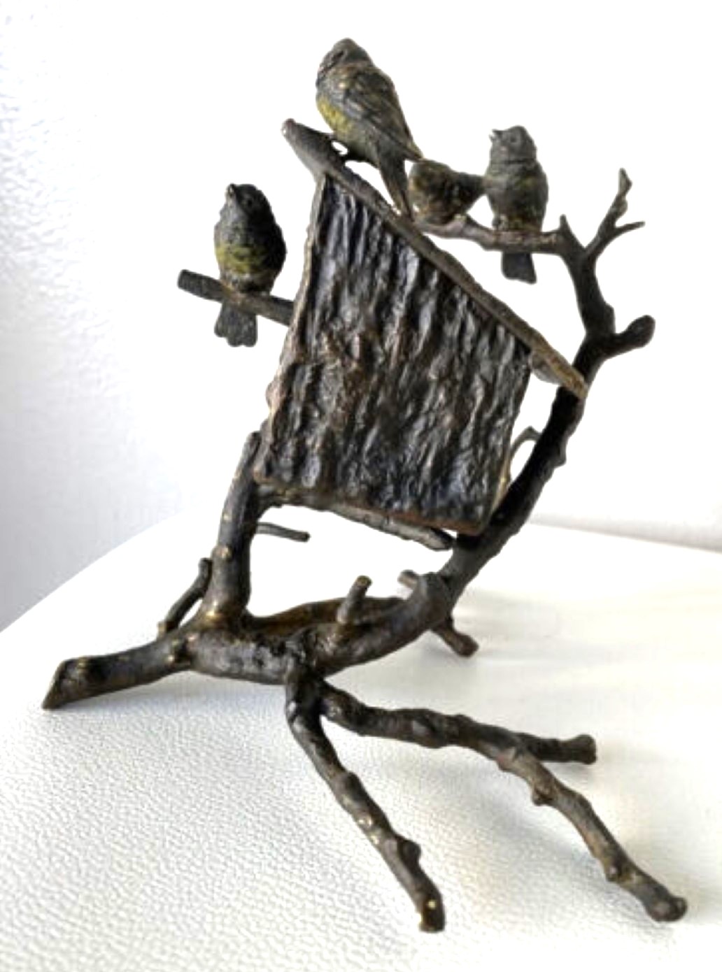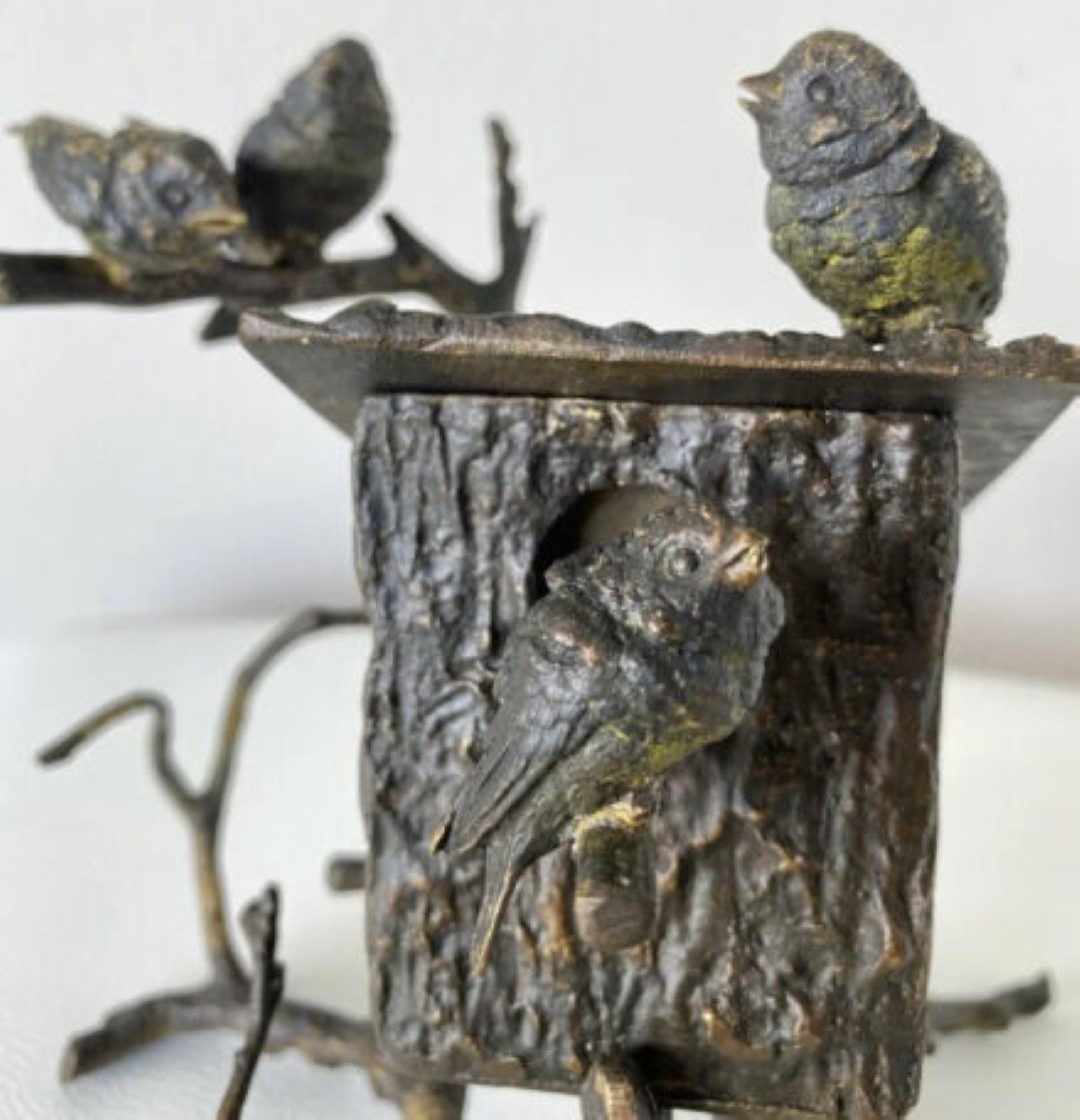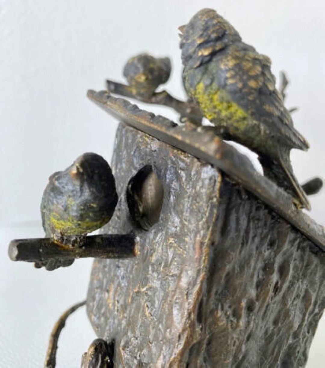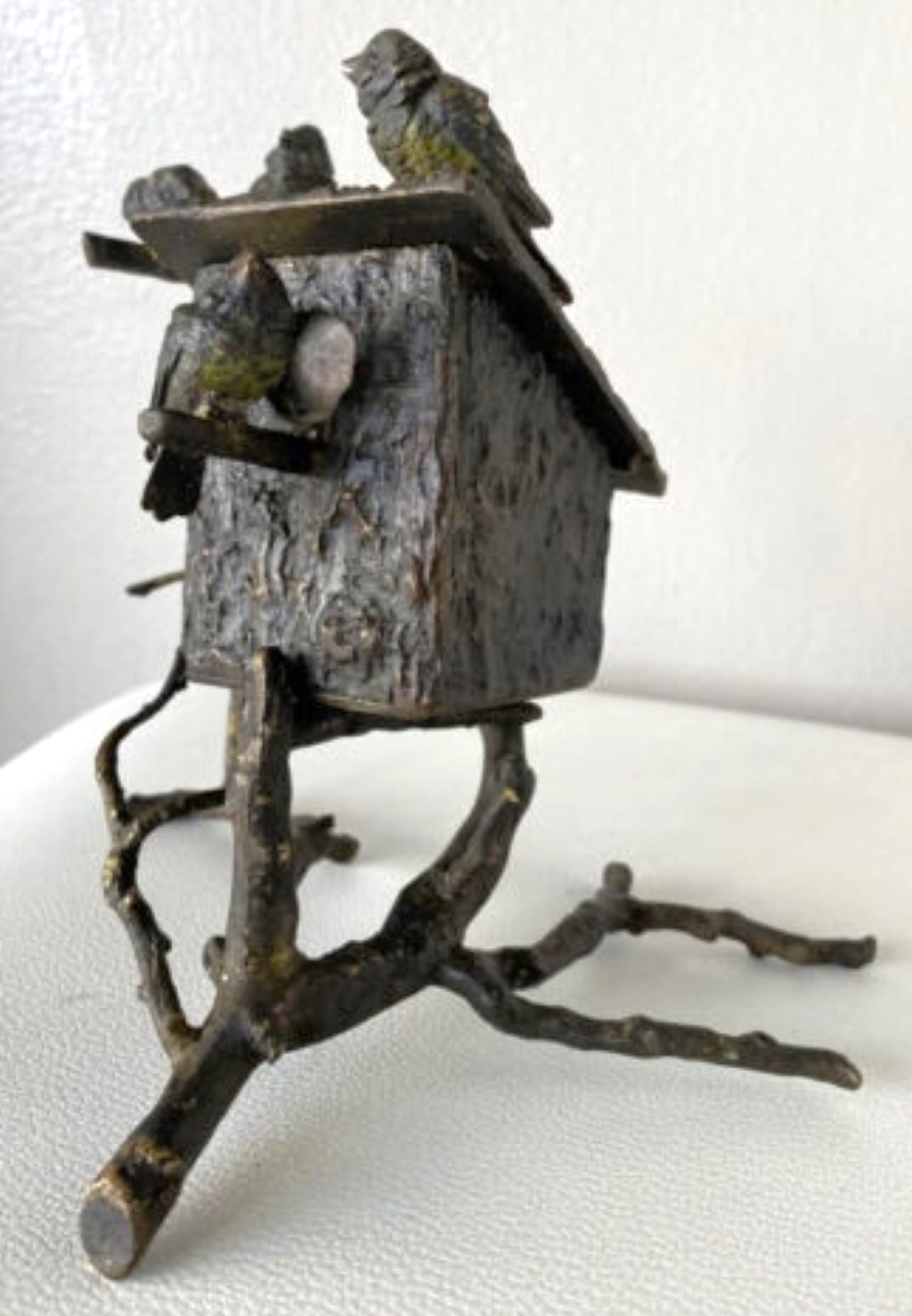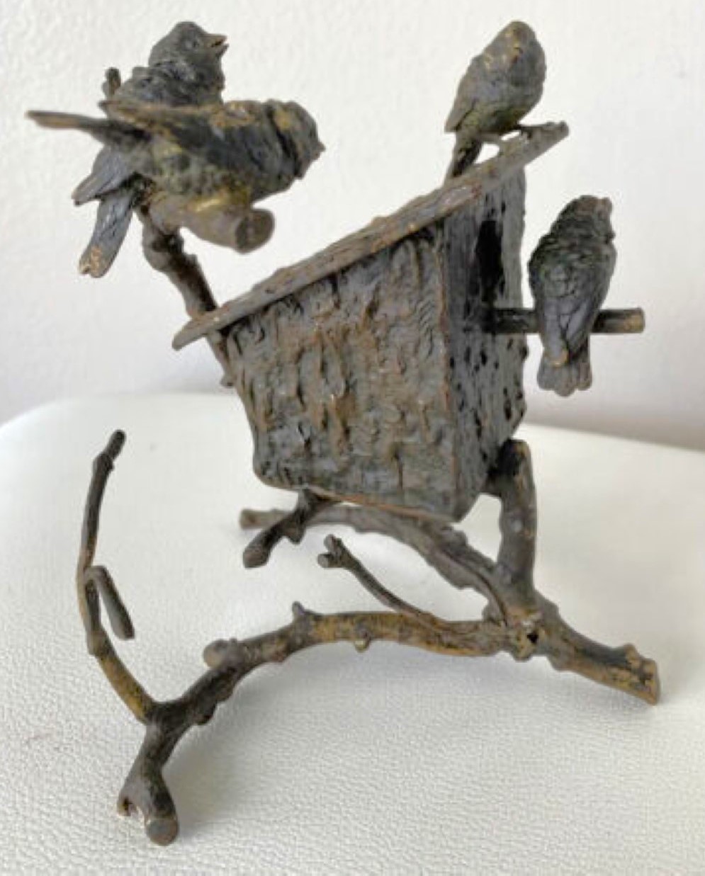 An Austrian bronze inkstand designed in the form of a birdhouse situated on a tree branch, with several birds flocking around it. The birdhouse has a textured, rustic appearance, and the roof is hinged, allowing it to open and provide access to the inkwell inside. This piece is attributed to Franz Bergman, a renowned artist known for his detailed bronze works. A similar model is referenced on page 253 of “Antique Vienna bronzes” by Joseph Zobel, published by Schiffer, and in “Bronzes de Vienne” by Ernest Hrabalek.