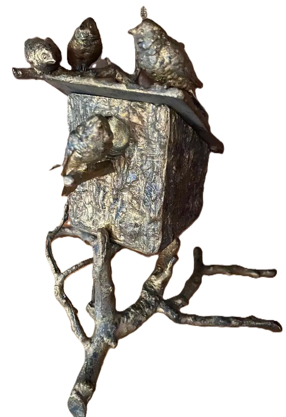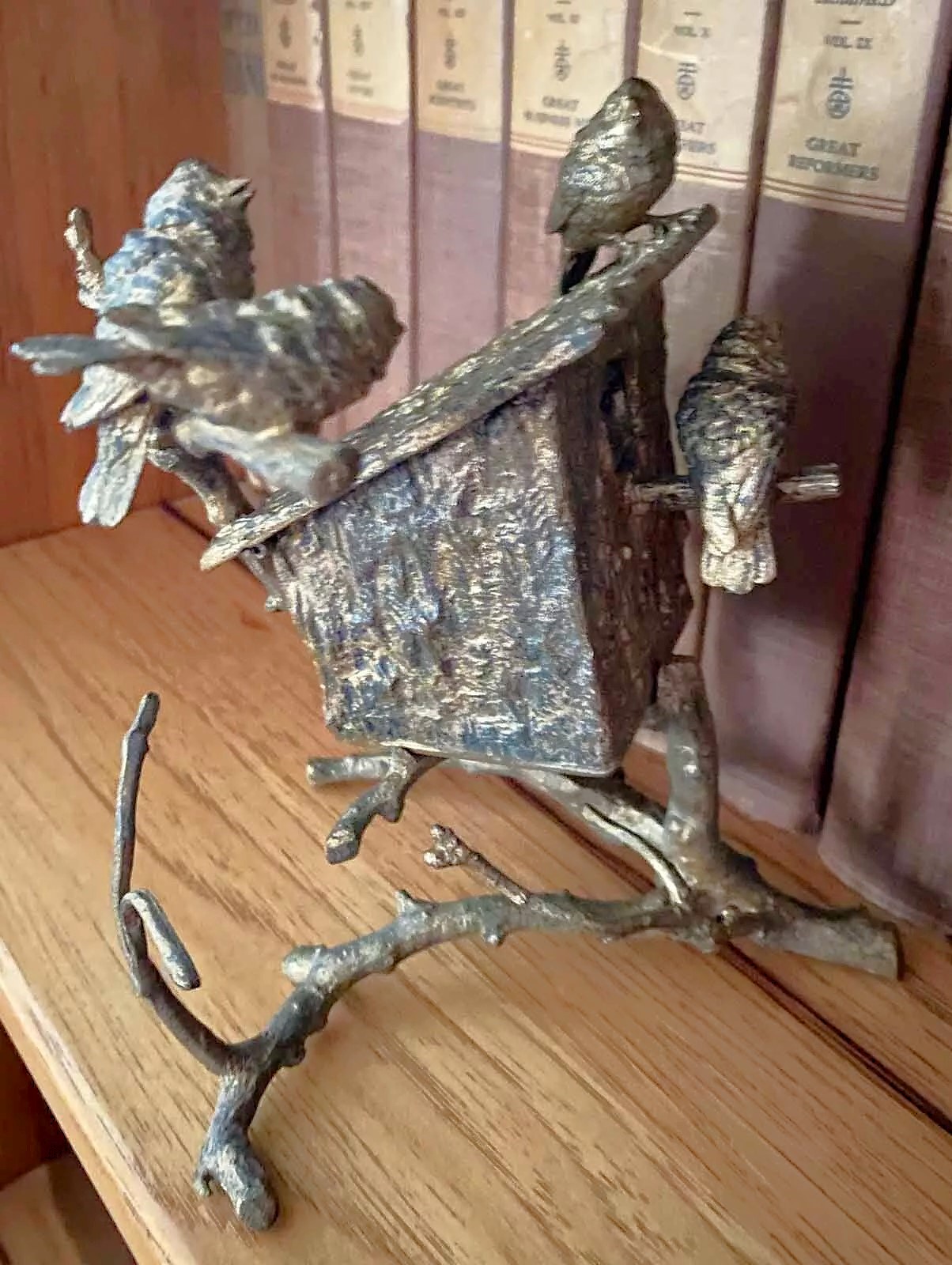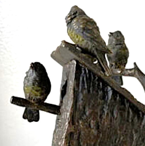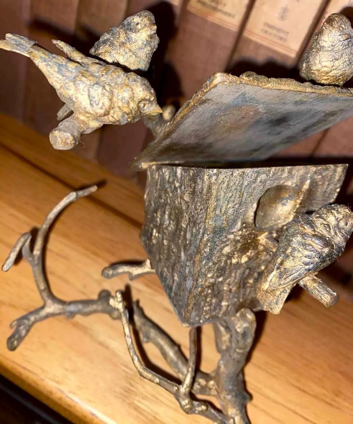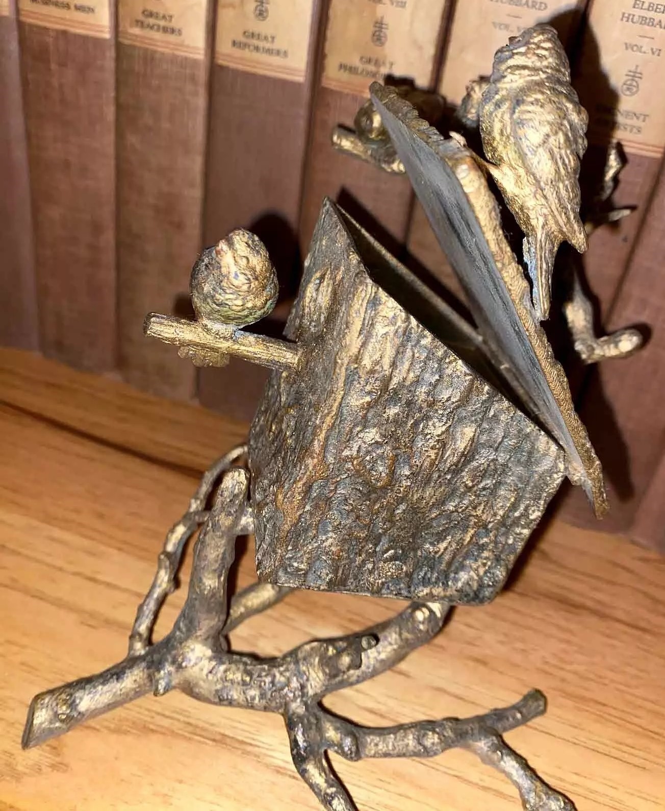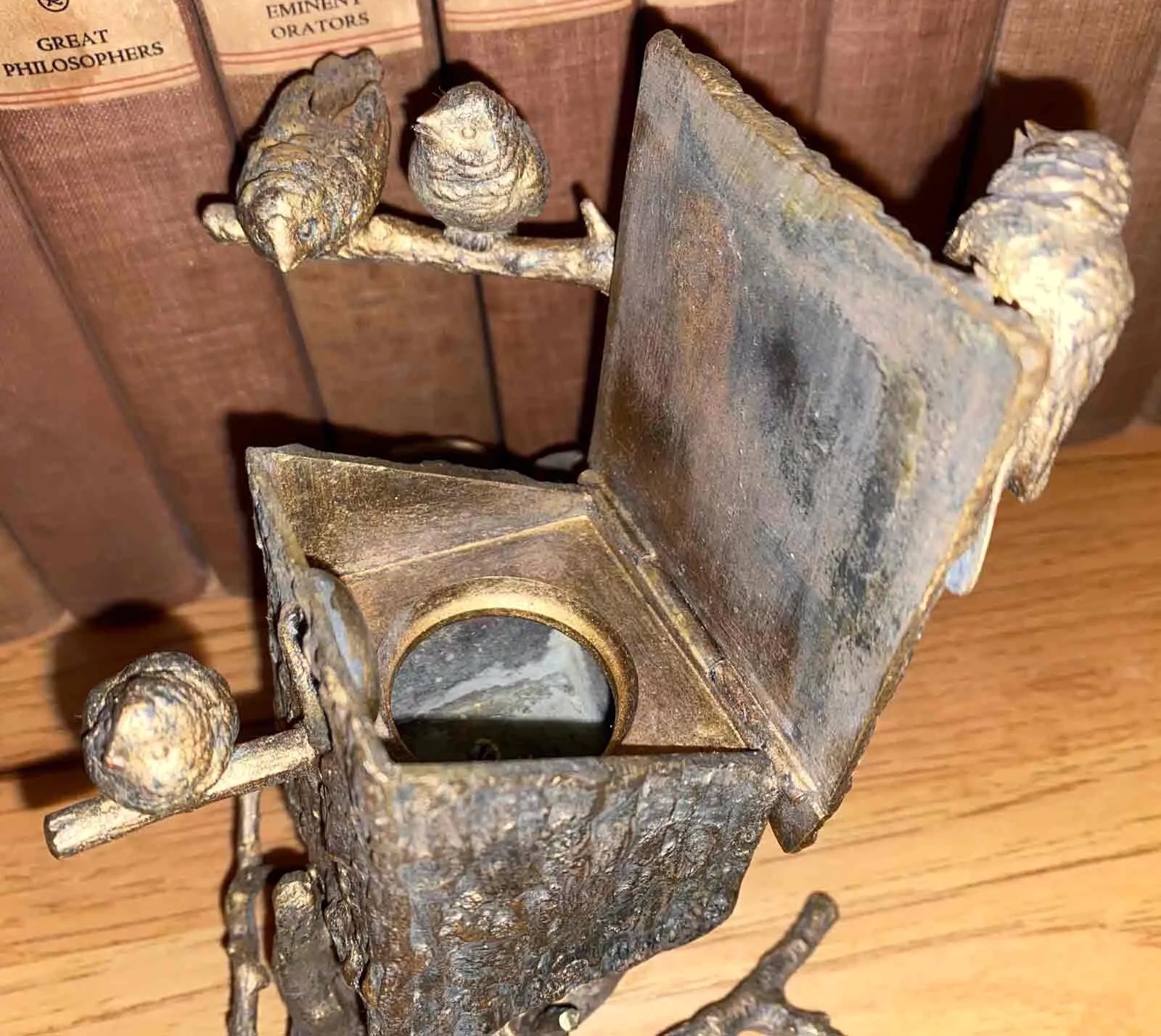 An Austrian bronze inkstand designed in the form of a birdhouse situated on a tree branch, with several birds flocking around it. The birdhouse has a textured, rustic appearance, and the roof is hinged, allowing it to open and provide access to the inkwell inside. This piece is attributed to Franz Bergman, a renowned artist known for his detailed bronze works. A similar model is referenced on page 253 of “Antique Vienna bronzes” by Joseph Zobel, published by Schiffer, and in “Bronzes de Vienne” by Ernest Hrabalek.