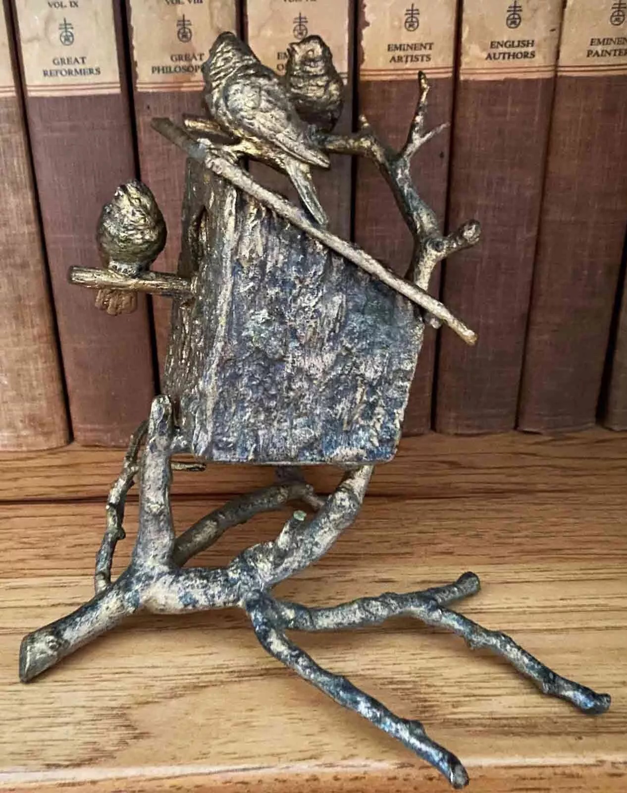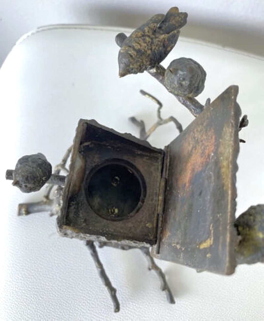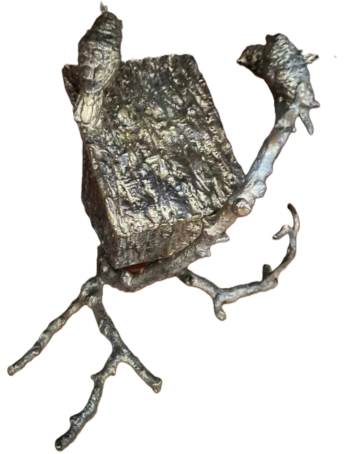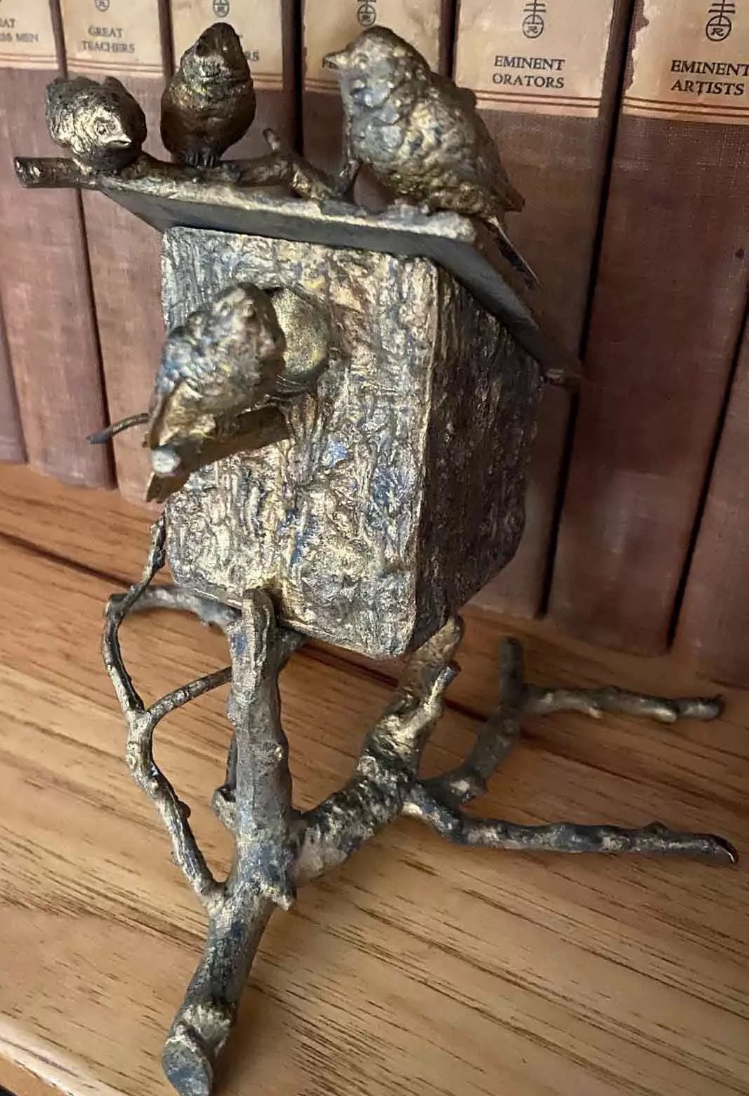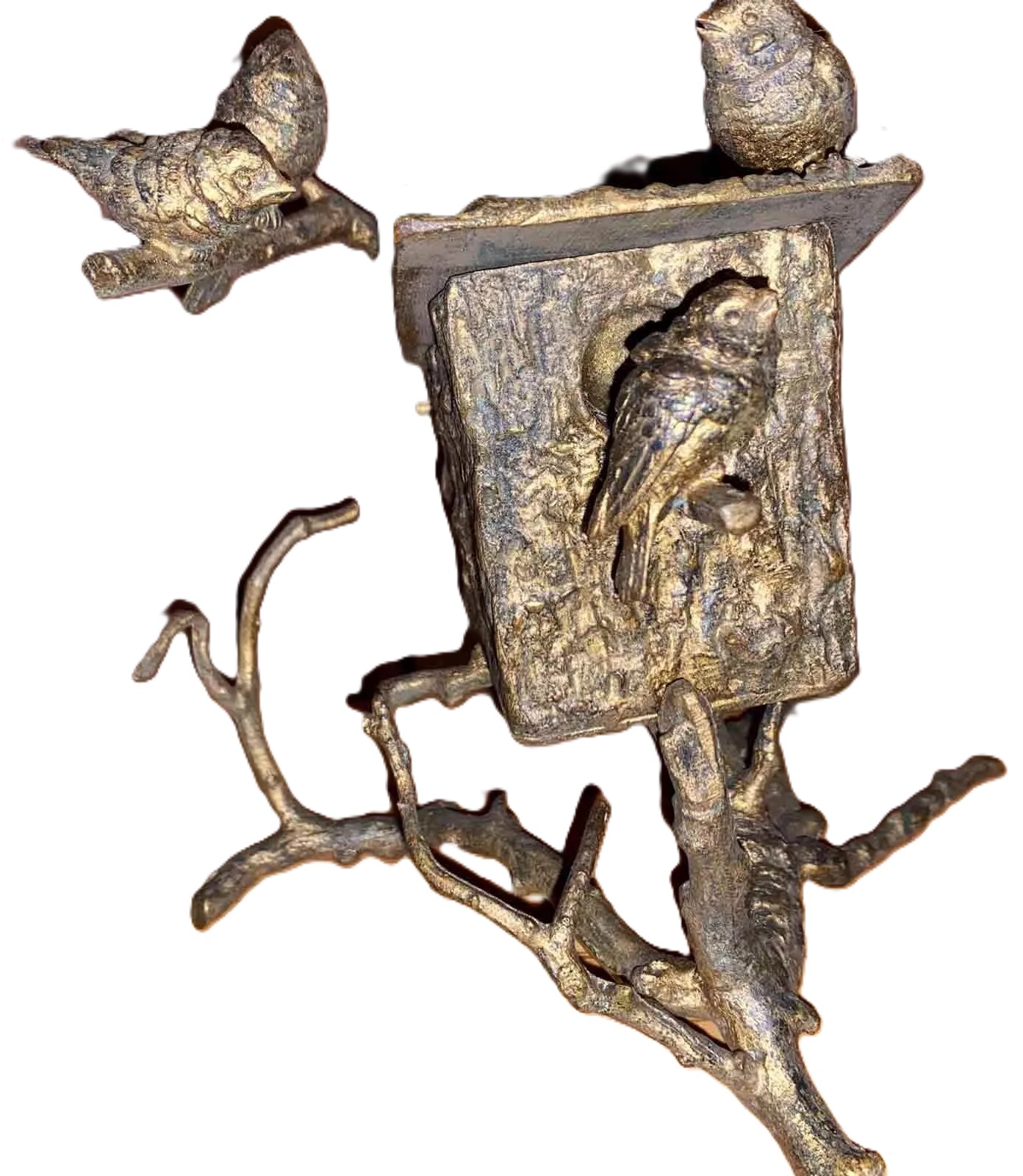 An Austrian bronze inkstand designed in the form of a birdhouse situated on a tree branch, with several birds flocking around it. The birdhouse has a textured, rustic appearance, and the roof is hinged, allowing it to open and provide access to the inkwell inside. This piece is attributed to Franz Bergman, a renowned artist known for his detailed bronze works. A similar model is referenced on page 253 of “Antique Vienna bronzes” by Joseph Zobel, published by Schiffer, and in “Bronzes de Vienne” by Ernest Hrabalek.