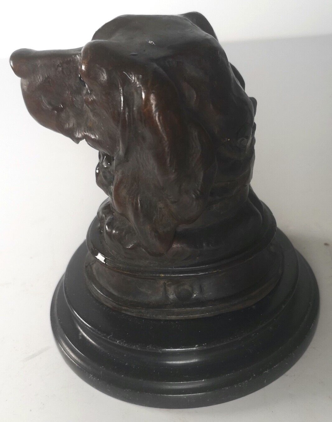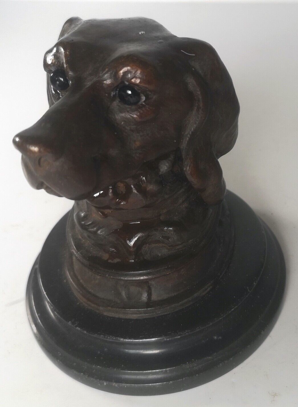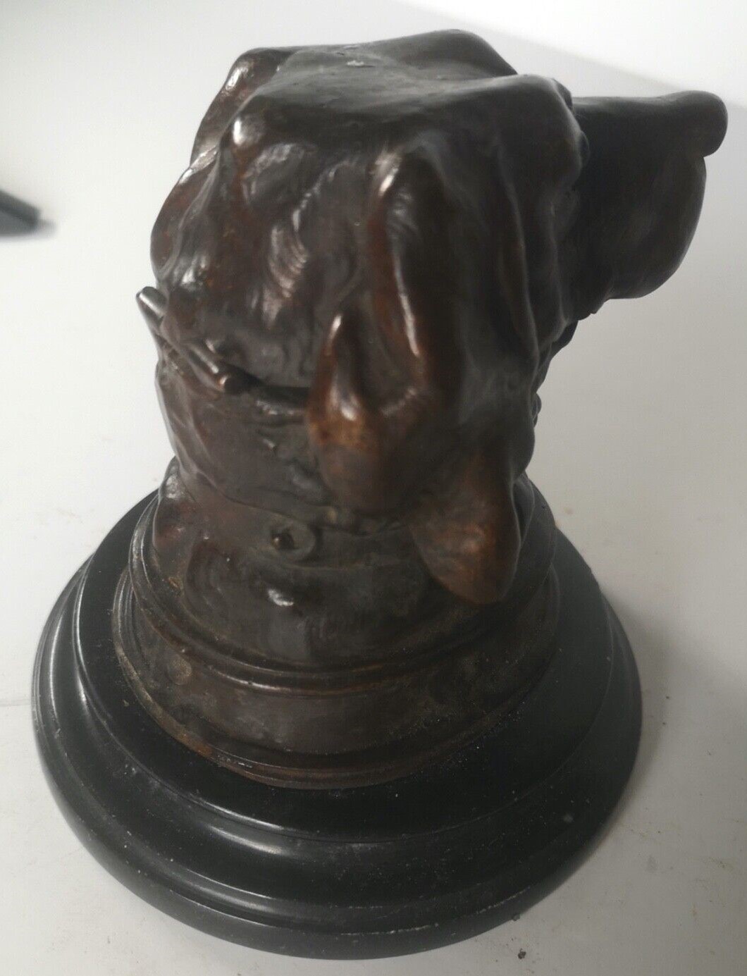 Late 19th century bronze retriever dog’s head inkwell. Great quality and well molded, standing on a black stone base.