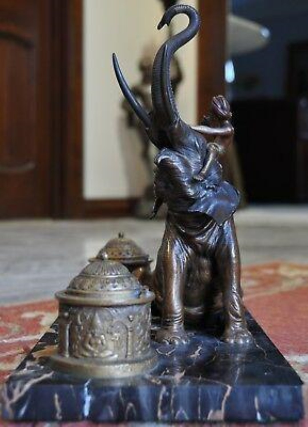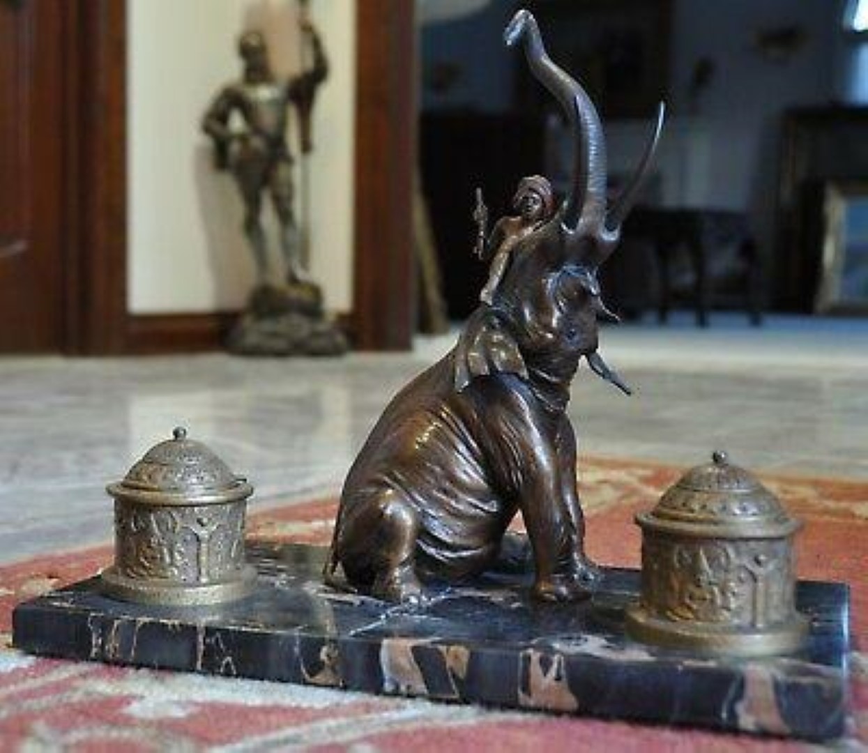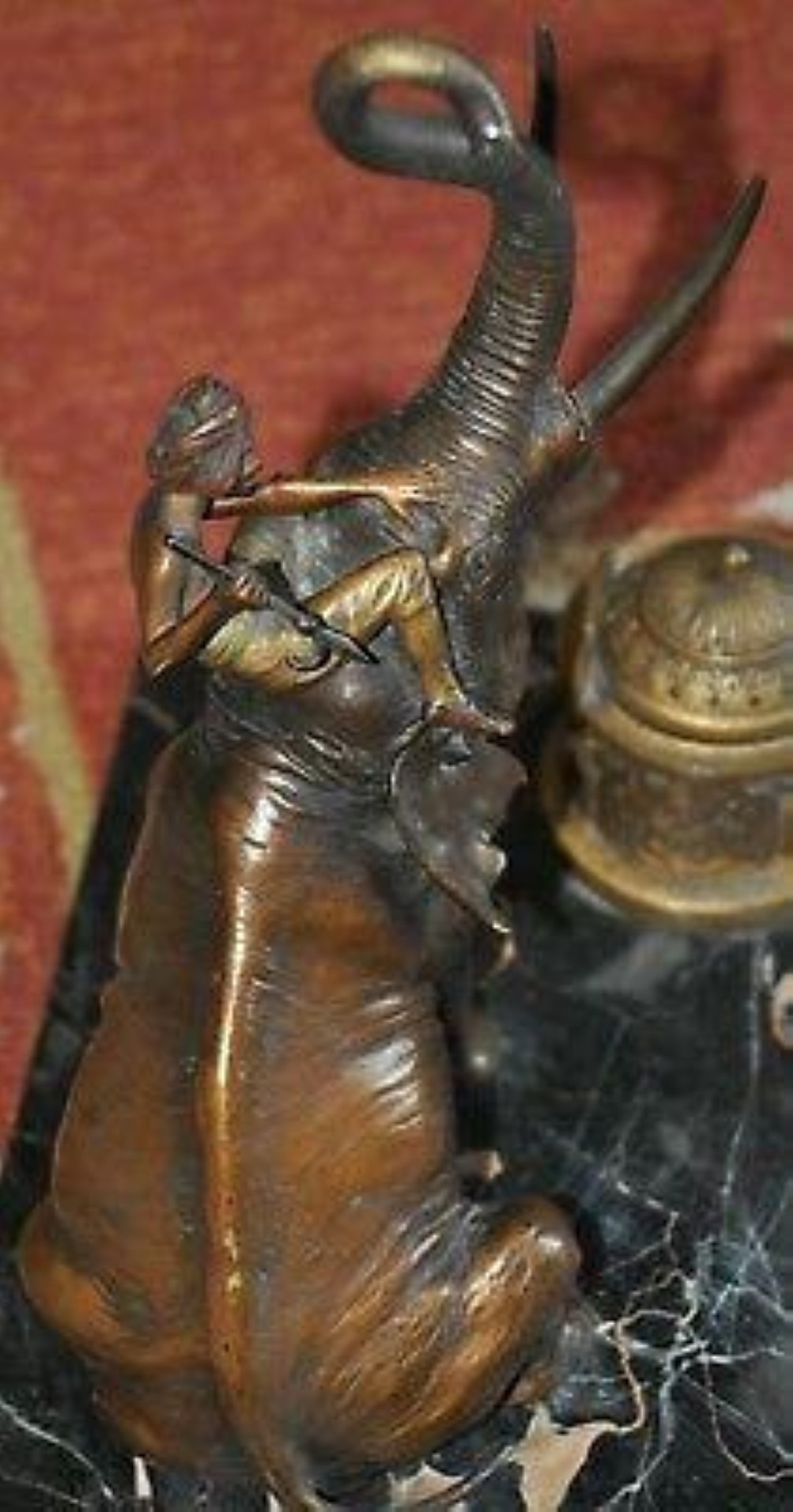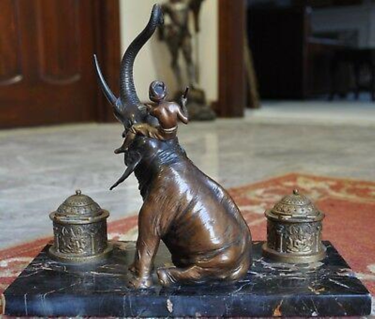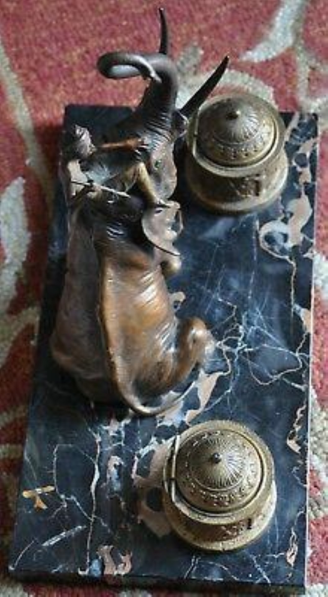 Bronze elephant with rider on a marble base double inkstand. The mark on the elephant’s belly with letter “B” in an urn-shaped cartouche is the mark of the Franz Bergmann foundry.