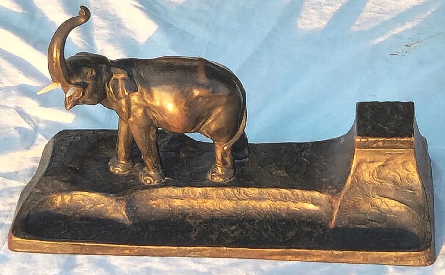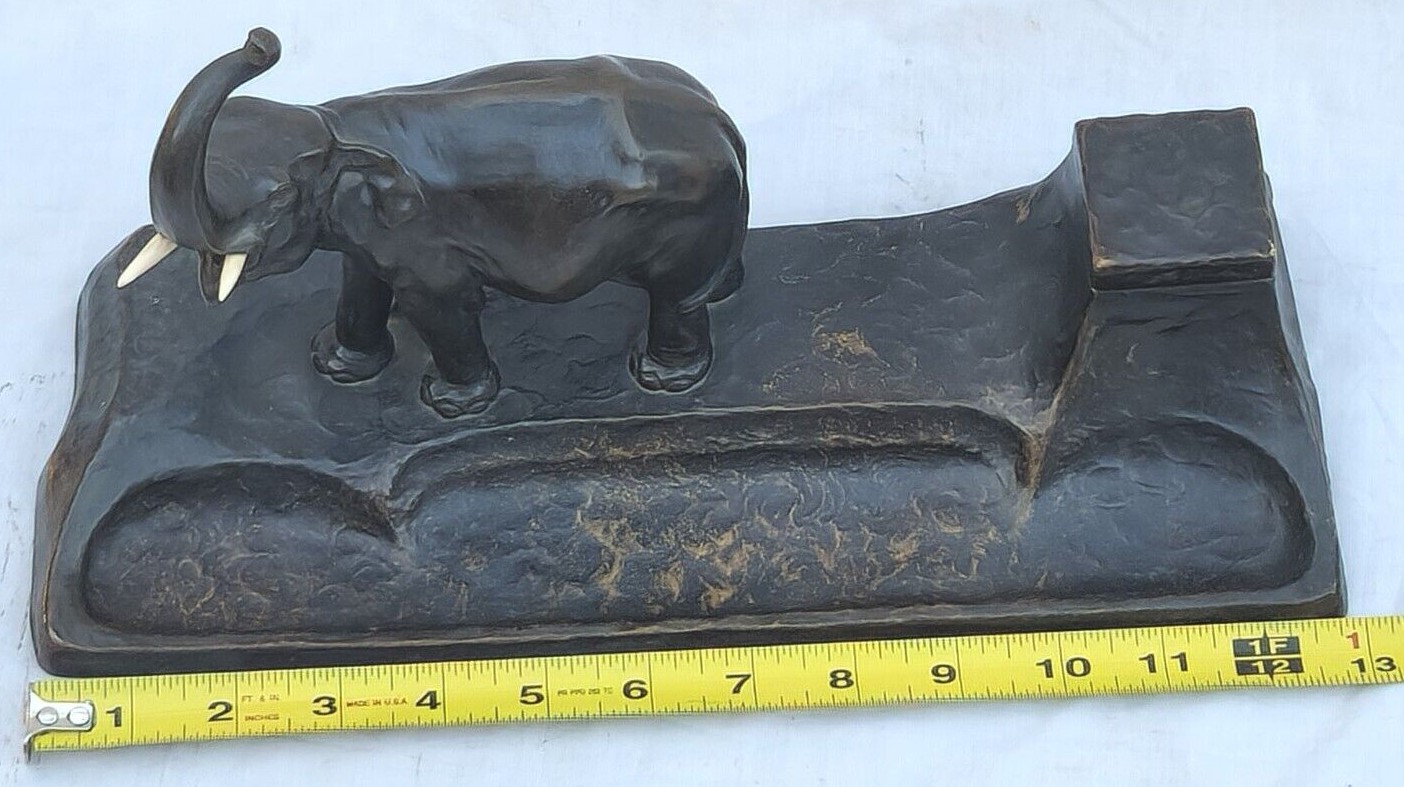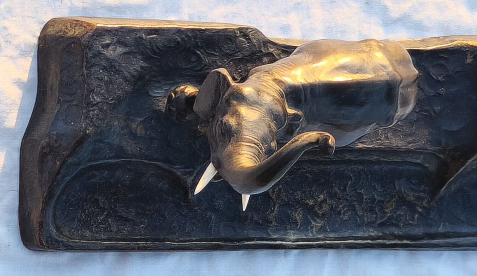 An Austrian bronze inkstand featuring a cast elephant with ivory tusks. In the front is a pen tray molded as a watering pool. A hinged lid covers the inkwell (insert missing). Marked “Made in Austria.”