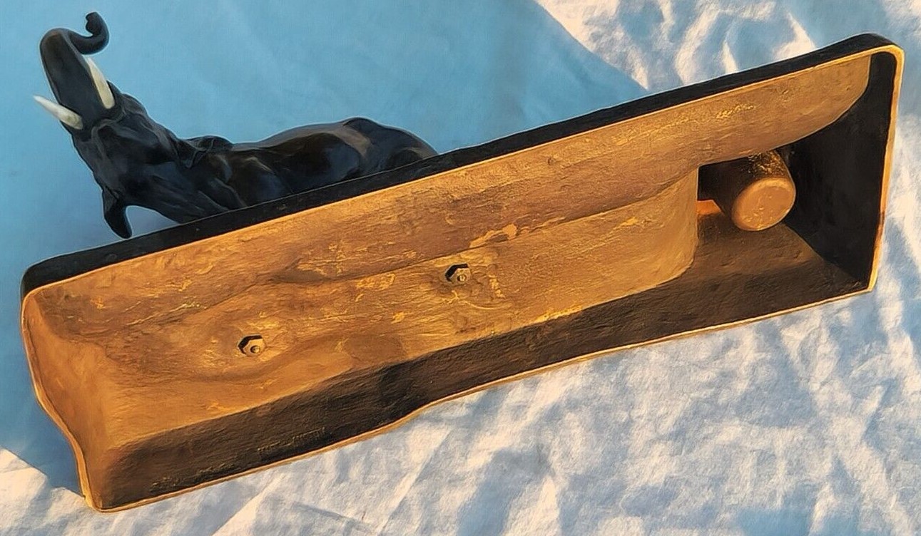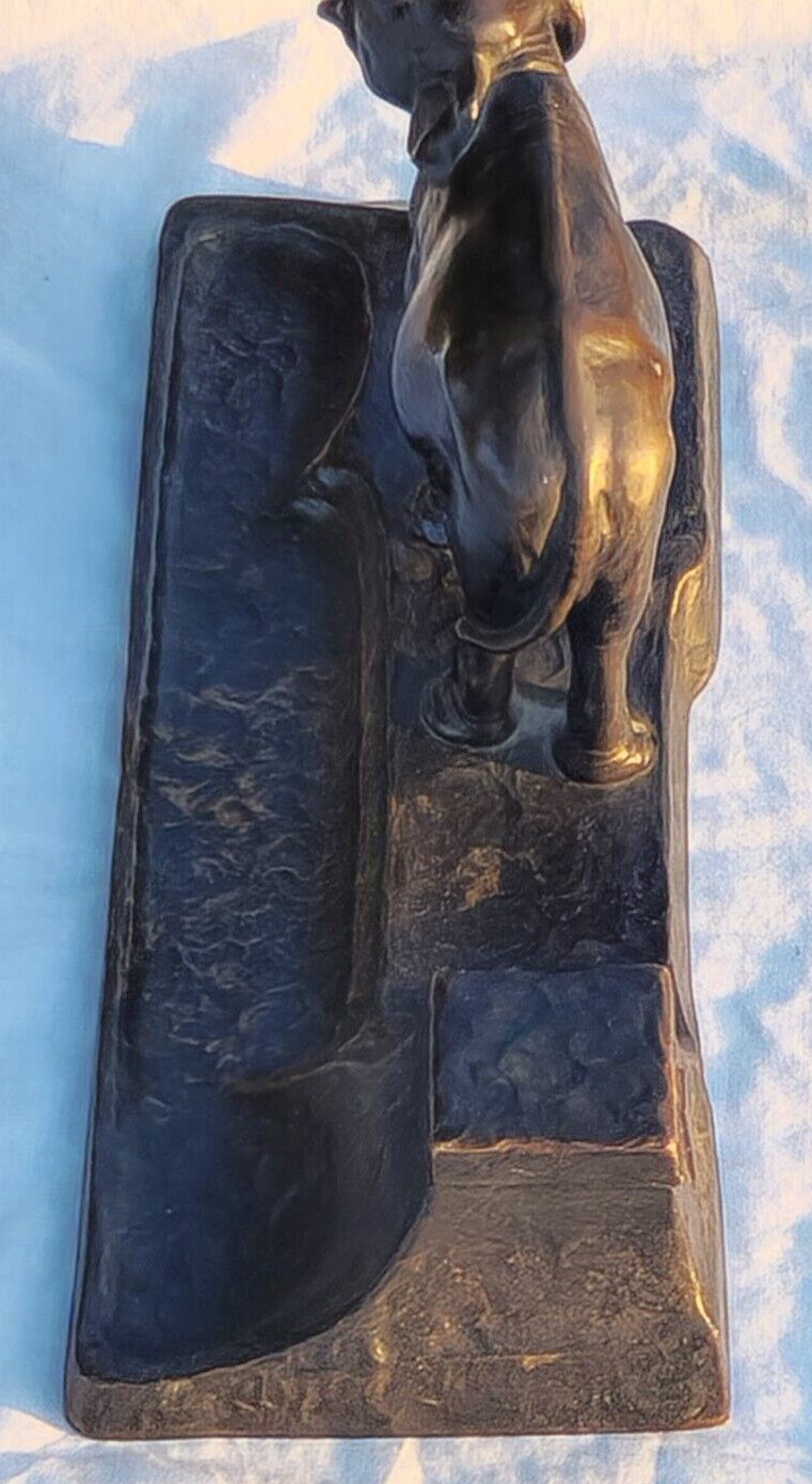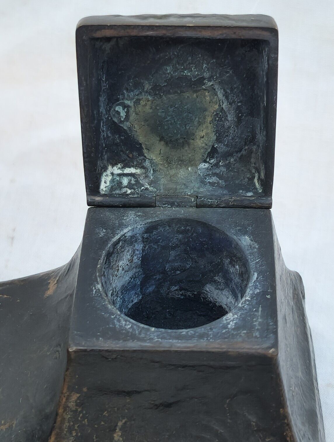 An Austrian bronze inkstand featuring a cast elephant with ivory tusks. In the front is a pen tray molded as a watering pool. A hinged lid covers the inkwell (insert missing). Marked “Made in Austria.”