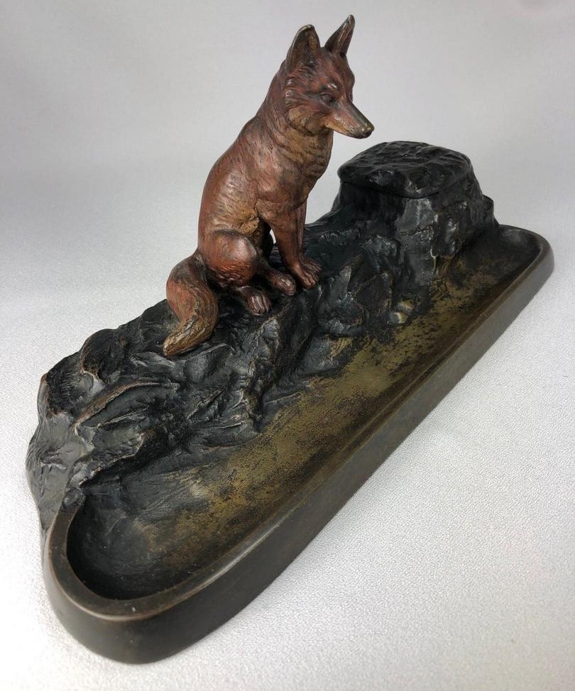 A cold painted bronze fox sits on a rocky outcropping which incorporates the inkwell and a pen tray, both integrated into the piece. There are two signatures – one reads KLAP while the second is indecipherable.